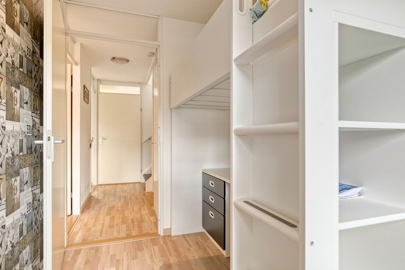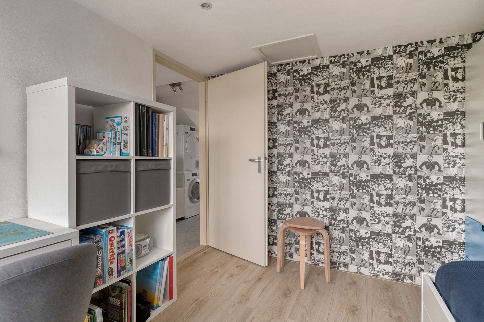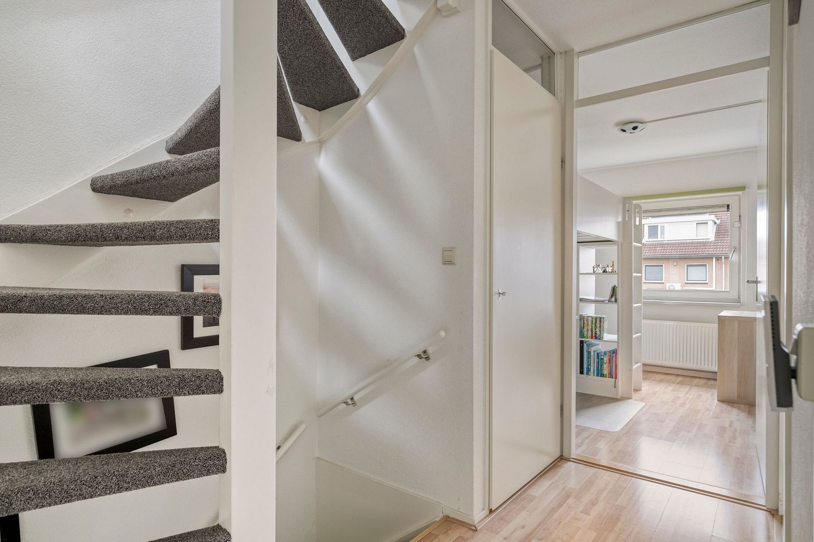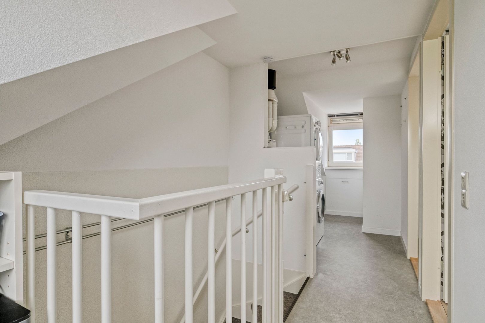 Ruime overloop met opstelplaats van de cv-ketel en de aansluitingen van de wasmachine en droger.