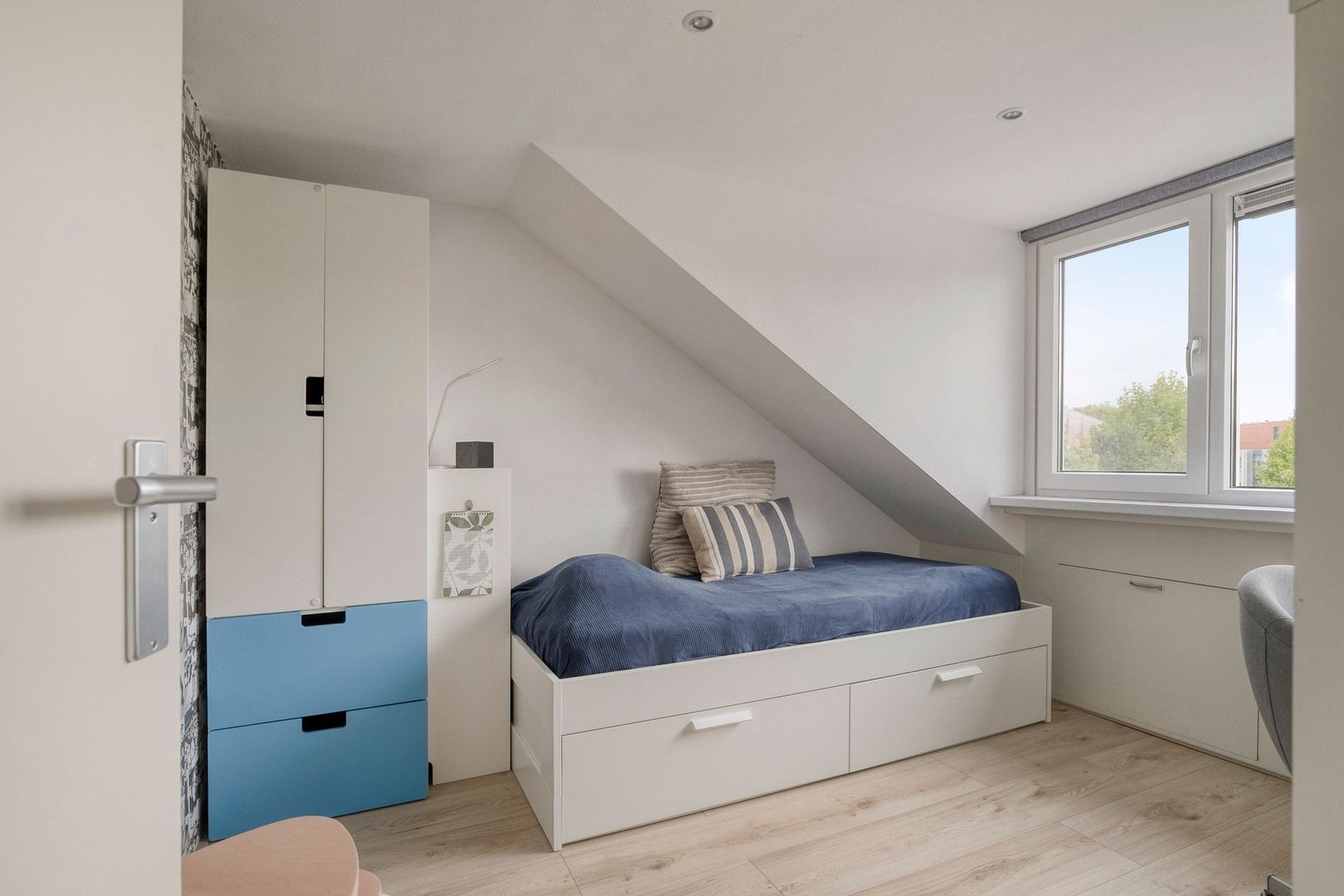 Slaapkamer 5 (ca 3.20 x 2.96 m2) aan de voorzijde, met knieschotten.