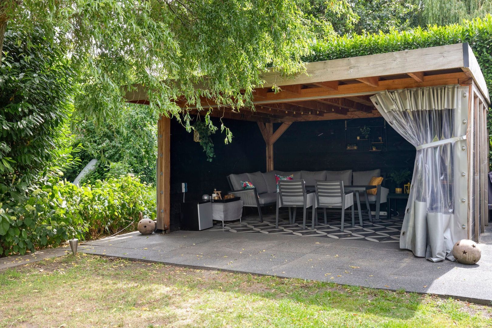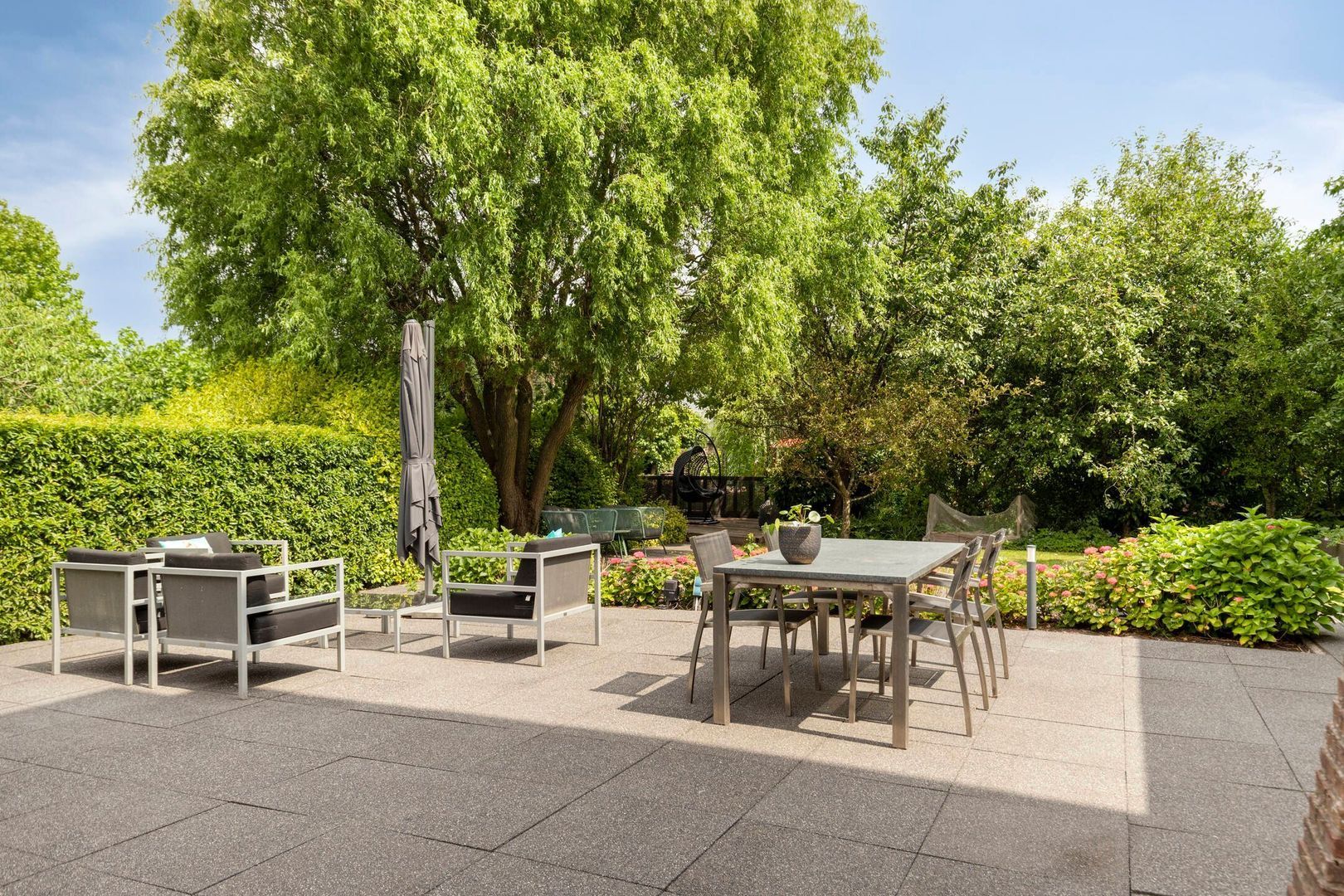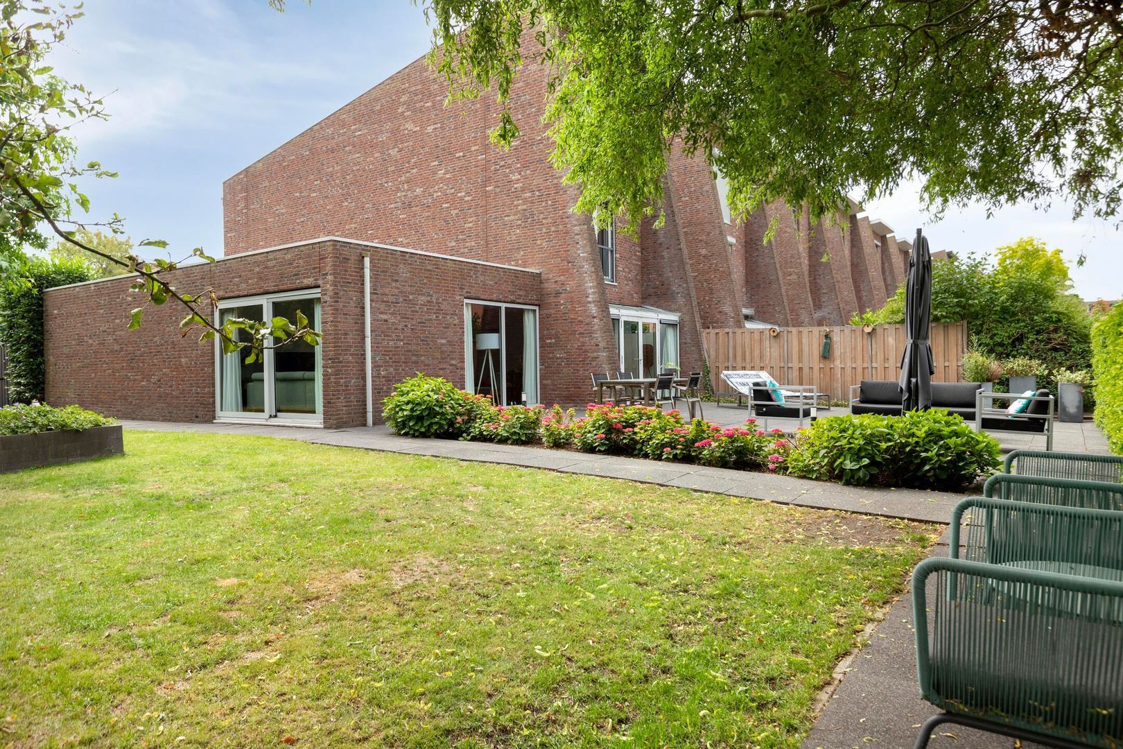 De zonnige achtertuin op het westen is fraai aangelegd en beschikt over meerdere terrassen, een stijlvolle overkapping en een vlonder aan de singel — een heerlijke plek om te ontspannen tot in de late uurtjes. Aan de voorzijde is parkeergelegenheid voor drie auto’s op eigen terrein en directe toegang tot de garage.