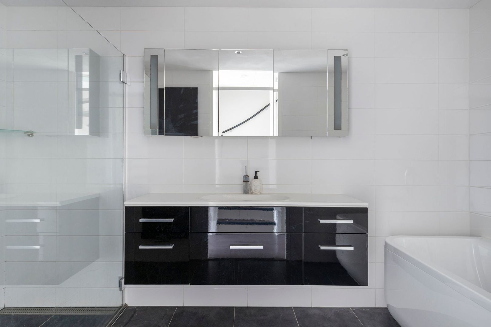 Modern bathroom with bathtub, shower, washbasin unit, underfloor heating and designer radiator