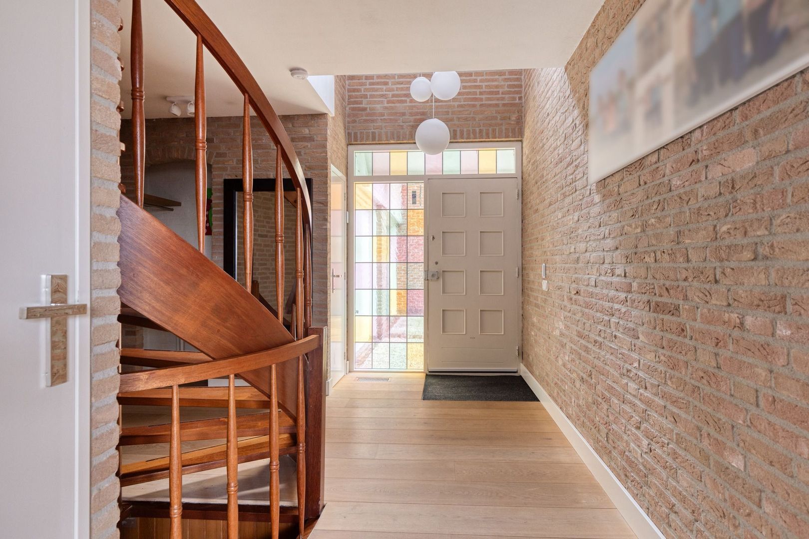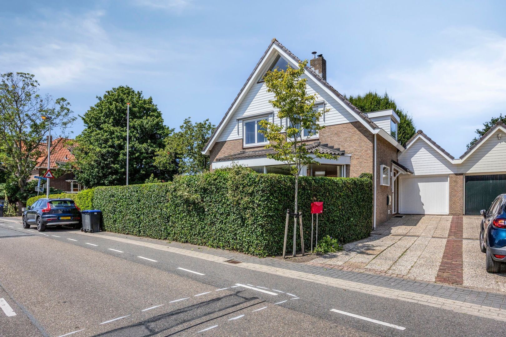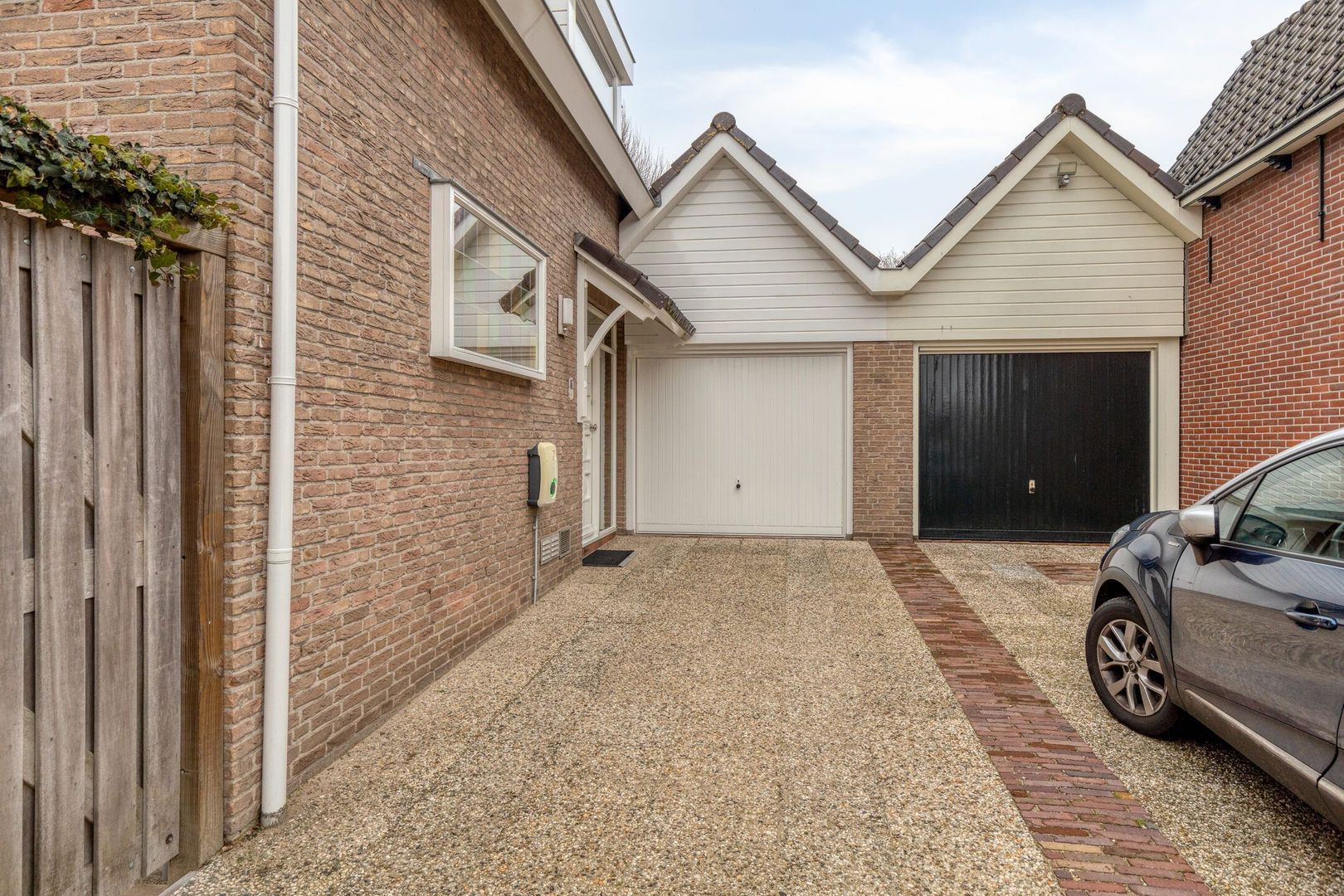Via de ruime oprit met parkeergelegenheid voor meerdere auto’s, inclusief een laadpunt, en toegang tot de garage waar zich de aansluitingen voor de wasmachine en droger bevinden, kom je bij de entree.