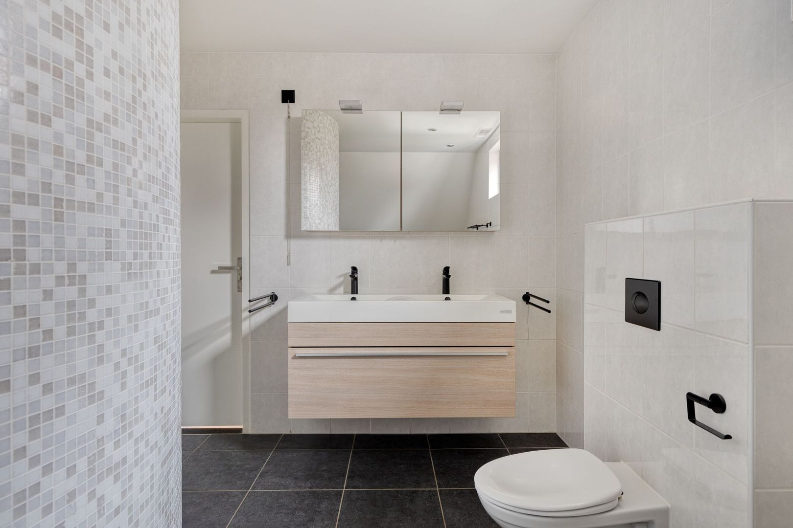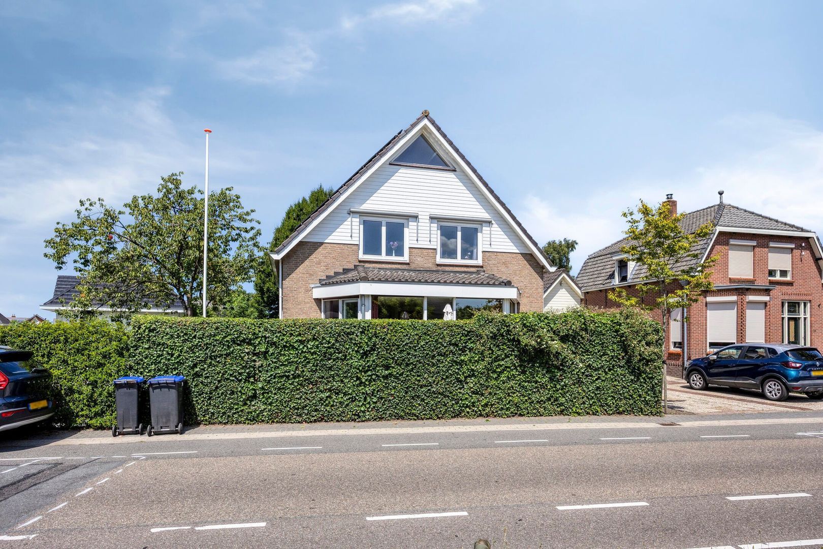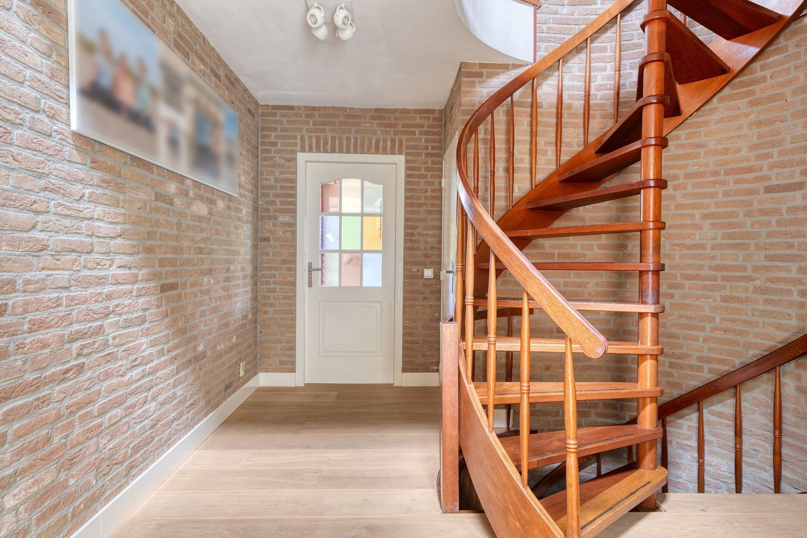 Via de ruime oprit met parkeergelegenheid voor meerdere auto’s, inclusief een laadpunt, en toegang tot de garage waar zich de aansluitingen voor de wasmachine en droger bevinden, kom je bij de entree.