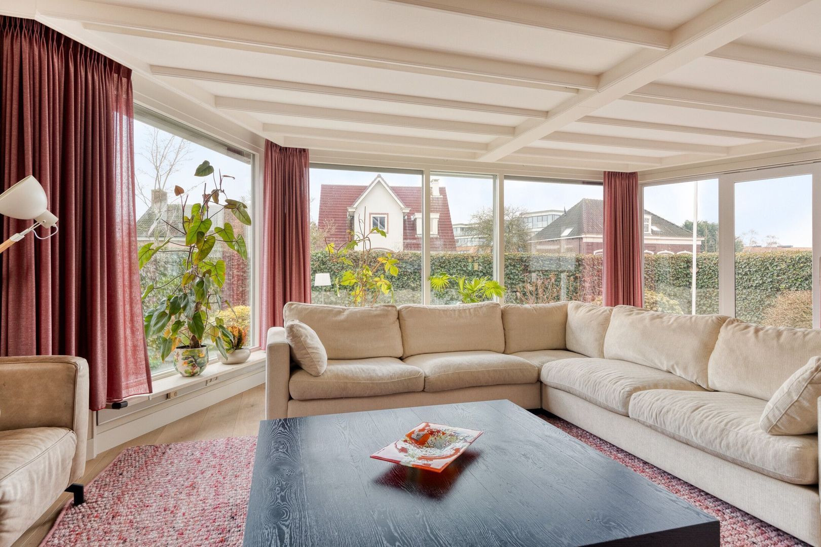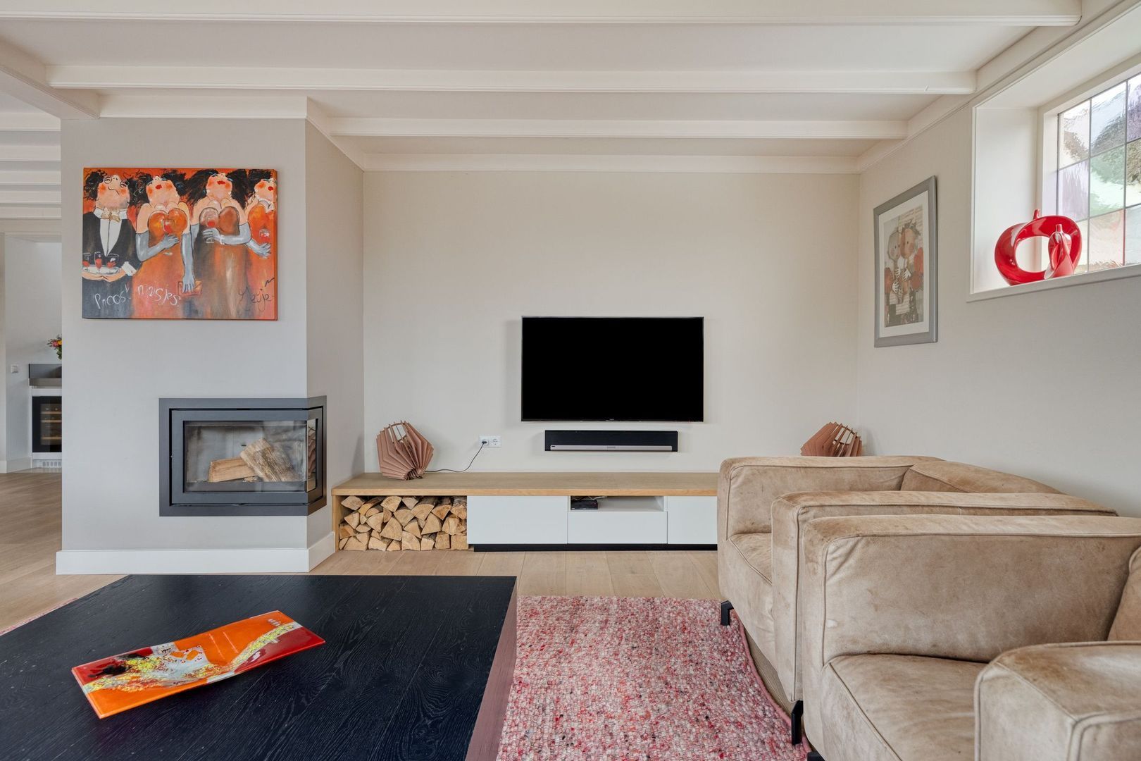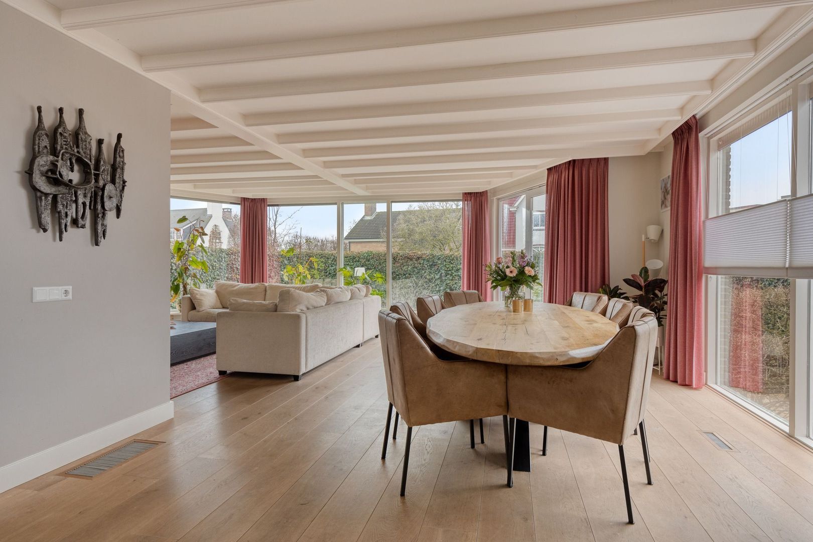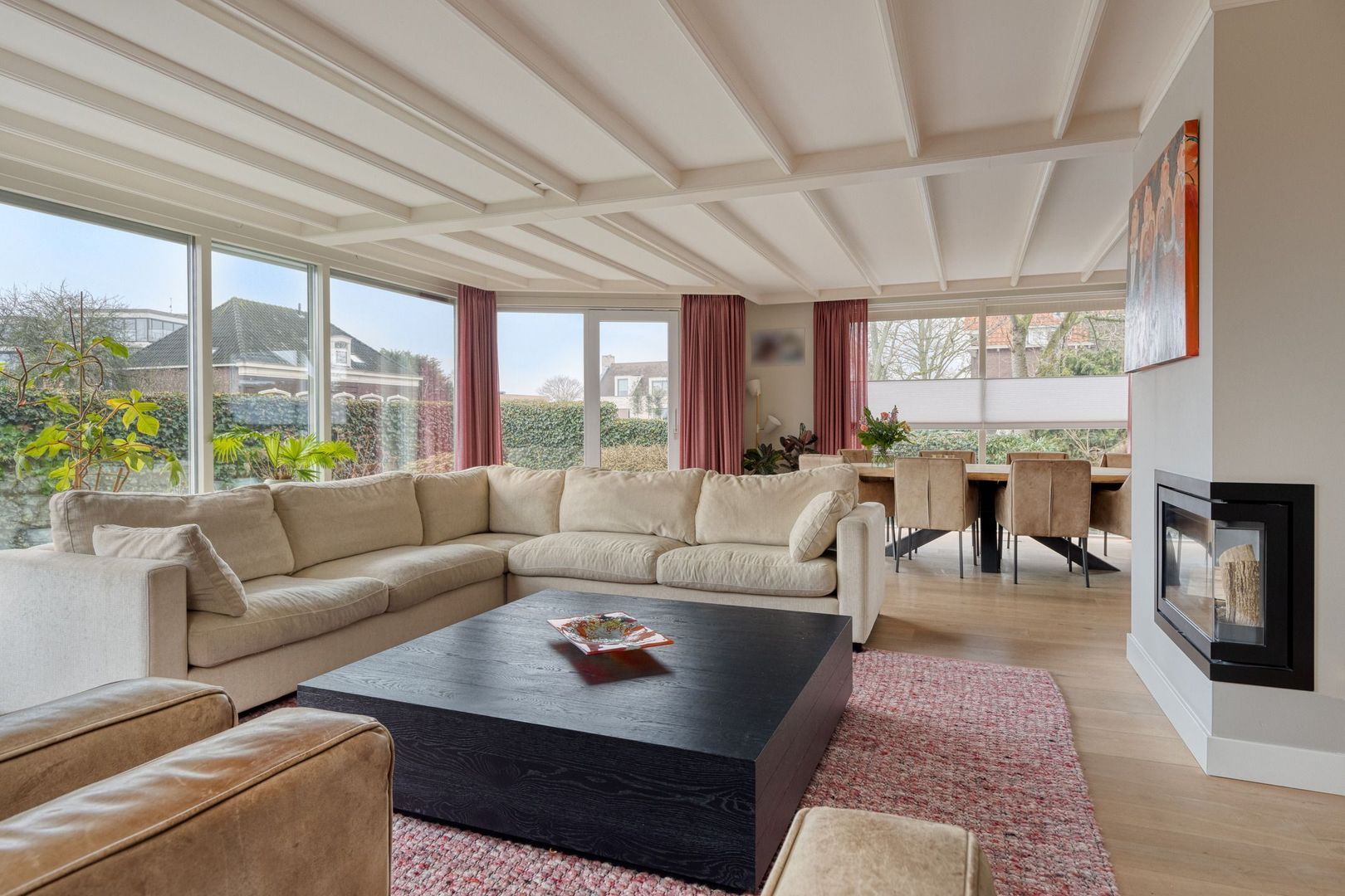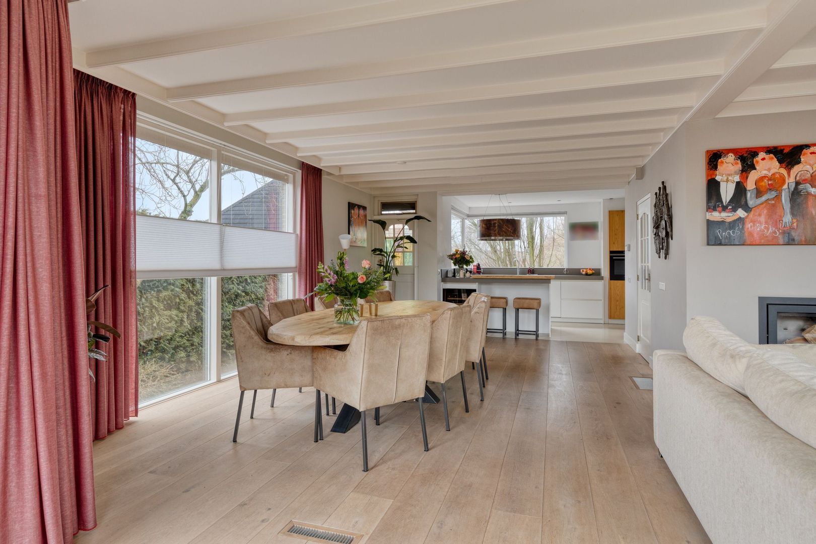 De woonkamer is sfeervol, opvallend licht en heerlijk ruim dankzij de grote raampartijen en de serre. Aan de voorzijde bevindt zich het zitgedeelte met open haard en een fraaie houten vloer, wat zorgt voor een warme en uitnodigende uitstraling. Via de schuifpui is er directe toegang tot de voortuin. Daarnaast zijn er elektrische rolluiken en zonwering aanwezig.