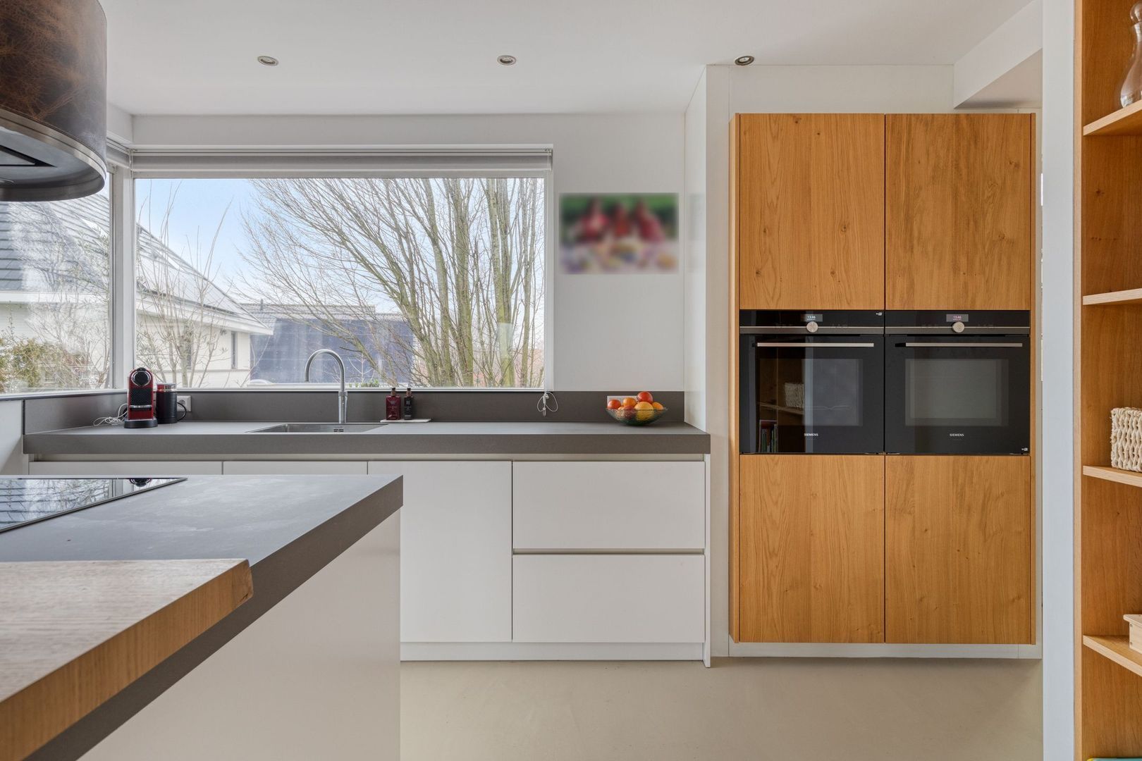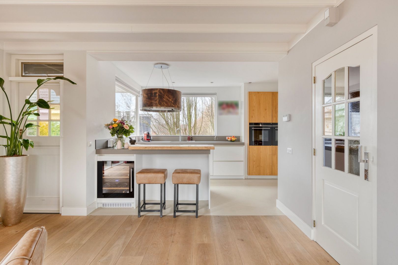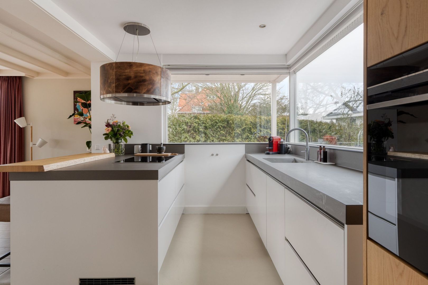 Aan de achterzijde vind je de royale leefkeuken met een stijlvol kookeiland en diverse inbouwapparatuur, waaronder een vaatwasser, klimaatkast, inductiekookplaat, afzuigkap, Quooker, stoomoven, combi-oven, koelkast en vriezer.