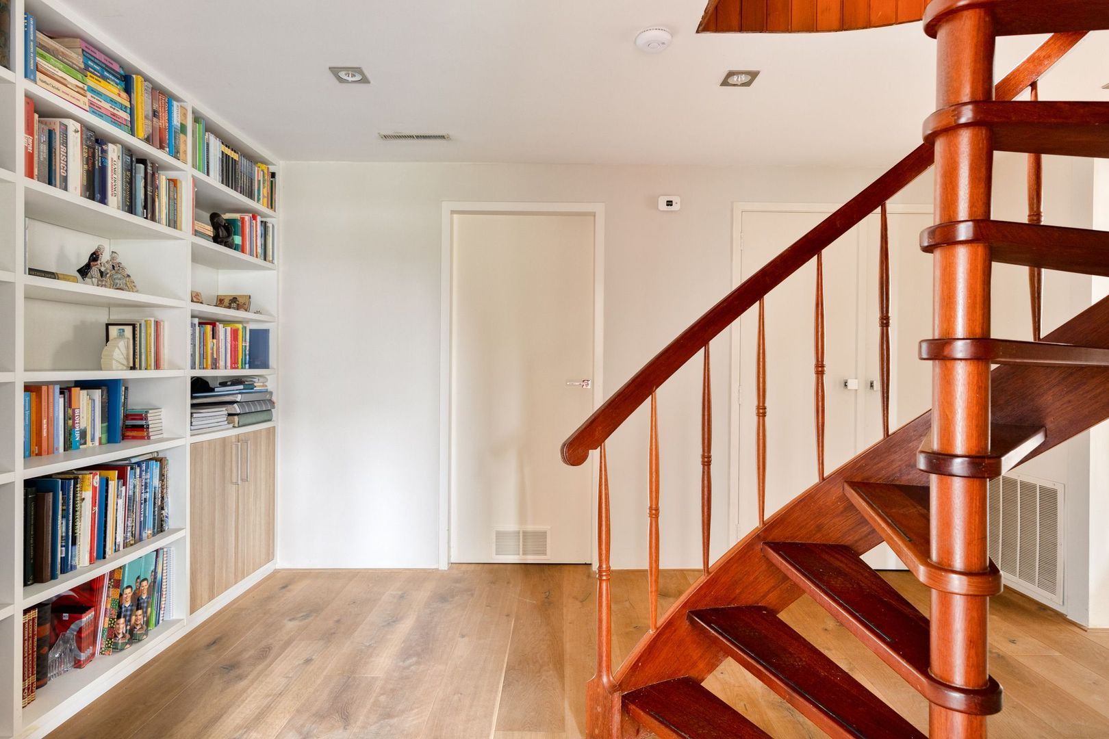 Via een vaste trap bereik je het souterrain. Hier bevinden zich een overloop met toilet, een vaste boekenkast, de technische ruimte en twee slaapkamers. Het souterrain is voorzien van een houten vloer.