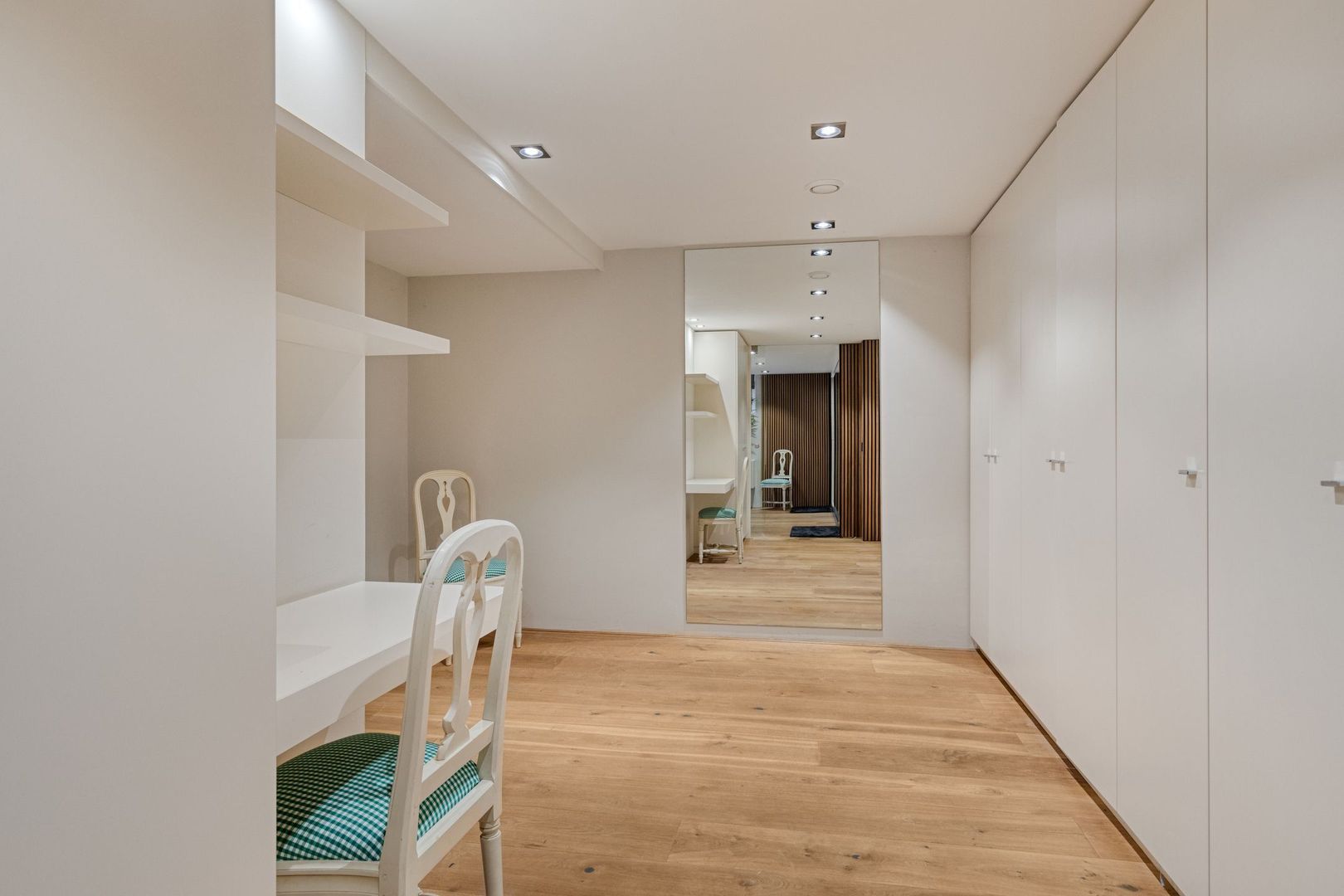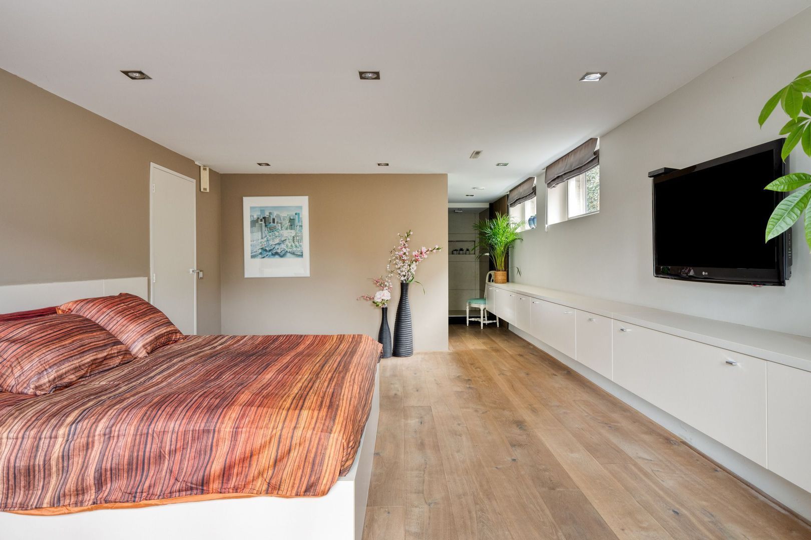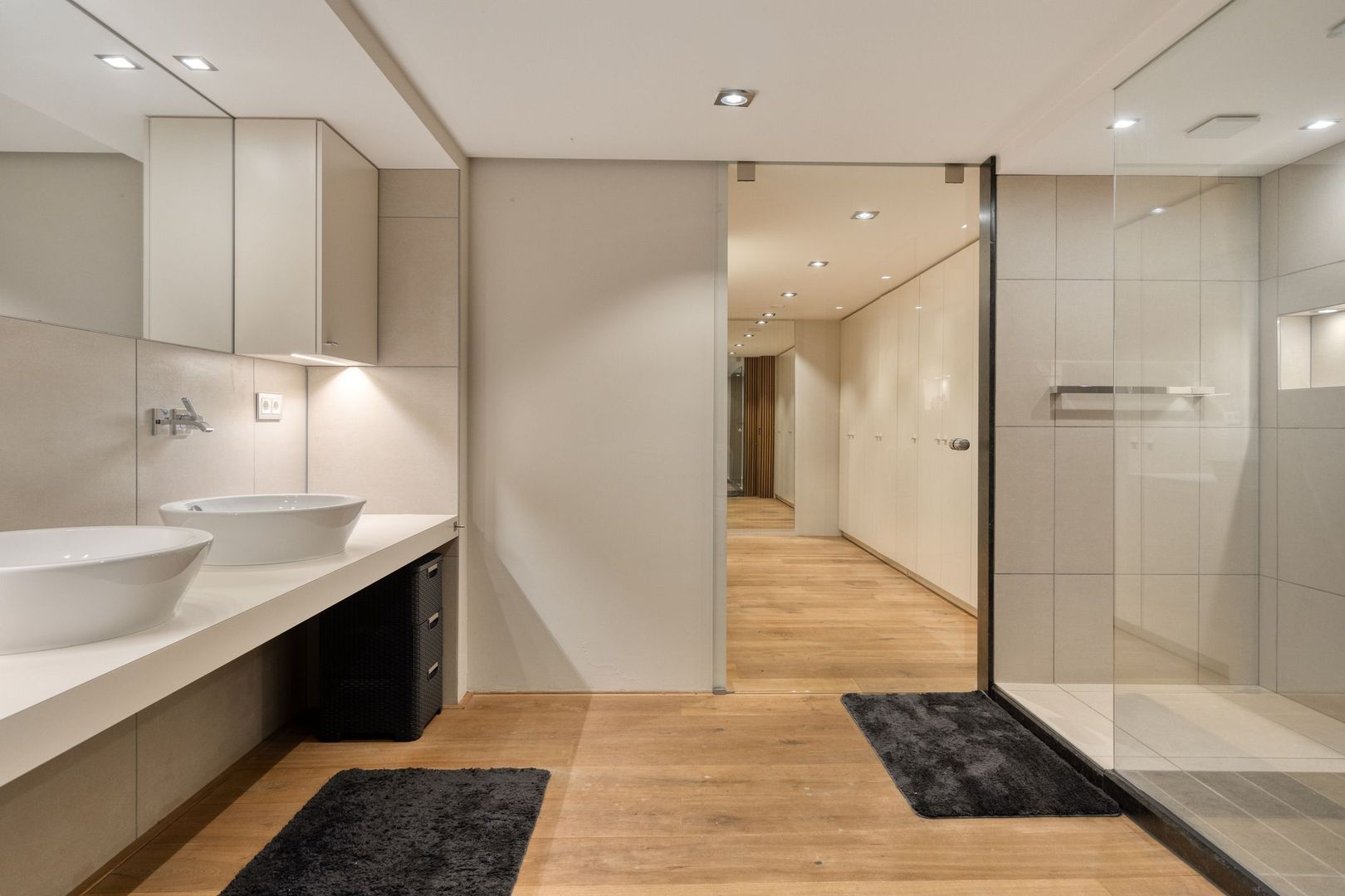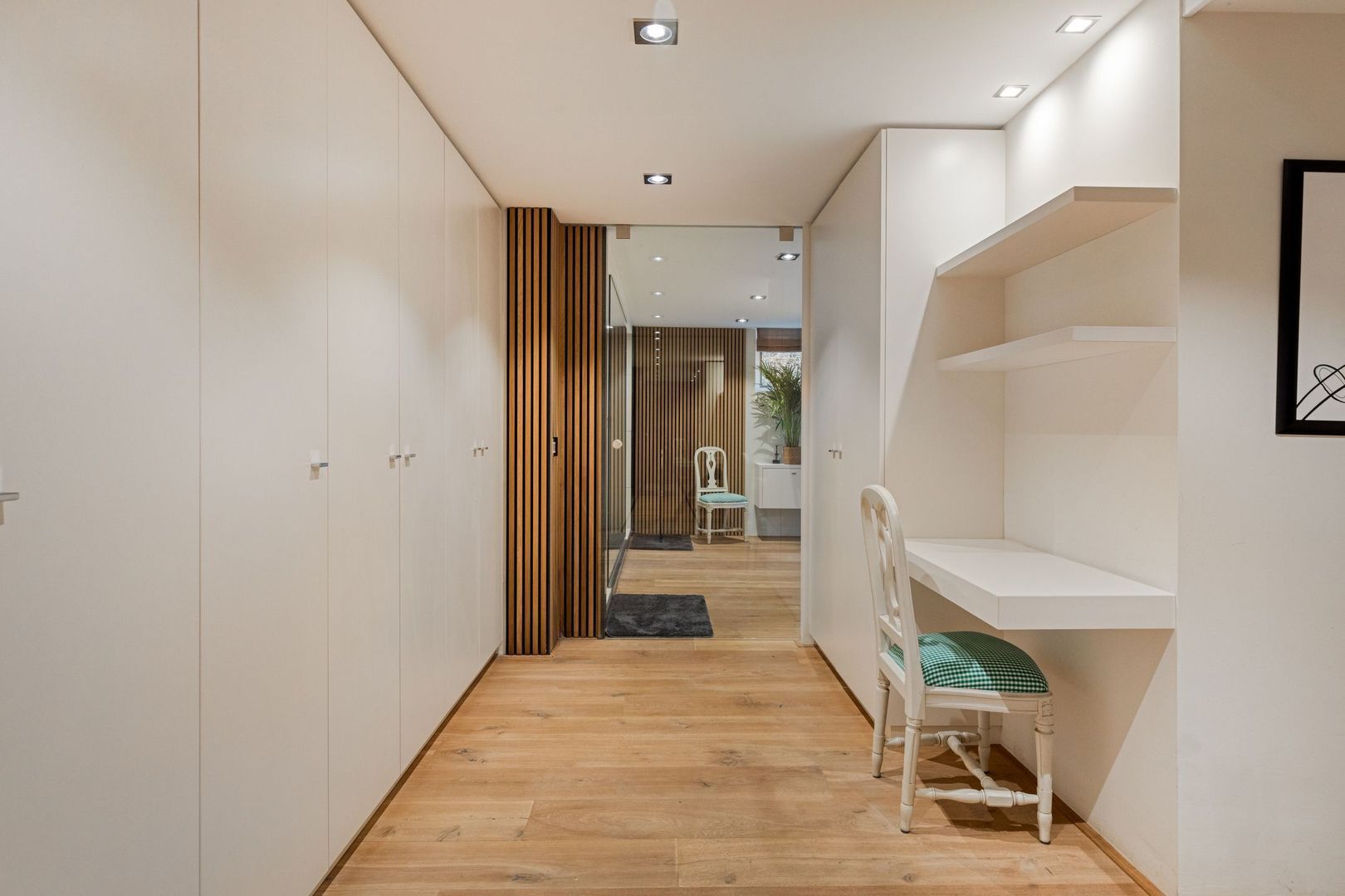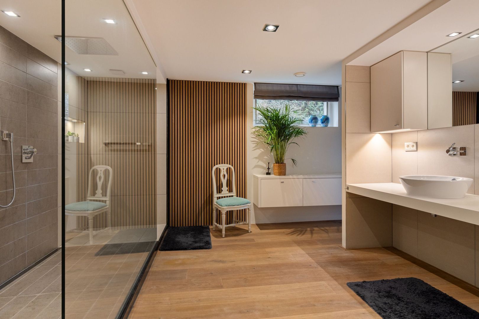 De royale ouderslaapkamer heeft directe toegang tot de achtertuin en de tweede badkamer, uitgerust met een dubbele douche en dubbele wastafel. Aansluitend bevindt zich een ruime walk-in closet.