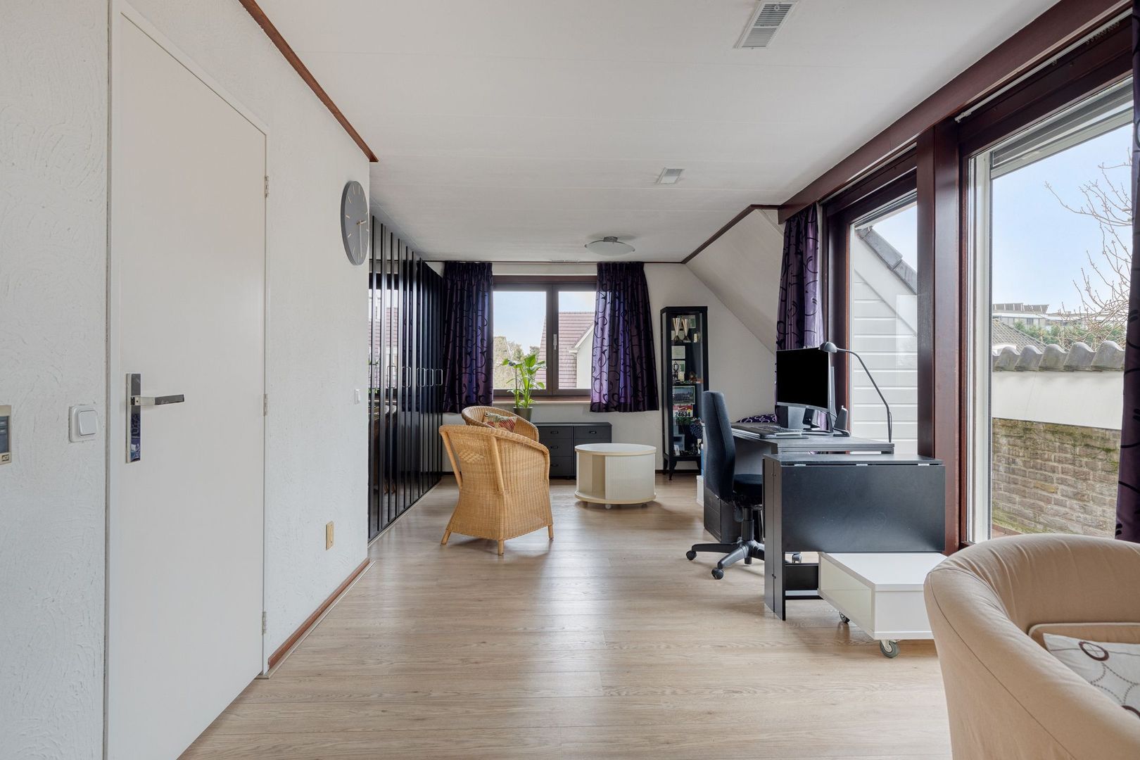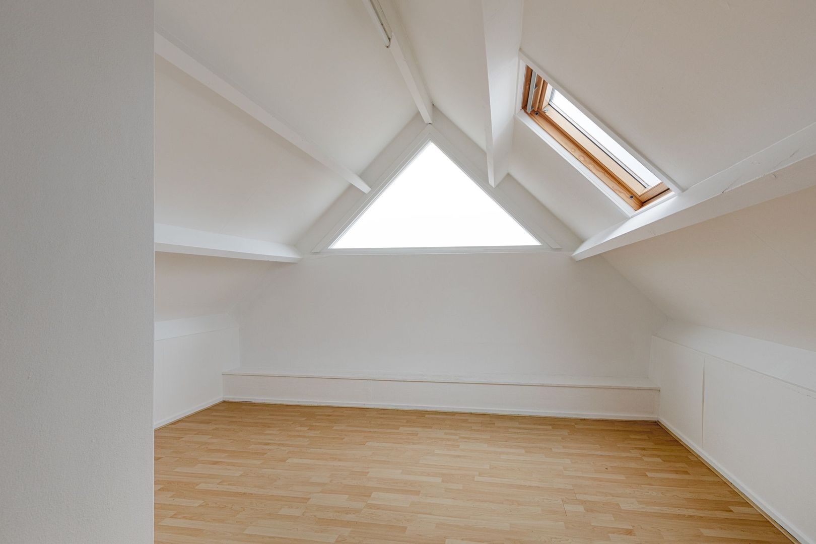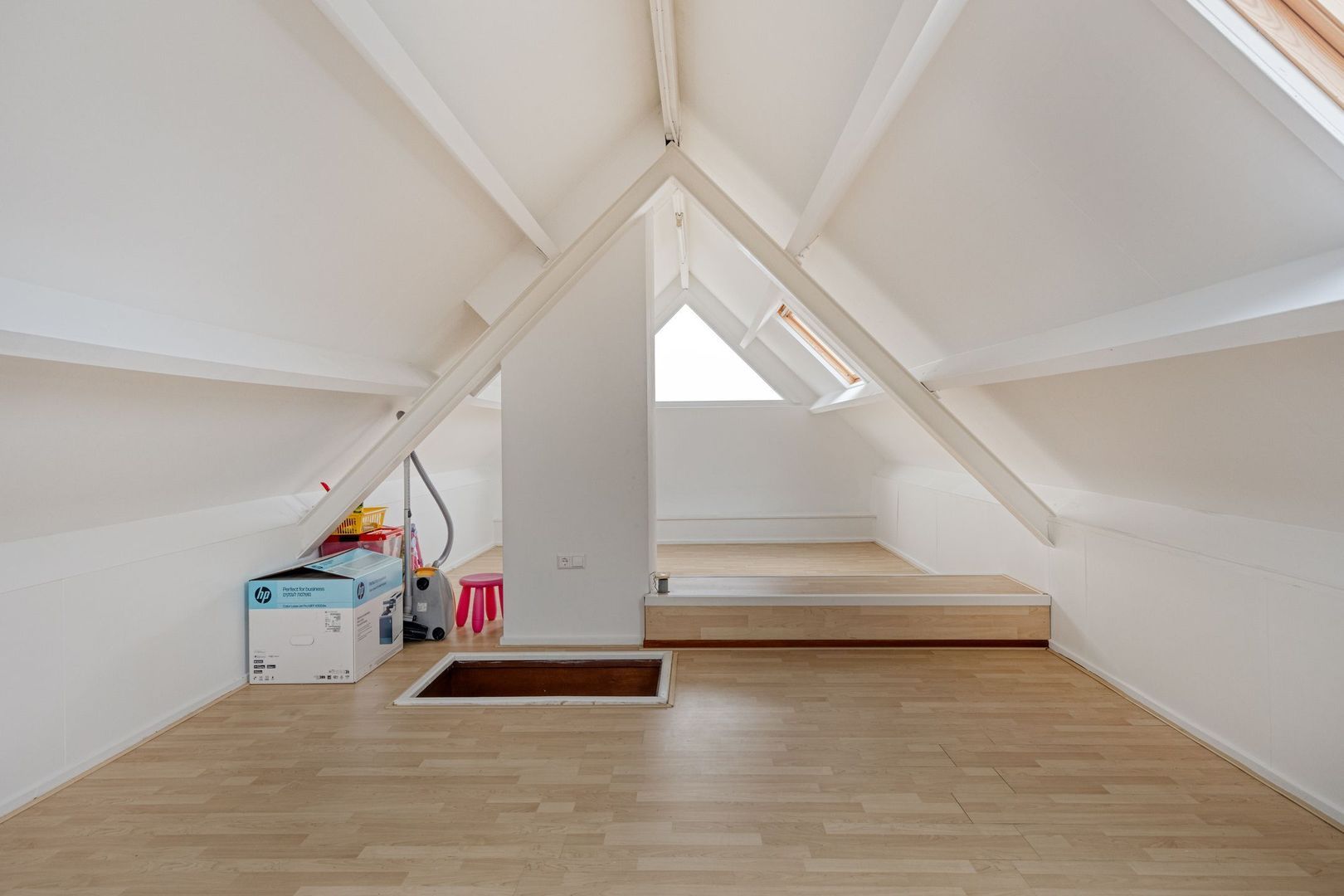 Ruime en lichte zolderruimte met grote ramen, waardoor er veel natuurlijk daglicht binnenvalt. Deze verdieping biedt volop bergruimte en is dankzij de afmetingen en lichtinval zeer geschikt om, met het realiseren van een vaste trap, te worden ingericht als extra slaapkamer, werkruimte of volwaardige woonverdieping.