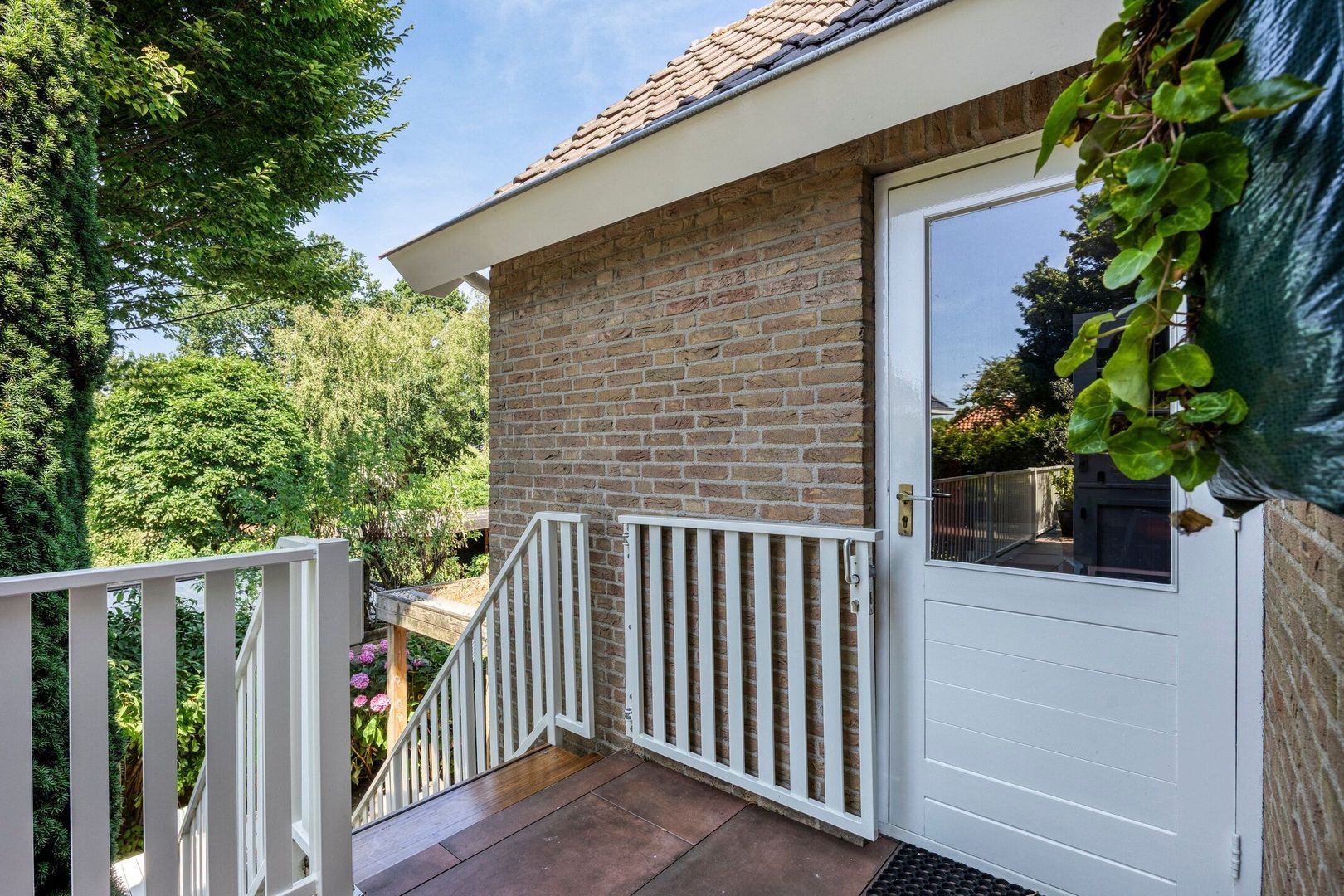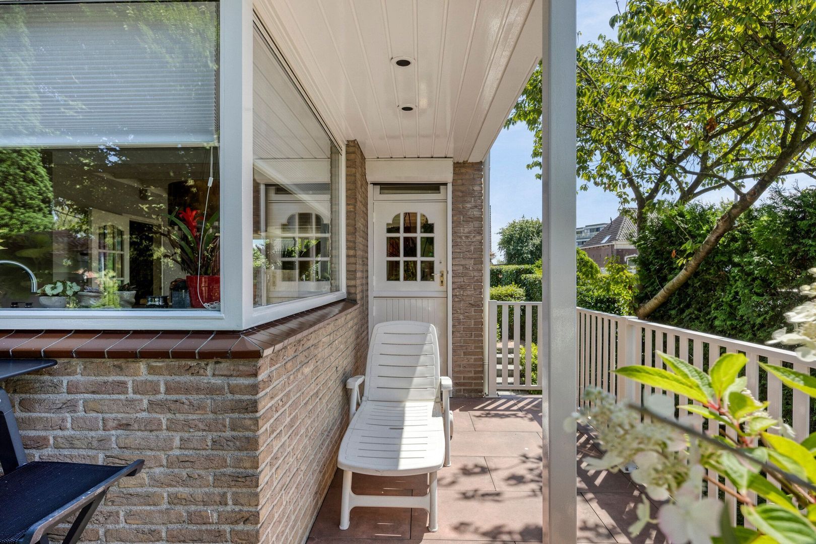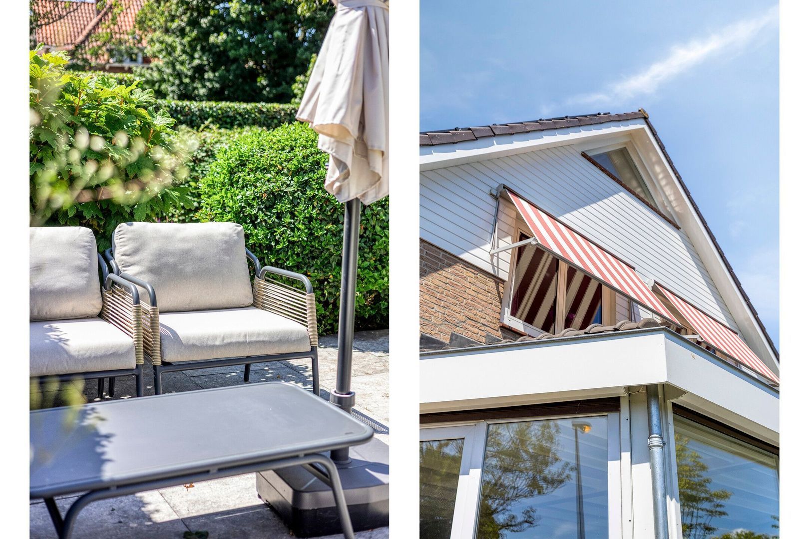 De fraai aangelegde achtertuin biedt veel privacy en een fijne combinatie van zon- en schaduwplekken. Hier geniet je op elk moment van de dag van het buitenleven. Ook de voortuin is een heerlijke plek om te verblijven: hier heb je in de ochtend en tot ver in de middag zon en kun je beschut zitten. De woning is bovendien voorzien van een zonnescherm.