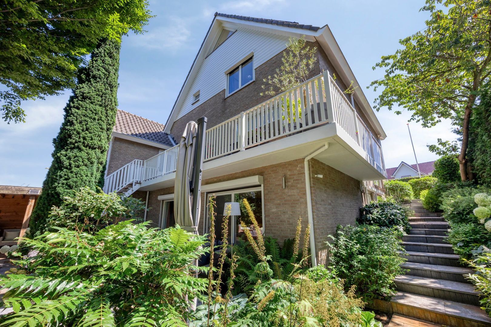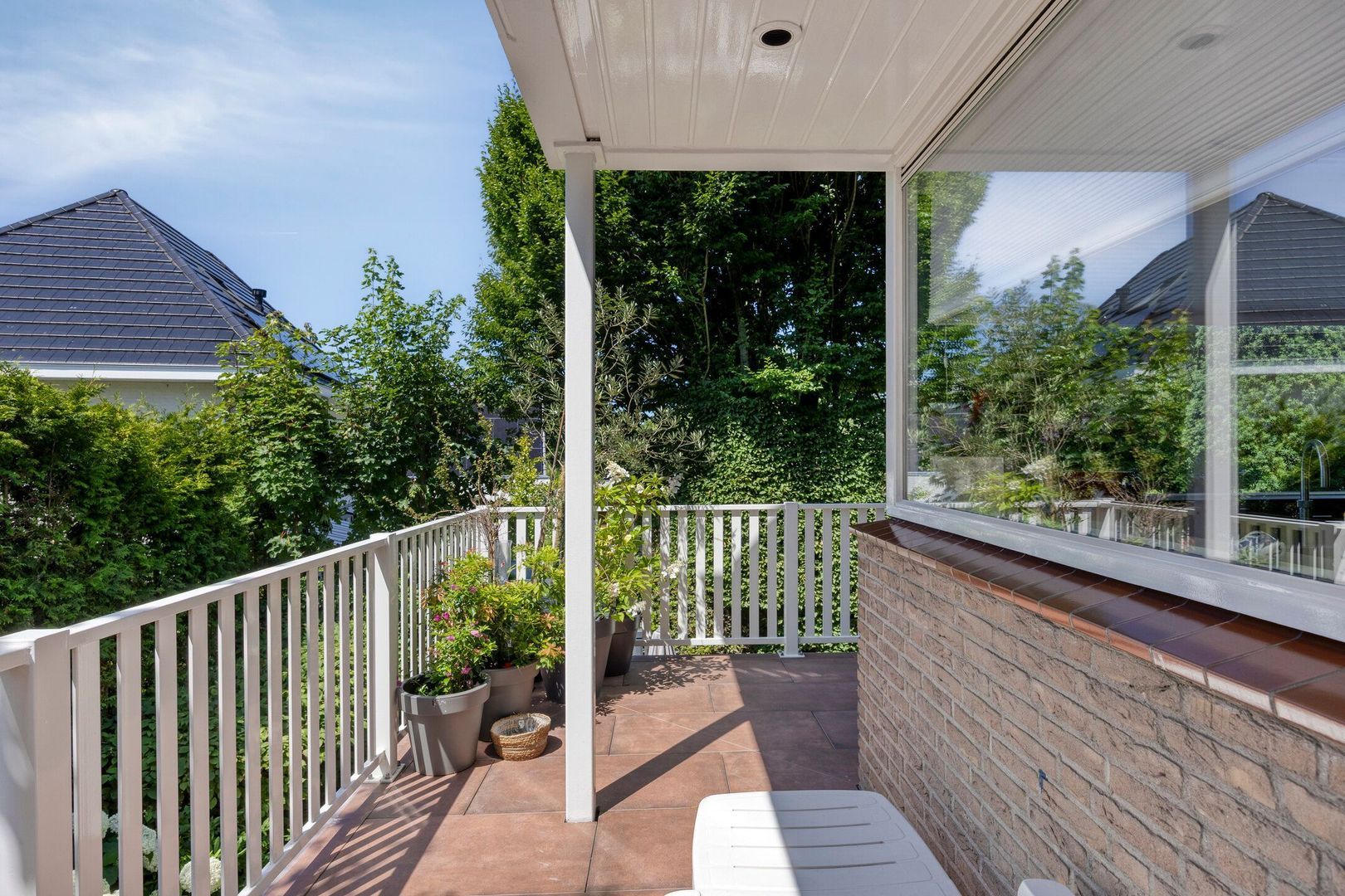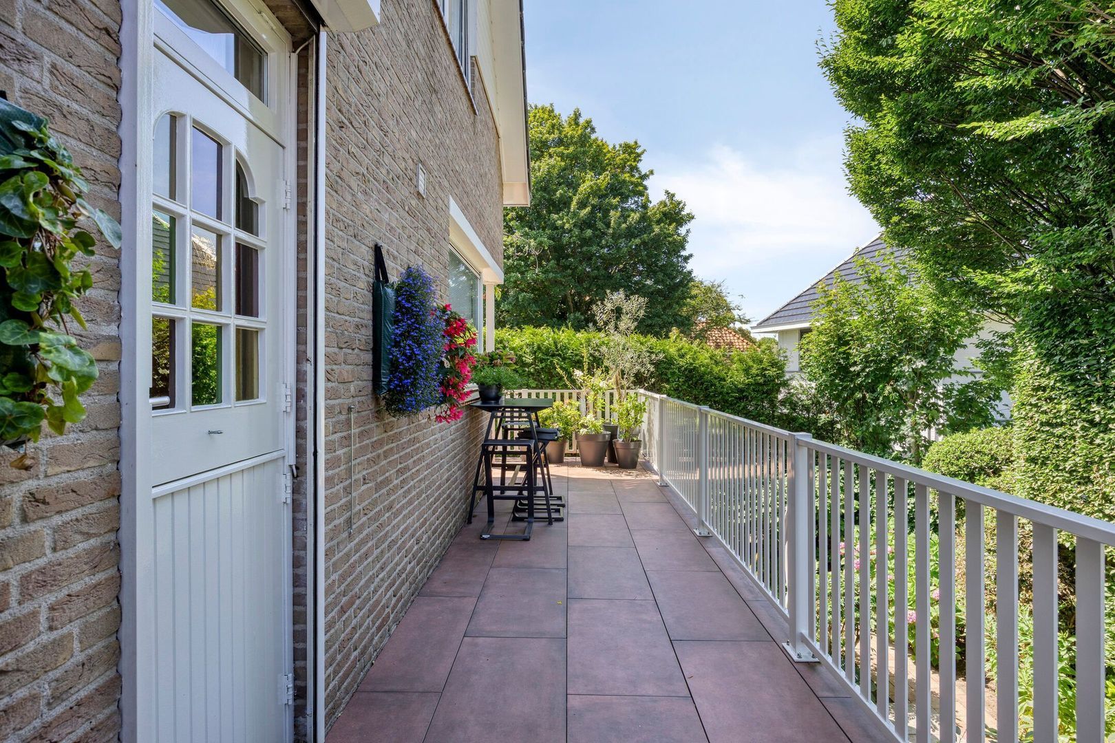 Vanuit de keuken stap je zo het brede, tuingerichte balkon op, dat zich uitstrekt over de volledige breedte van de woning.