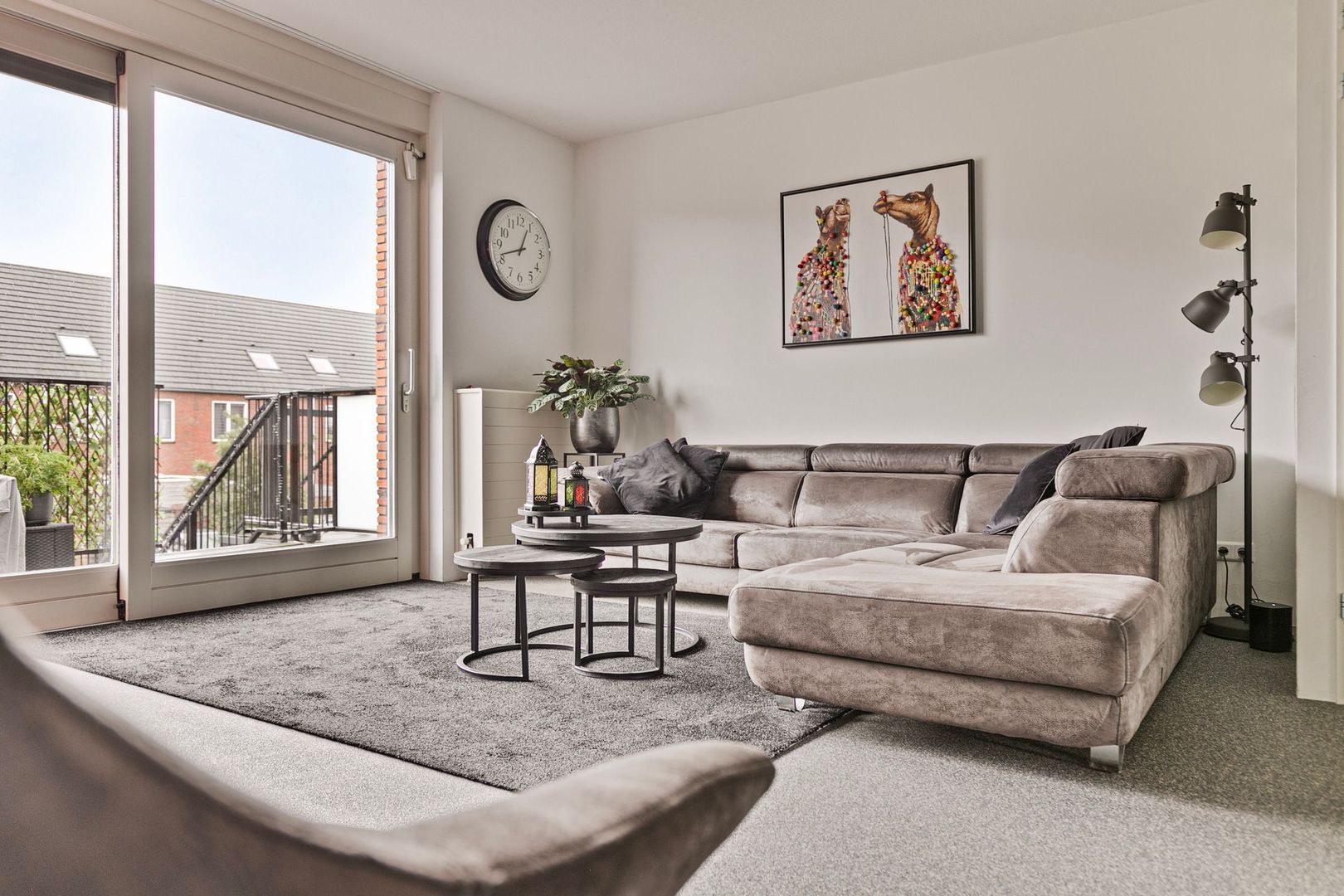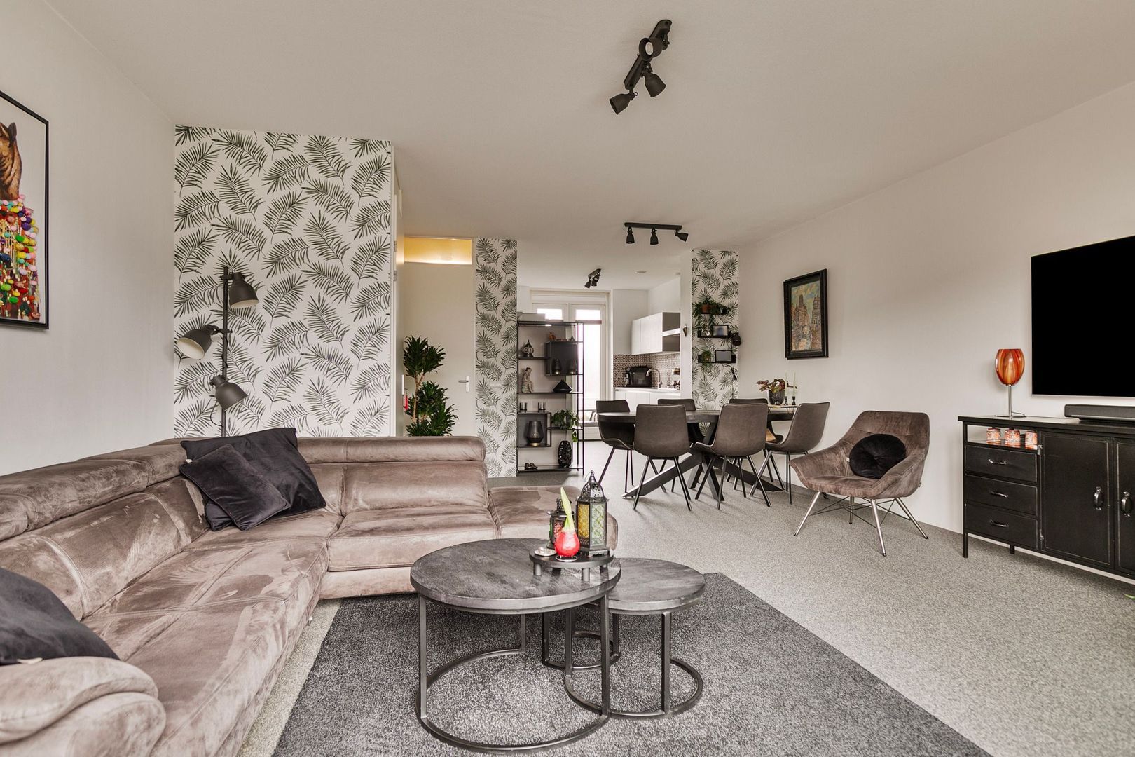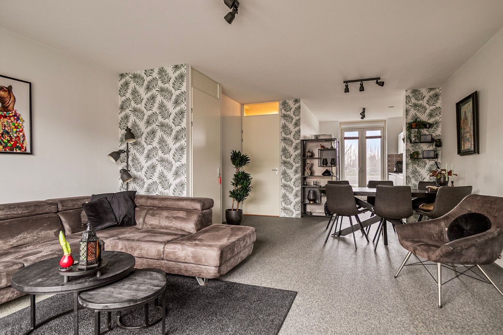 Aan de achterzijde bevindt zich de lichte woonkamer met bergkast onder de trap en de schuifpui die toegang geeft tot het aangrenzende balkon.