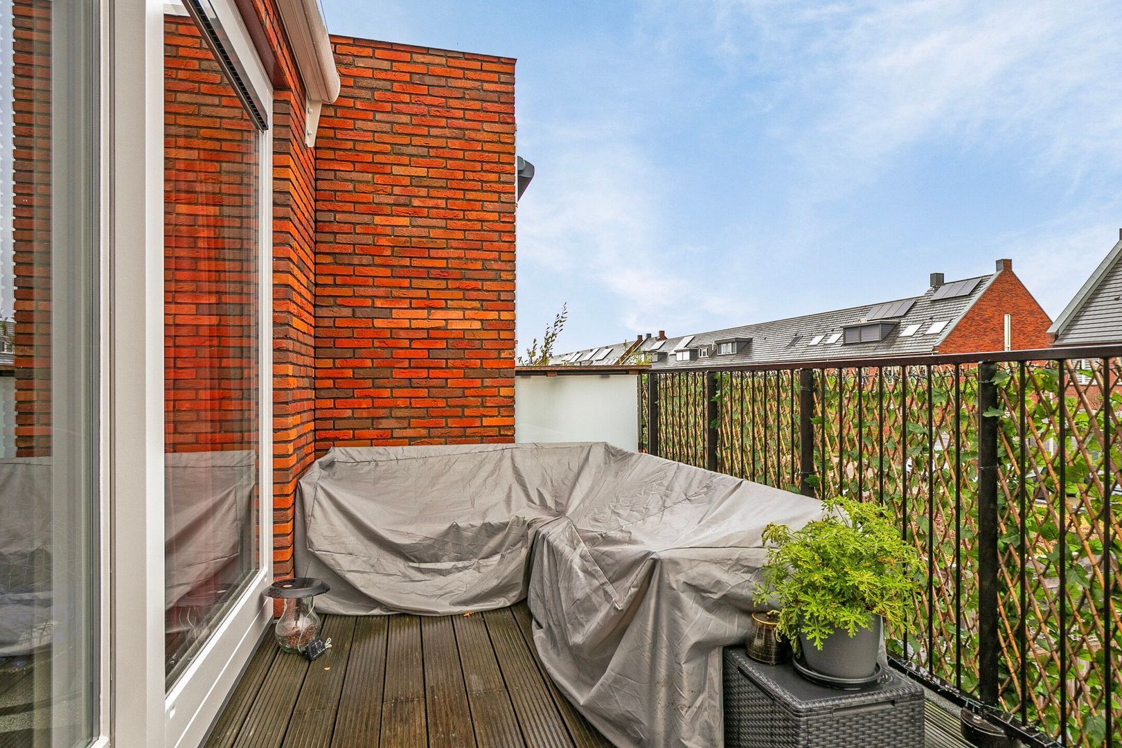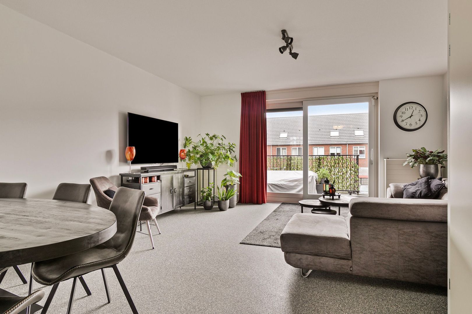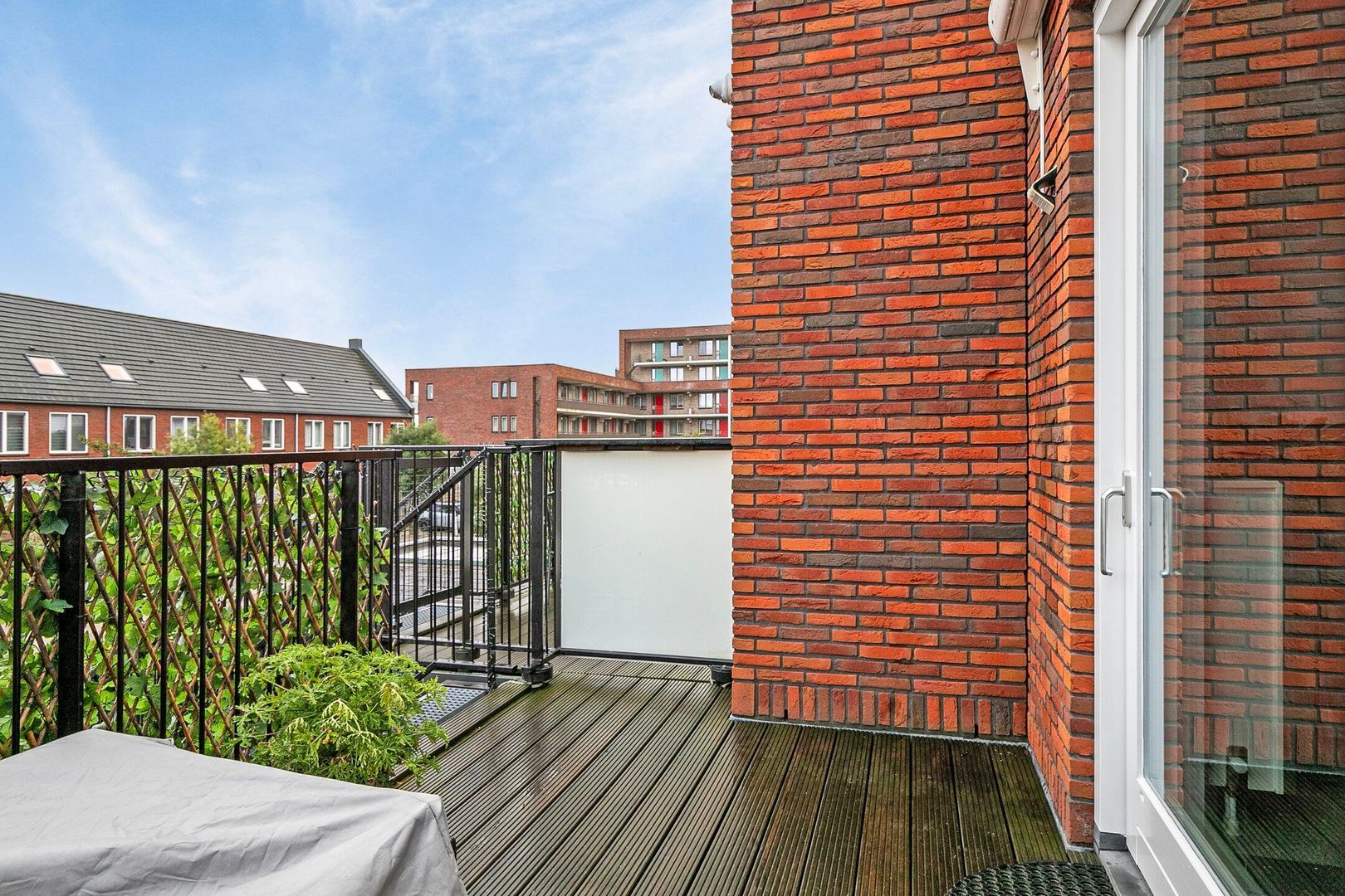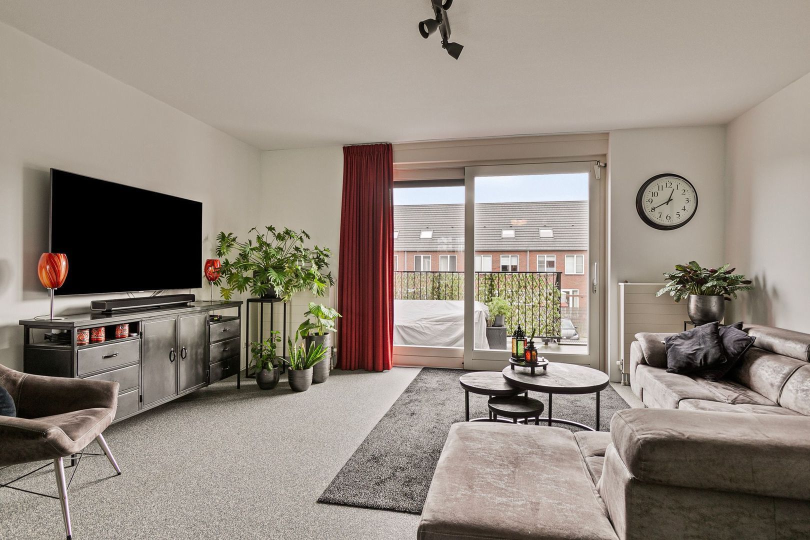 Aan de achterzijde bevindt zich de lichte woonkamer met bergkast onder de trap en de schuifpui die toegang geeft tot het aangrenzende balkon.
