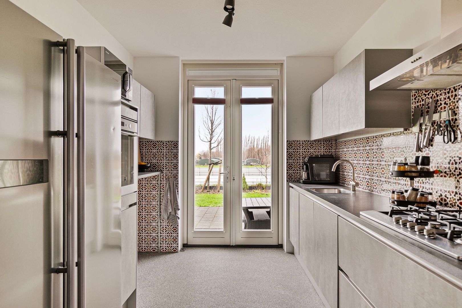 Aan de voorzijde bevindt zich de moderne open keuken met 2 openslaande deuren naar de voortuin.