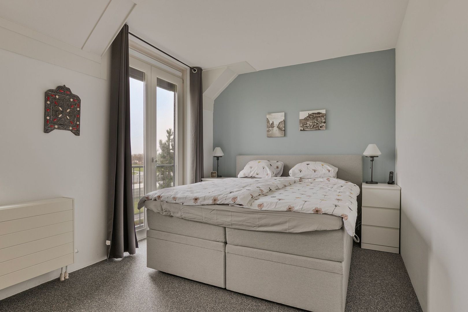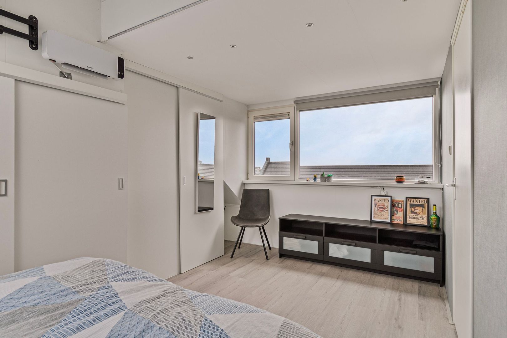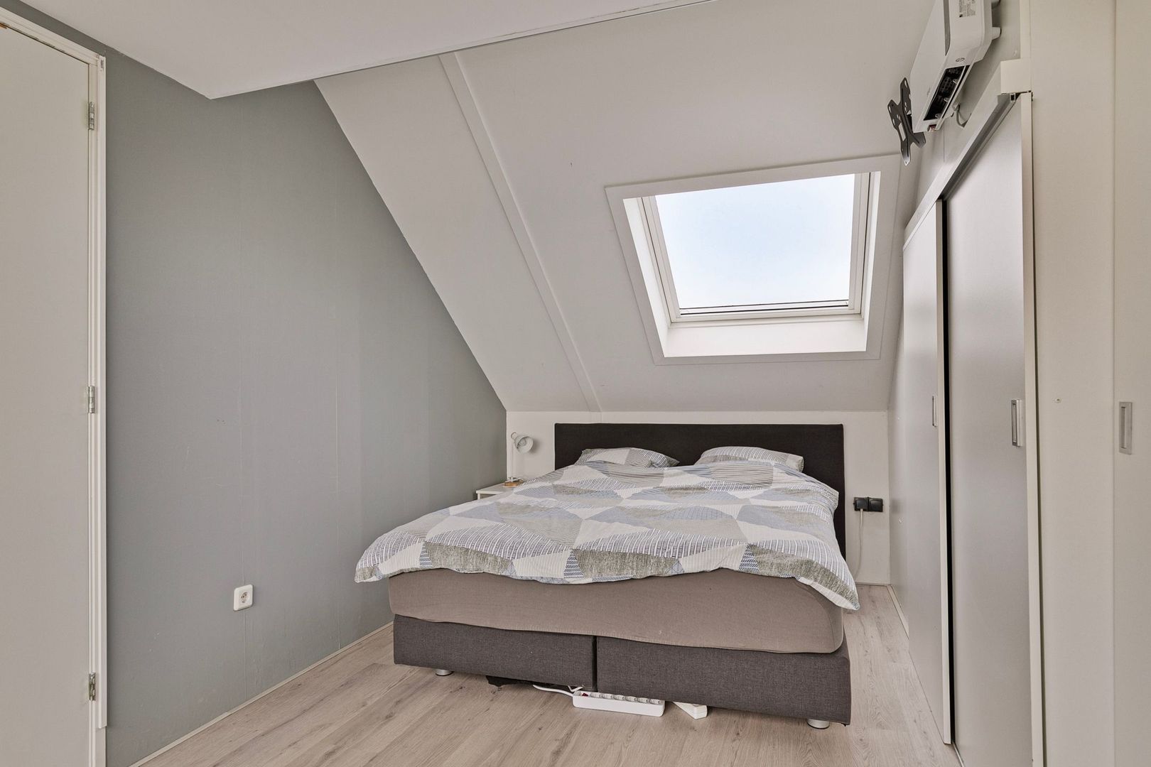 Ruime slaapkamer met een dakkapel, vaste kast, knieschotten voor extra bergruimte, Velux dakraam en teven is hier ook een afgesloten ruimte voor de cv-ketel en de warmtepomp. Het dakkapel is voorzien van een elektrisch rolluik.