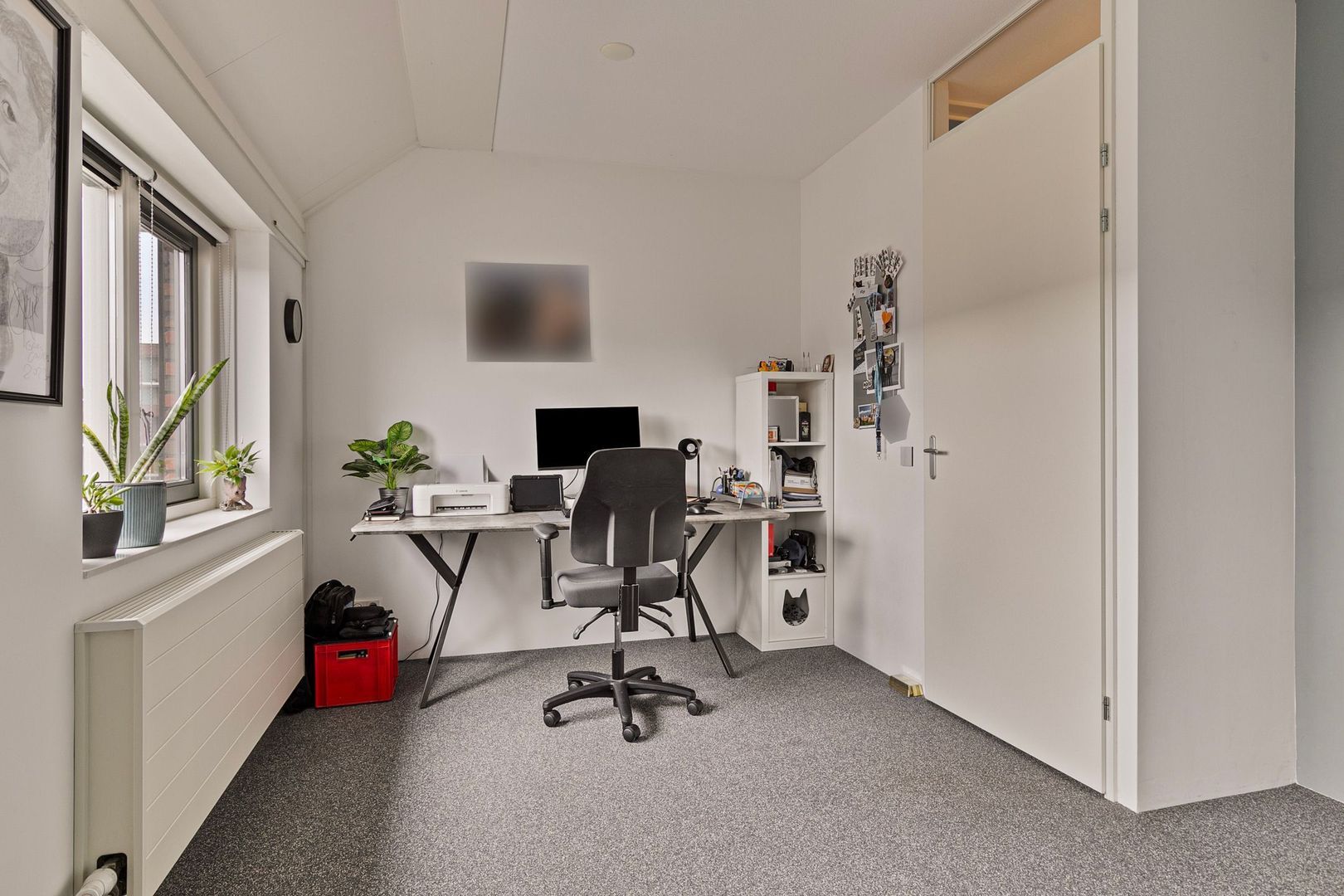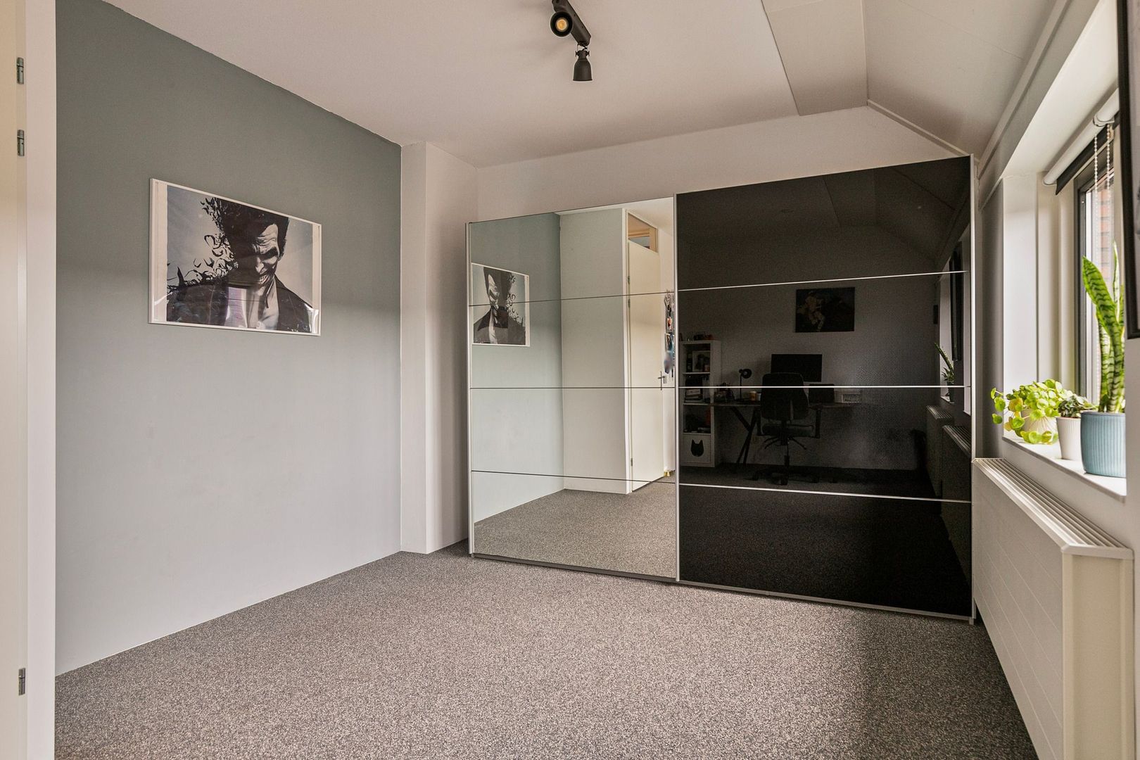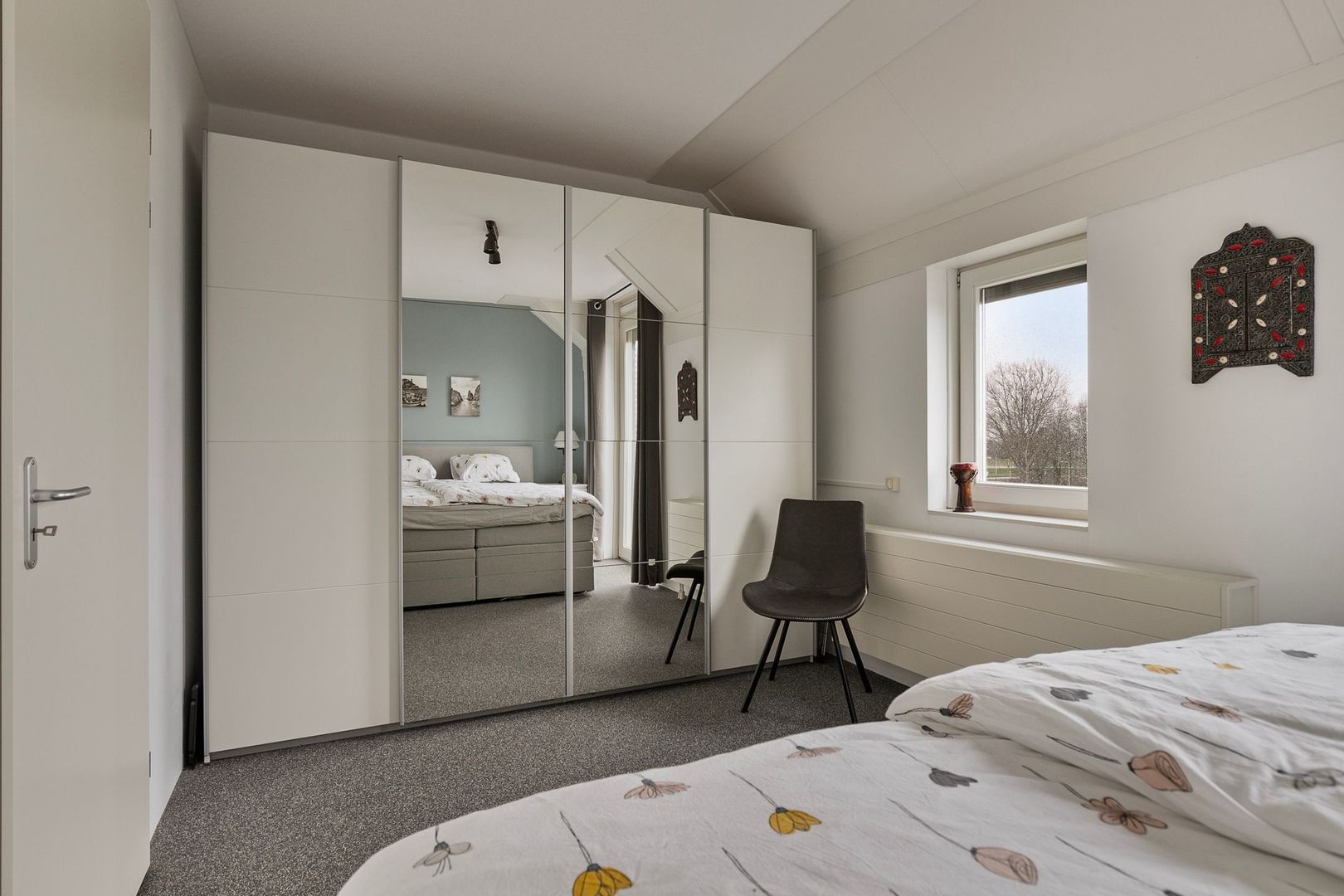 Ruime slaapkamer met een dakkapel, vaste kast, knieschotten voor extra bergruimte, Velux dakraam en teven is hier ook een afgesloten ruimte voor de cv-ketel en de warmtepomp. Het dakkapel is voorzien van een elektrisch rolluik.
