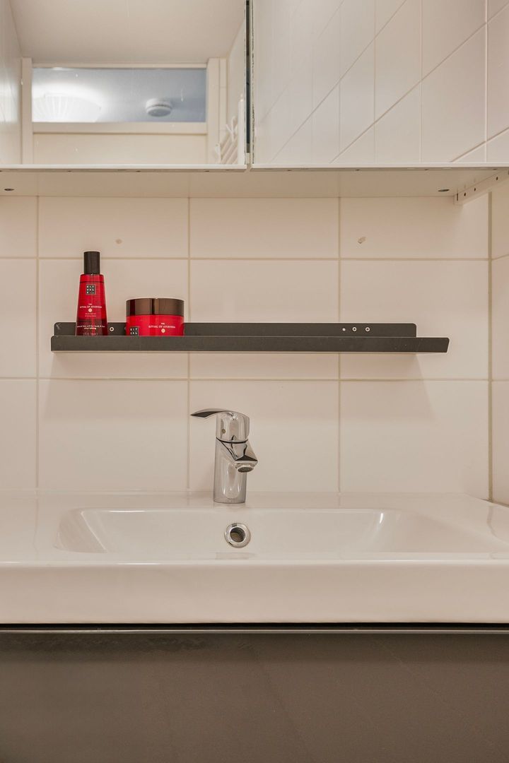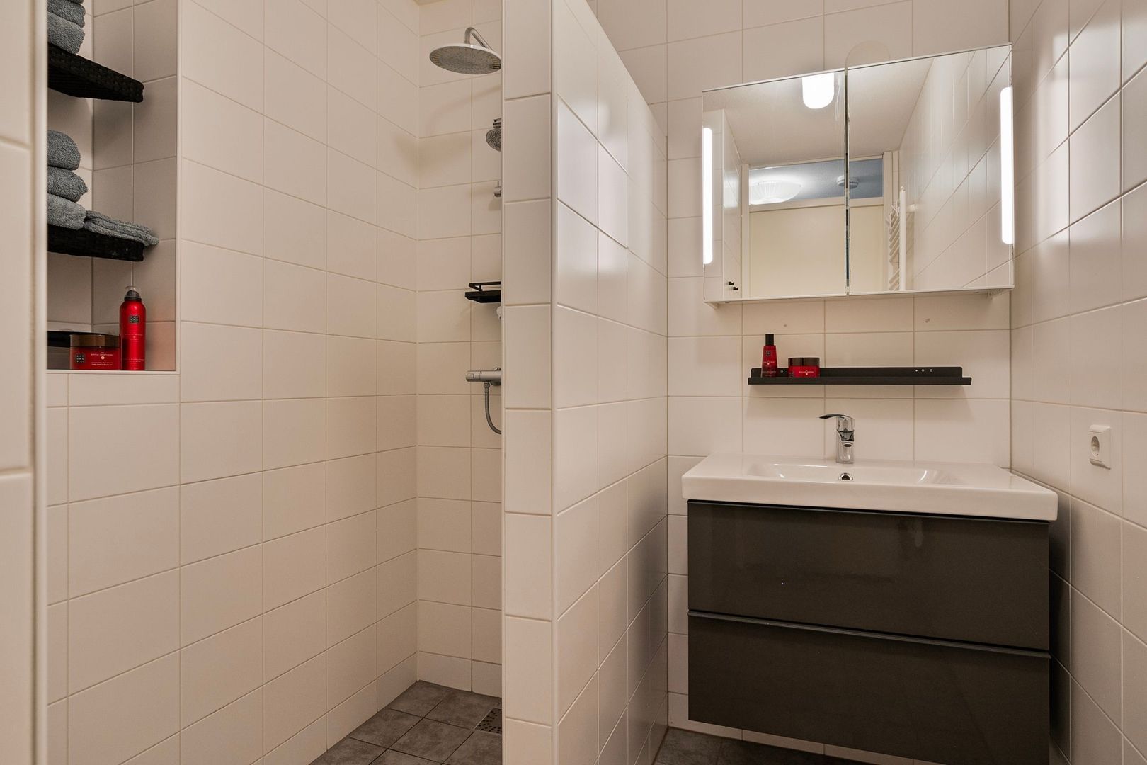 Master bedroom aan de voorzijde met 2 openslaande deuren naar frans balkon. Moderne badkamer voorzien van inloopdouche, wastafel met meubel en spiegelkast