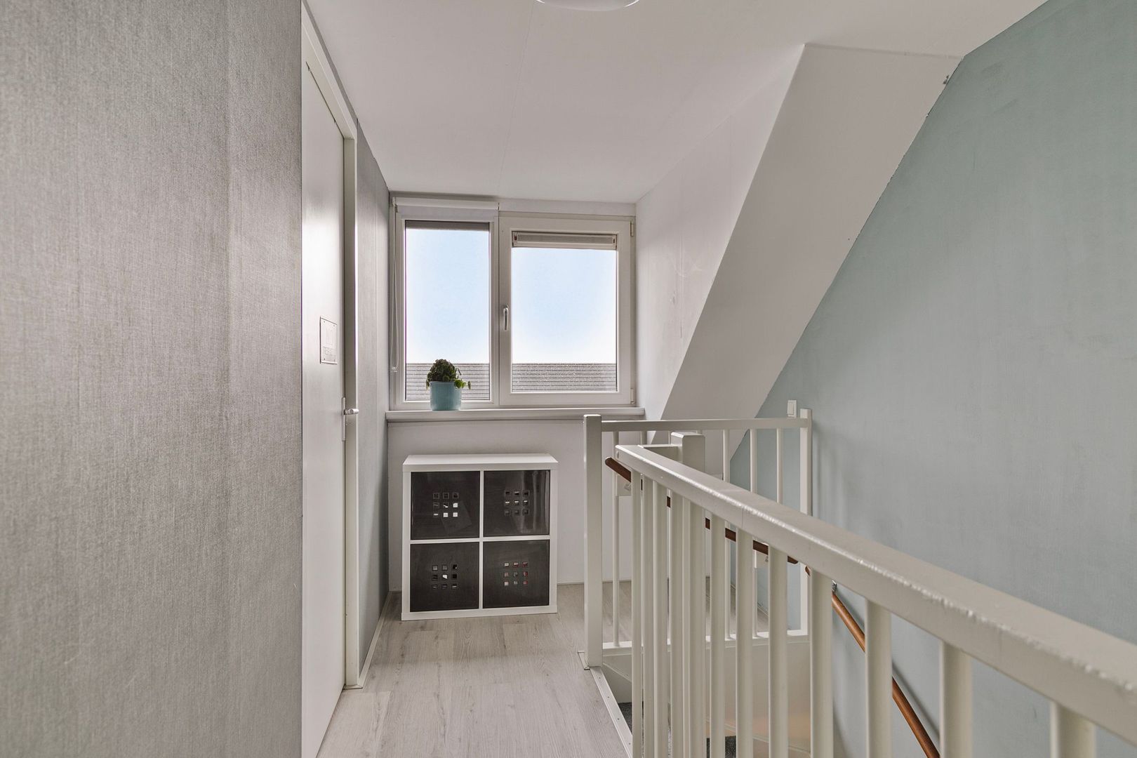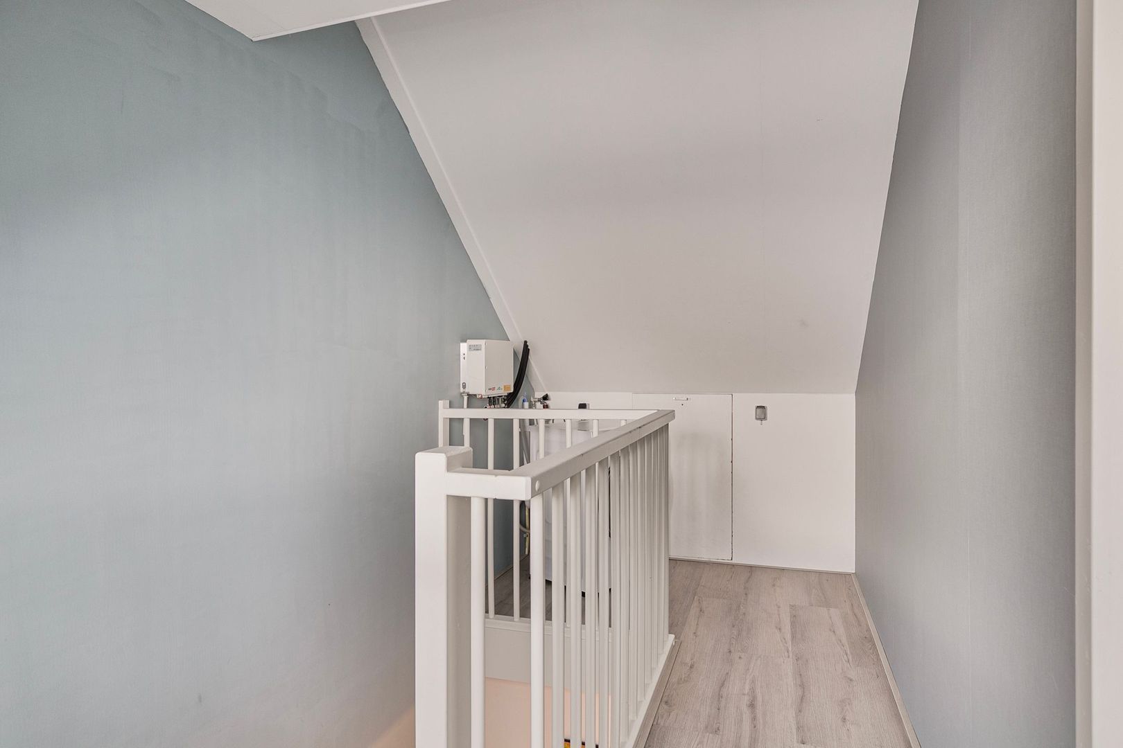Overloop met trapopgang naar de 2e verdieping, toegang tot de 2 slaapkamers, separaat toilet, en de badkamer.