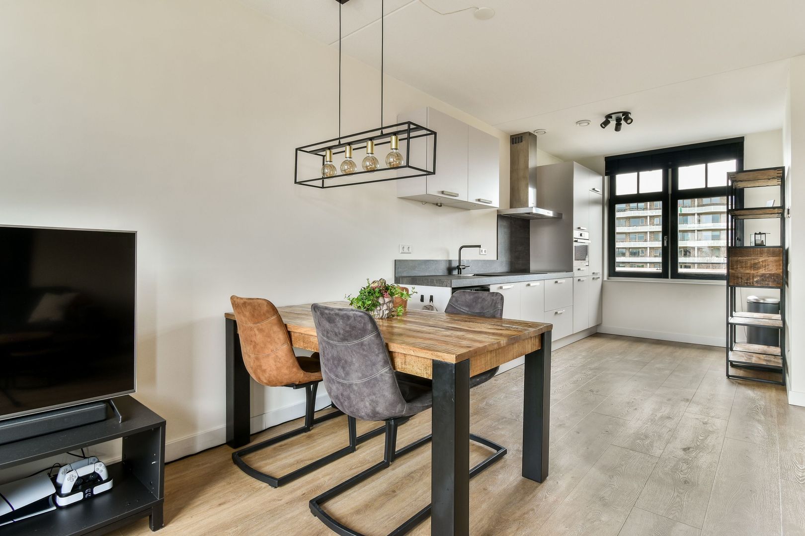 Hal met meterkast en toilet. De lichte woonkamer bevindt zich aan de achterzijde van de woning. Aan de voorzijde ligt de open, moderne keuken die is voorzien van een inductiekookplaat, afzuigkap, combimagnetron, koel-vriescombinatie en een wijnkoelkast.