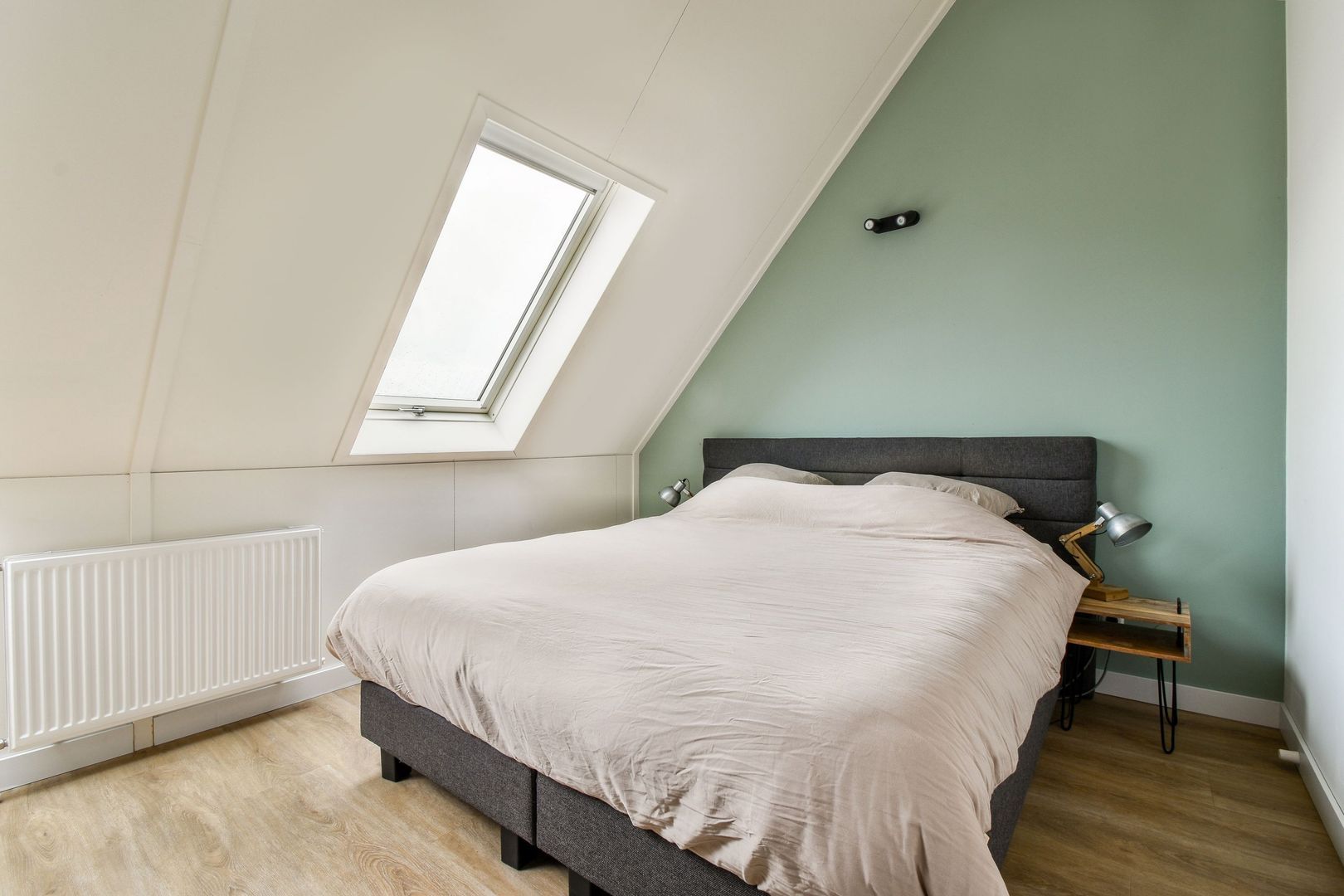 De ruime slaapkamer ligt aan de achterzijde. Door de twee dakramen komt er veel licht binnen en achter de knieschotten is extra bergruimte aanwezig.