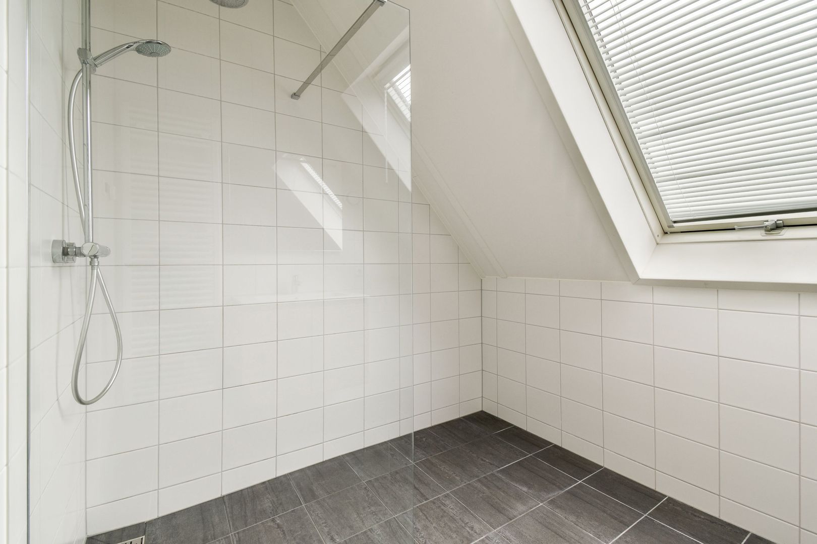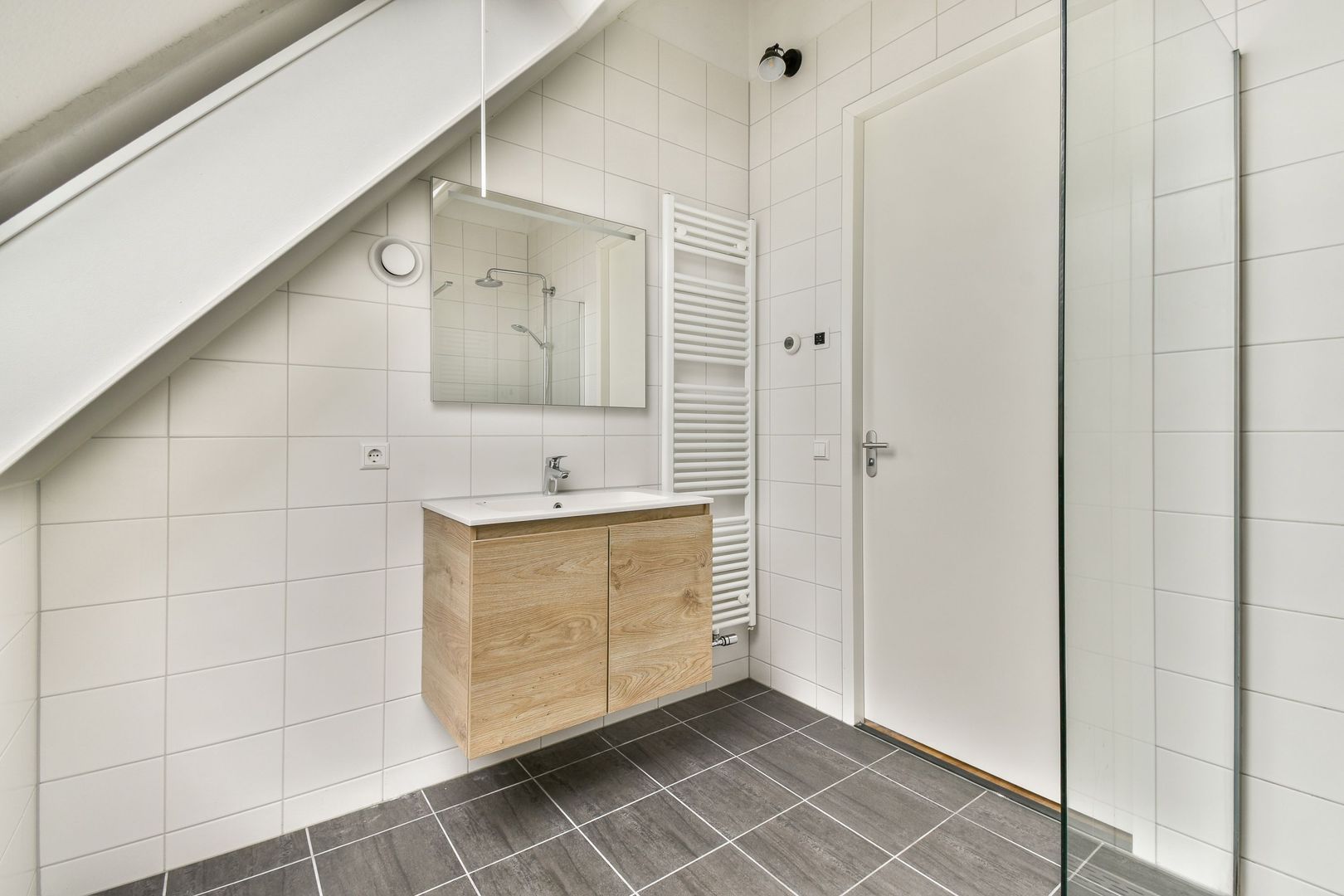 Vanuit de slaapkamer bereik je de nette, volledig betegelde badkamer met douche, wastafel, handdoekradiator en mechanische ventilatie.