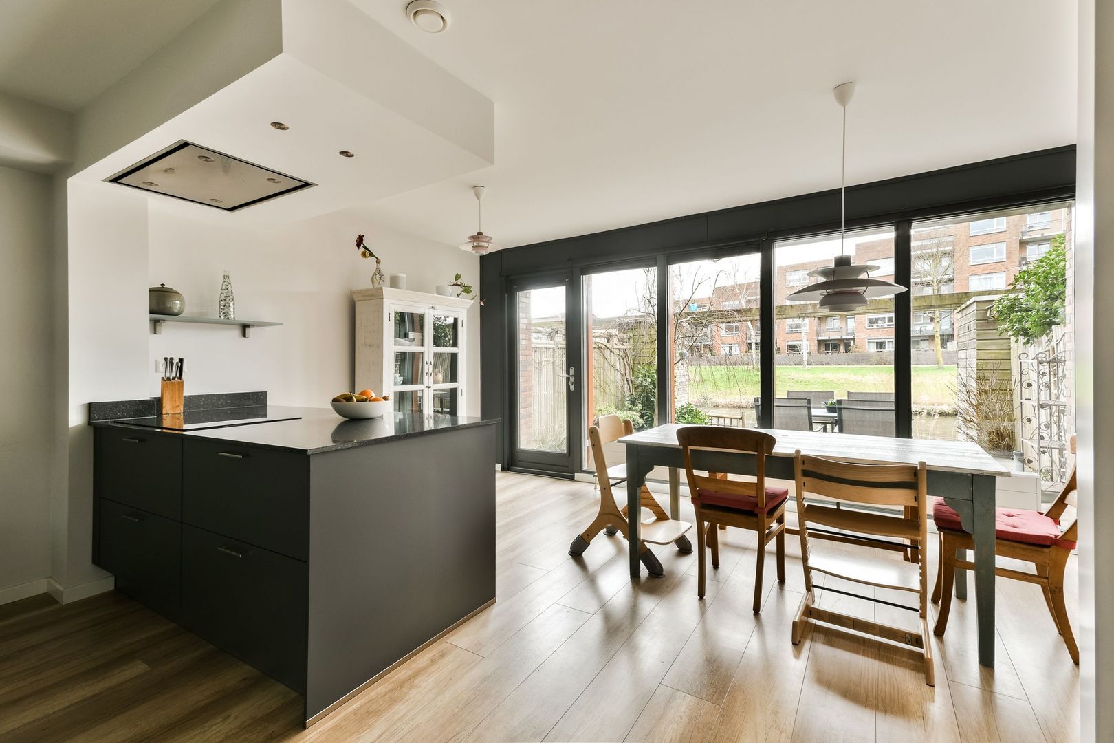 In de ruime tuinkamer bevindt zich momenteel de keuken met kookeiland, voorzien van diverse inbouwapparatuur zoals een koel-/vriescombinatie, vaatwasser, oven, combimagnetron en inductiekookplaat. Ook is er een praktische trapkast aanwezig. Vanuit hier bereik je de zonnige achtertuin op het zuidoosten, met vrij uitzicht over het water.