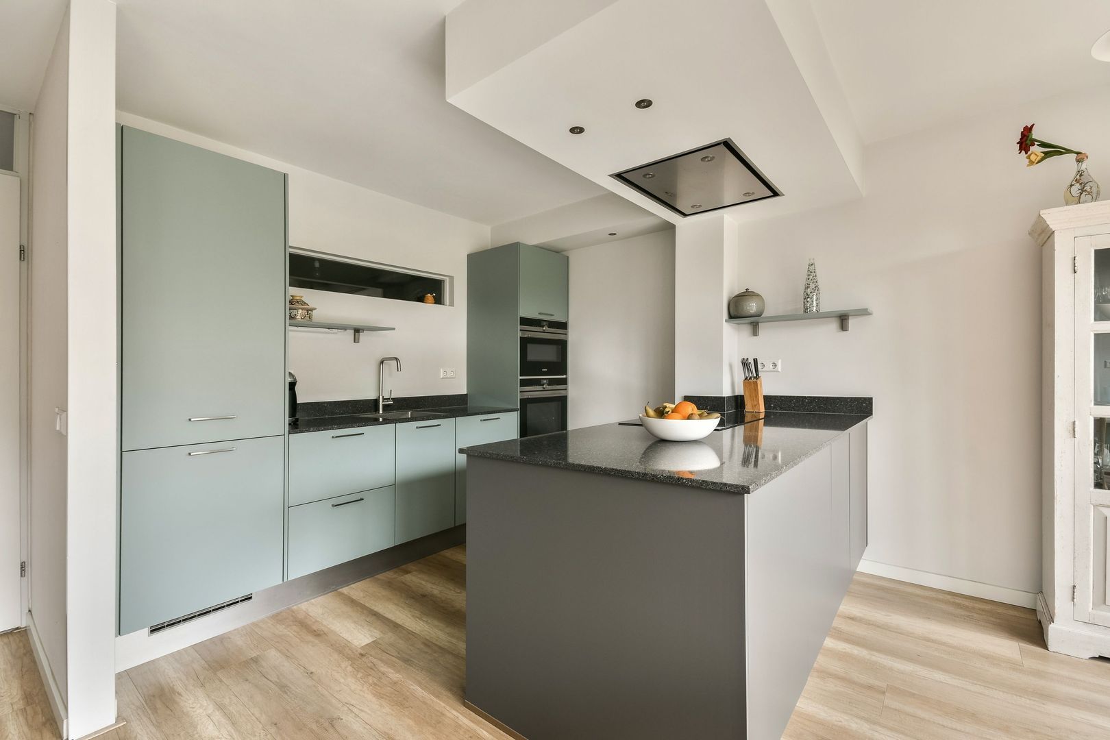 De royale woonkamer is door de grote raampartijen heerlijk licht en biedt een prachtig vrij uitzicht. De woonkamer is voorzien van een fraaie laminaatvloer. Daarnaast bevindt zich op deze verdieping een aparte werkkamer.