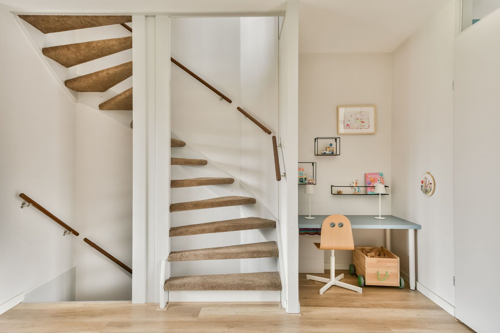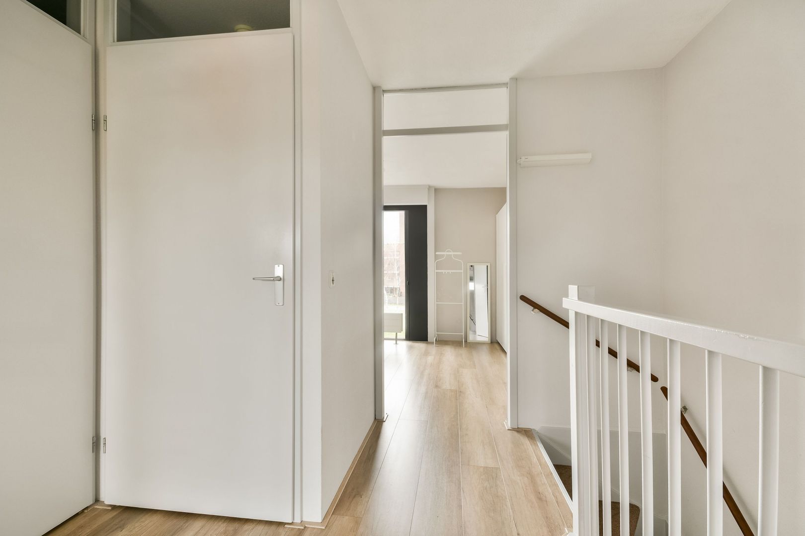 Overloop met toegang tot alle vertrekken en een aparte wasruimte met aansluitingen voor de wasmachine en droger.
