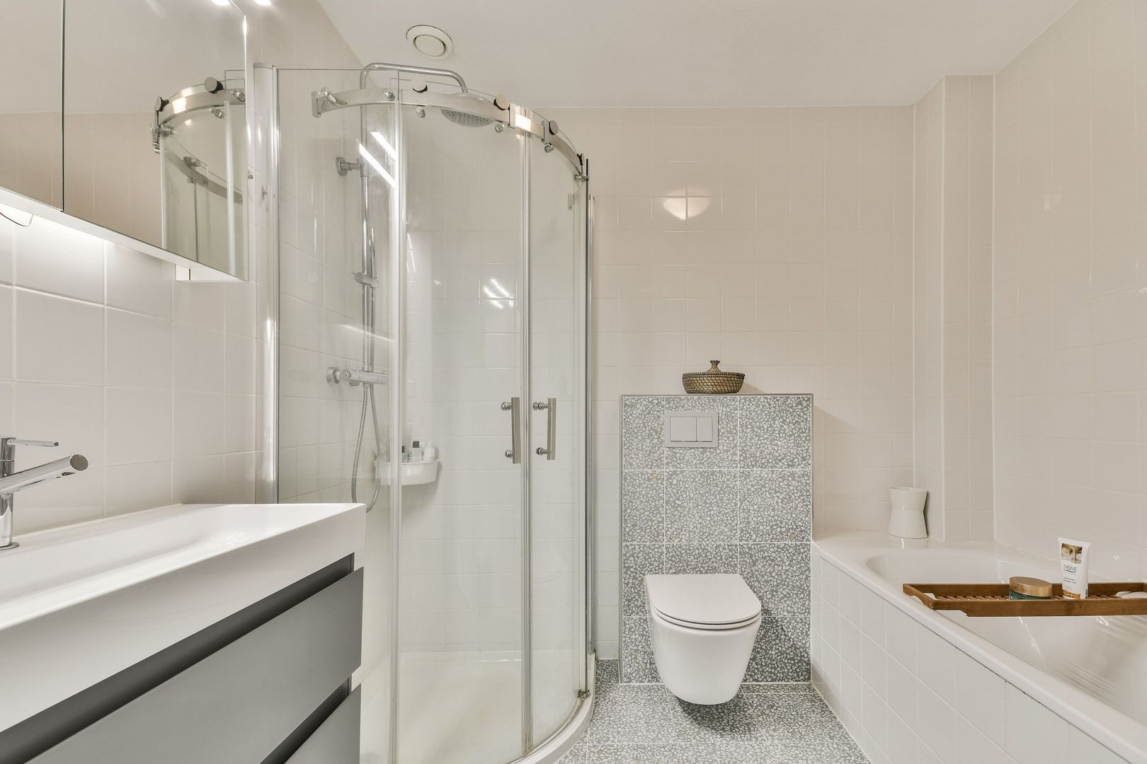 De badkamer is uitgerust met een ligbad, toilet, douche, wastafel en handdoekradiator.