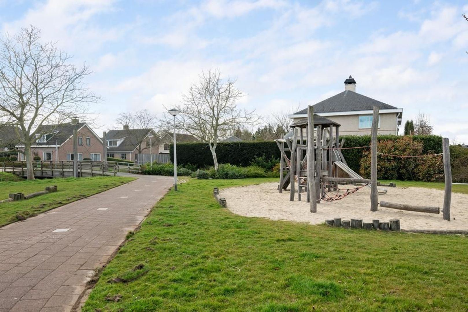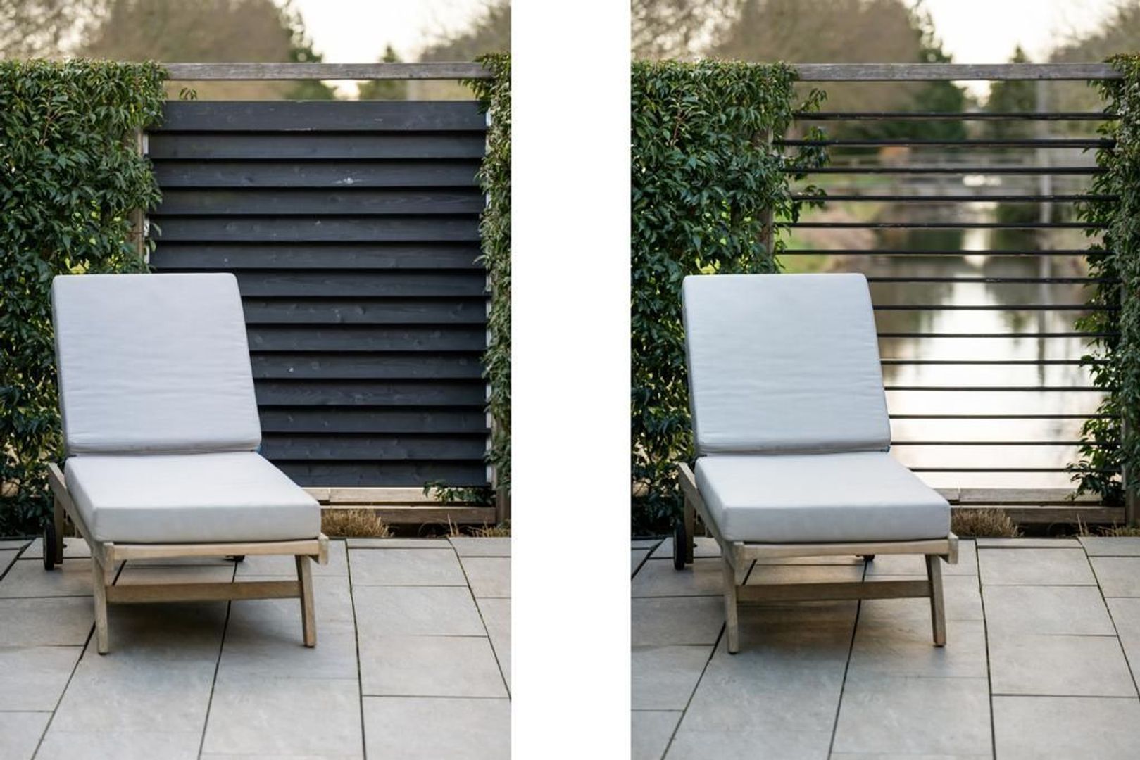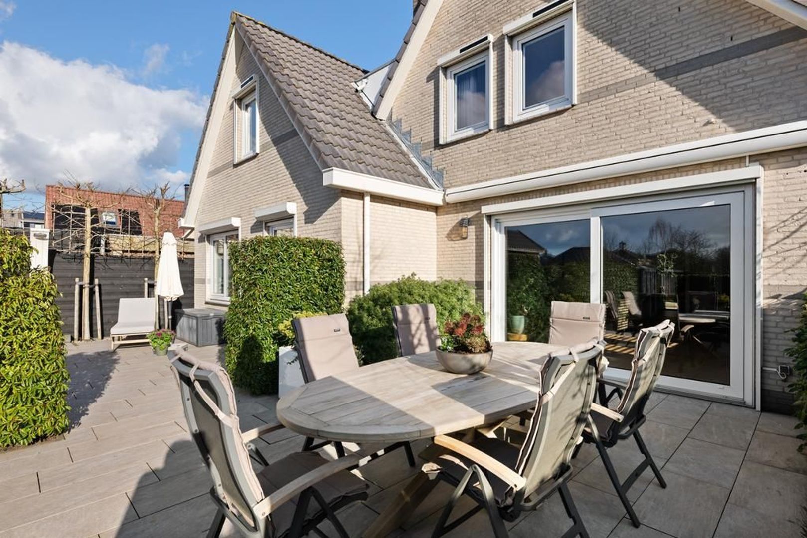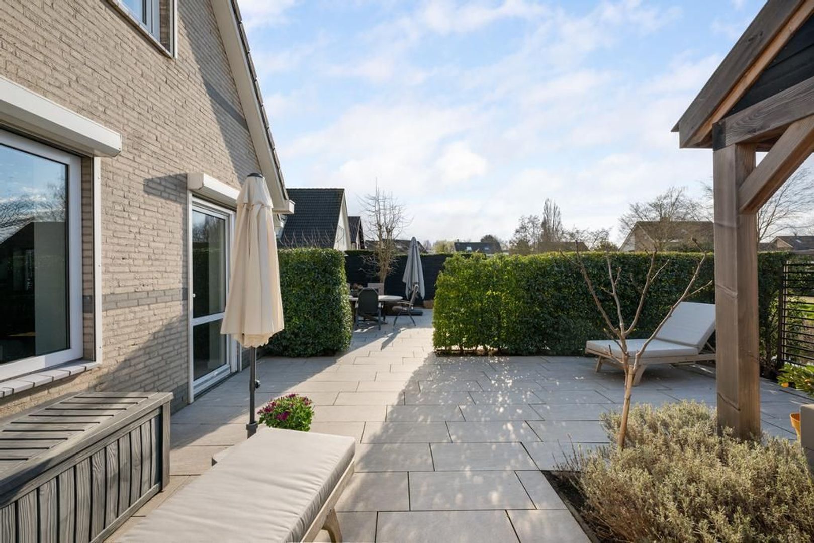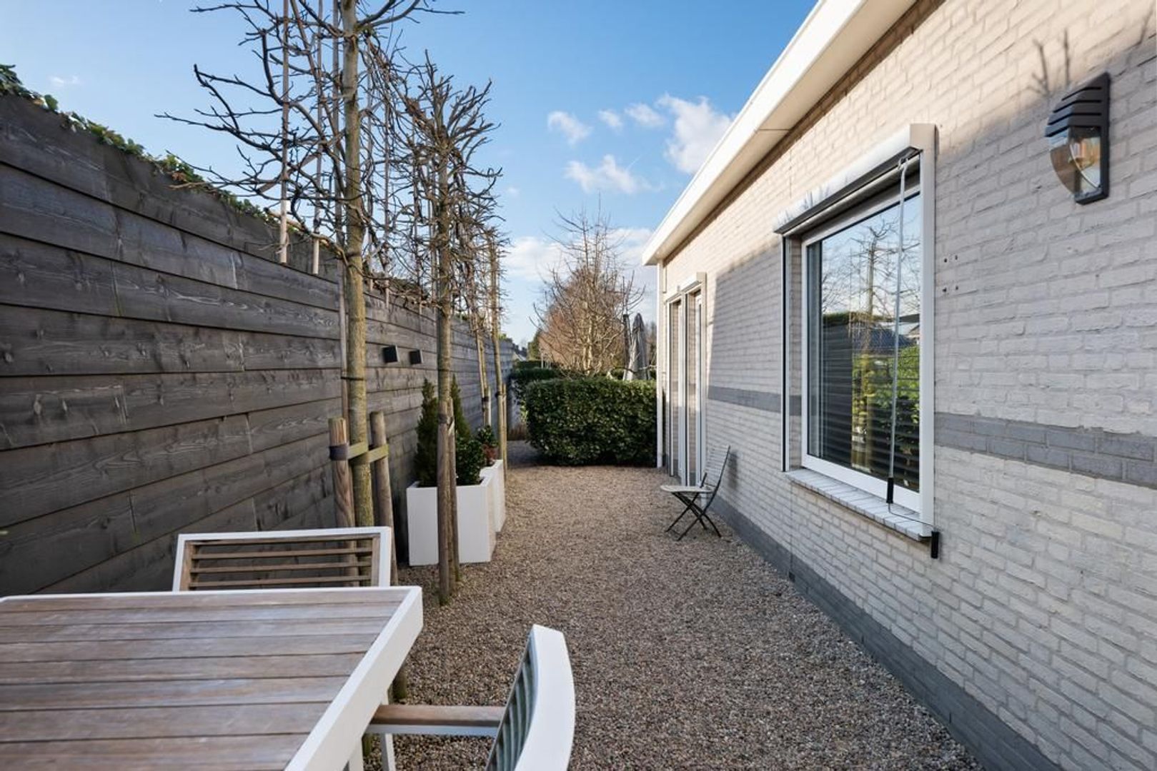 De verzorgde achtertuin is gelegen op het westen en grenst aan de woonkamer en de slaap/studeerkamer. De tuin beschikt over diverse terrassen met veel privacy, een veranda met heater, berging, buitendouche en een schitterend vrij uitzicht op de achtergelegen singel. De woning is voorzien van zonnescreens en een zonnescherm.