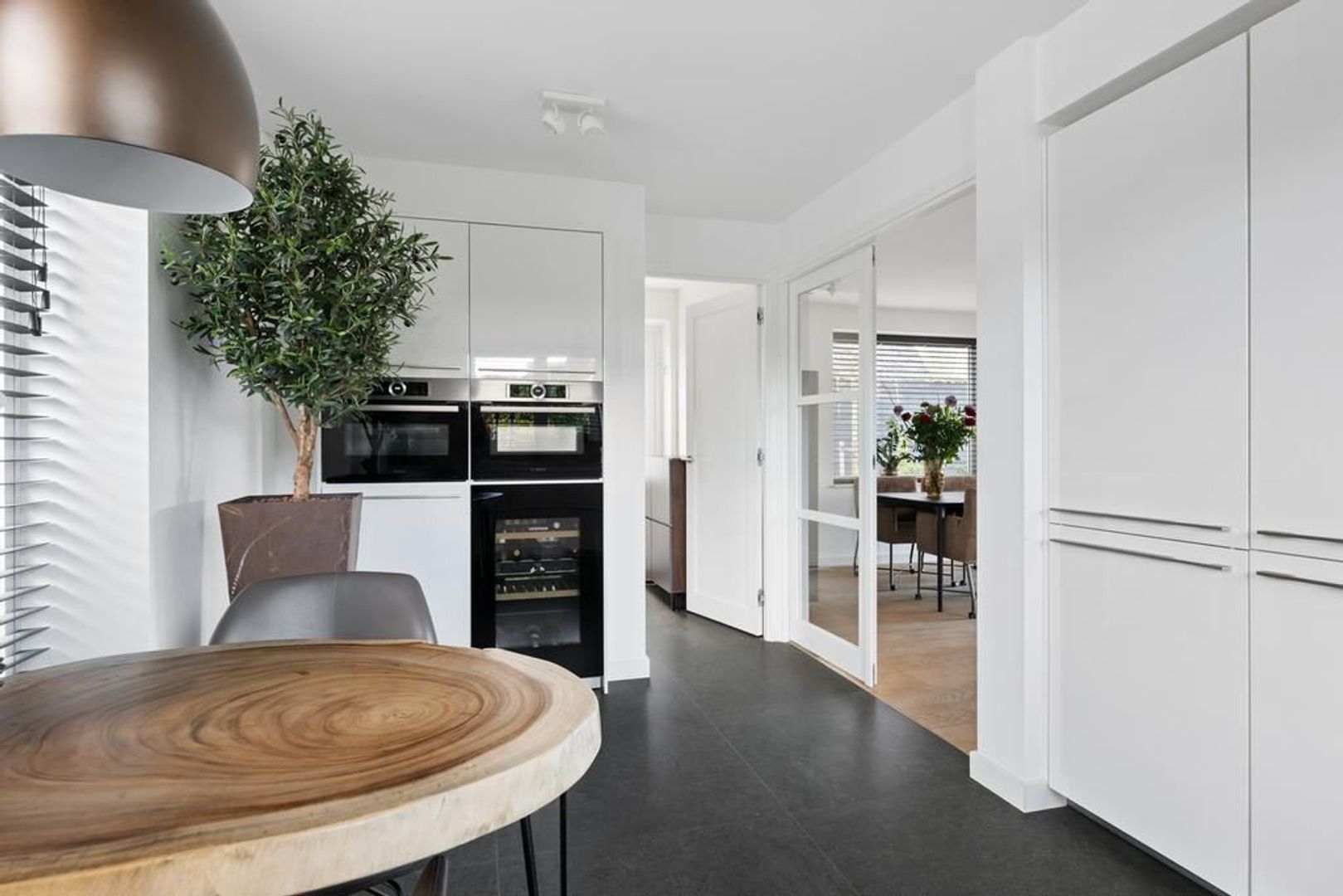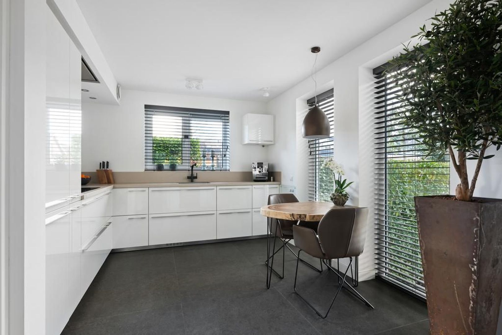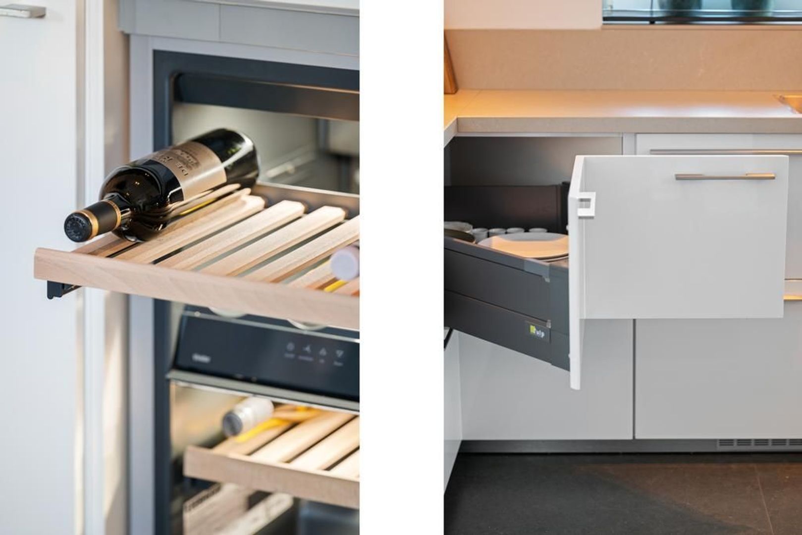 De luxe, moderne keuken beschikt over diverse inbouwapparatuur waaronder een vaatwasser, grote koelkast, 5-pits inductiekookplaat, afzuigkap, Quooker, combi-oven, stoomoven, wijnkoelkast en een vriezer. Daarnaast biedt de keuken volop opbergruimte.