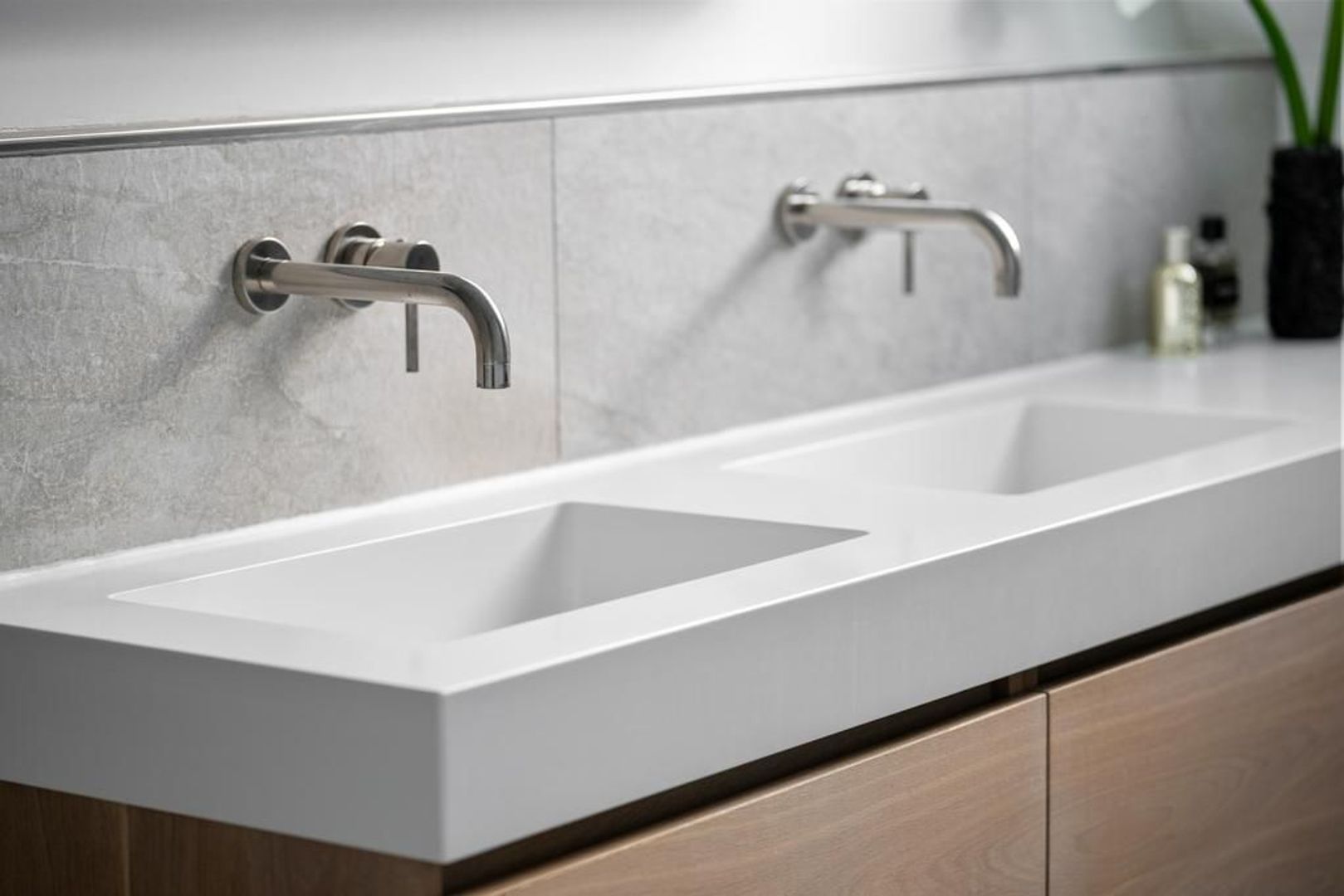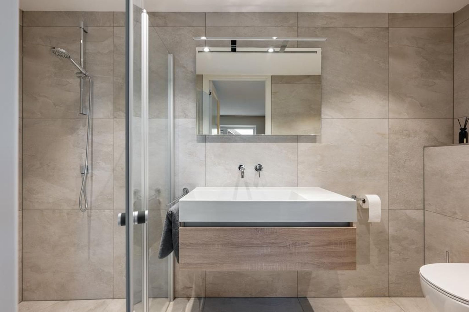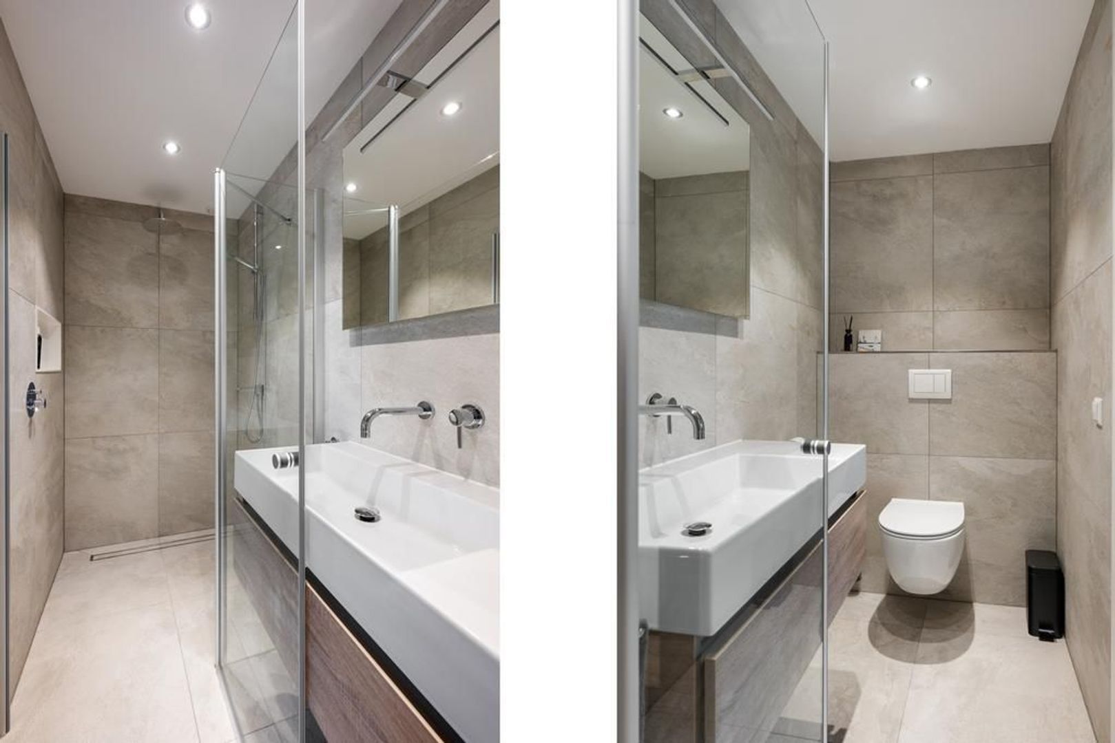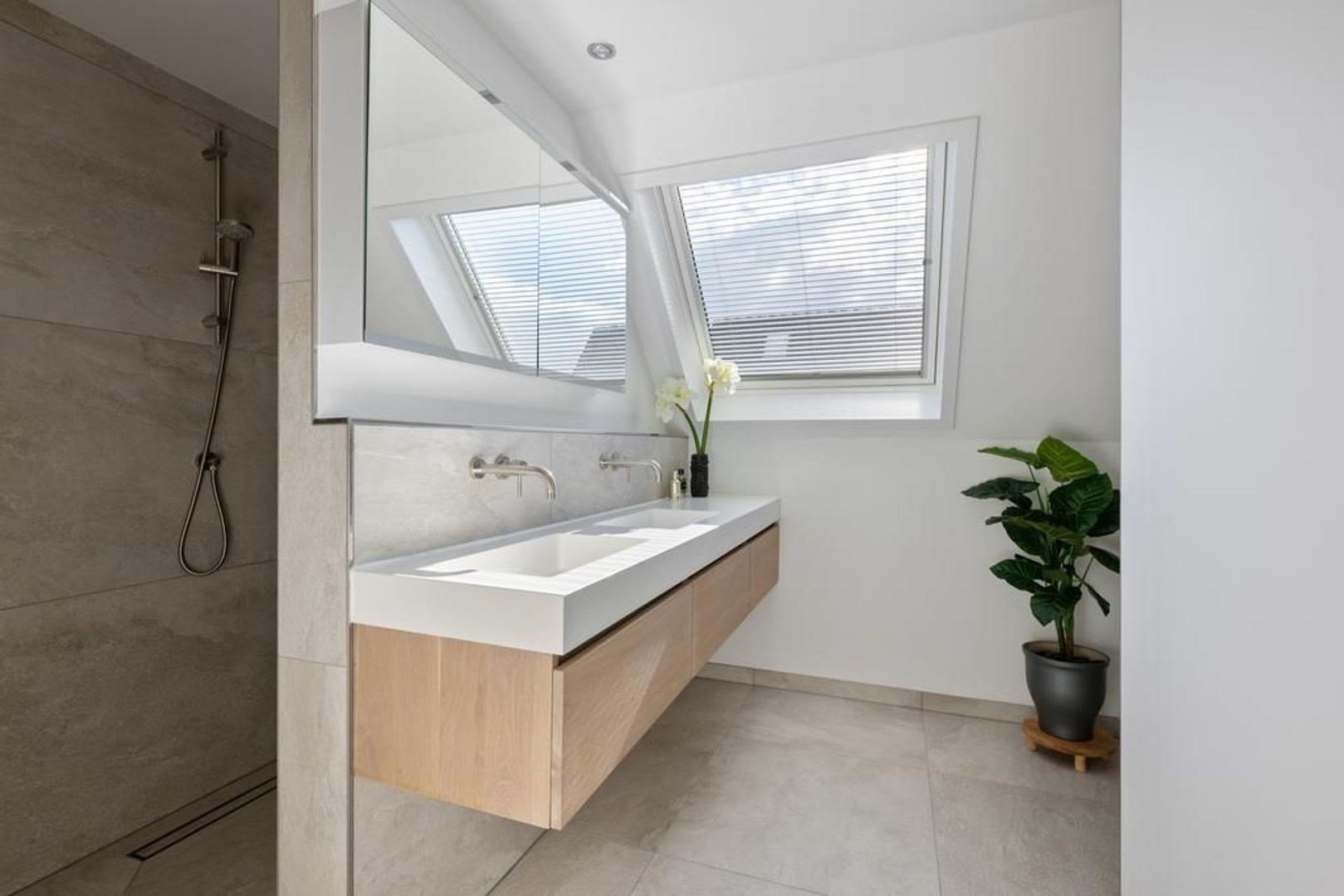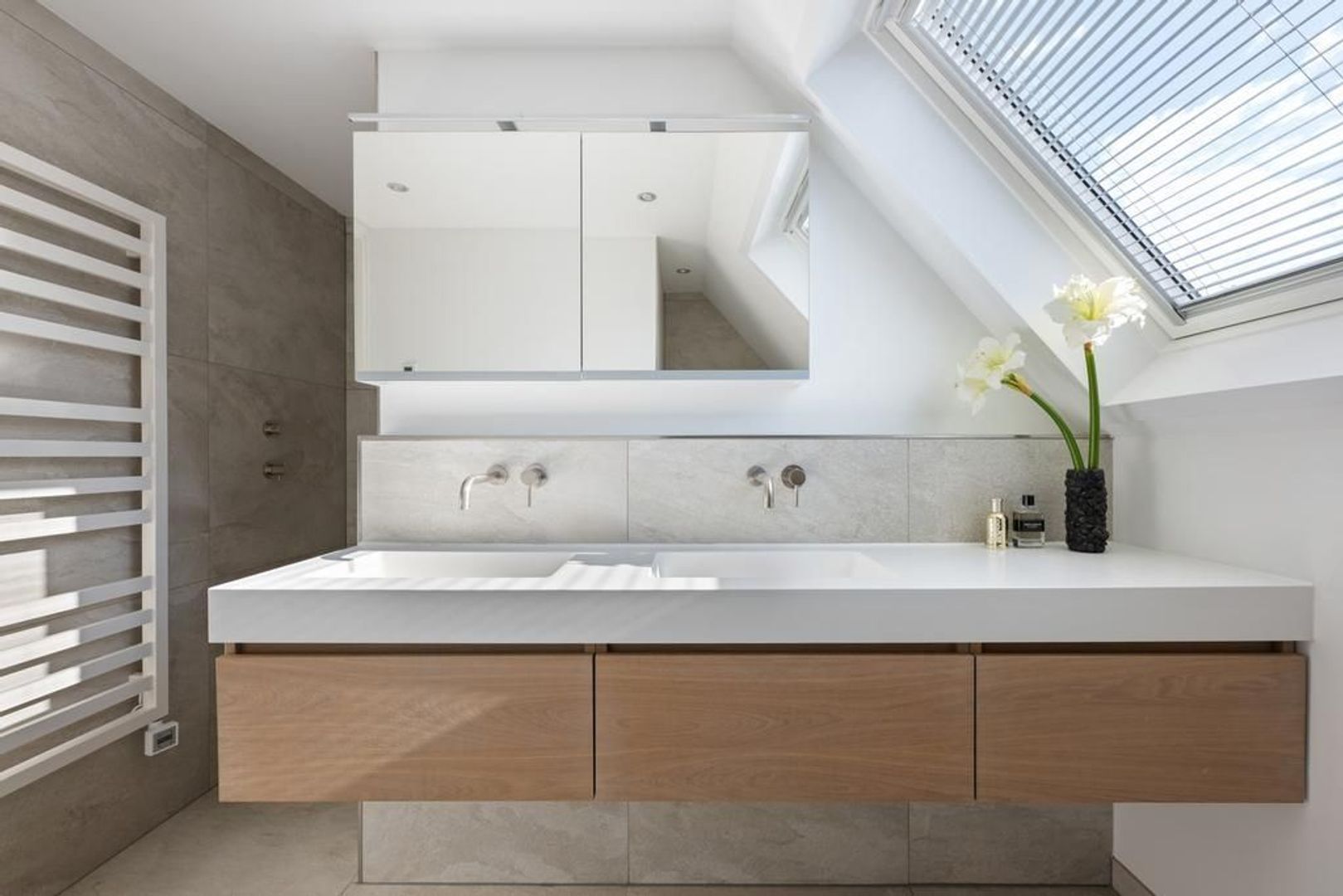 De badkamer is uitgerust met vloerverwarming, een inloopdouche, een dubbele wastafel met meubel en een urinoir.