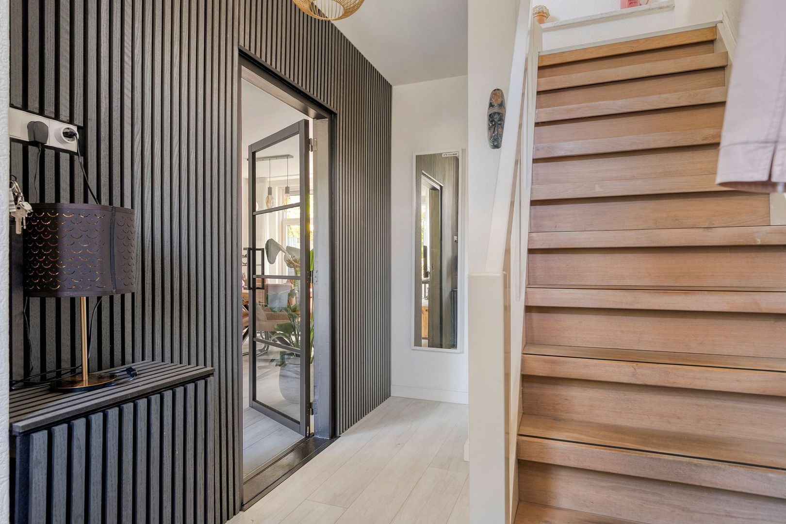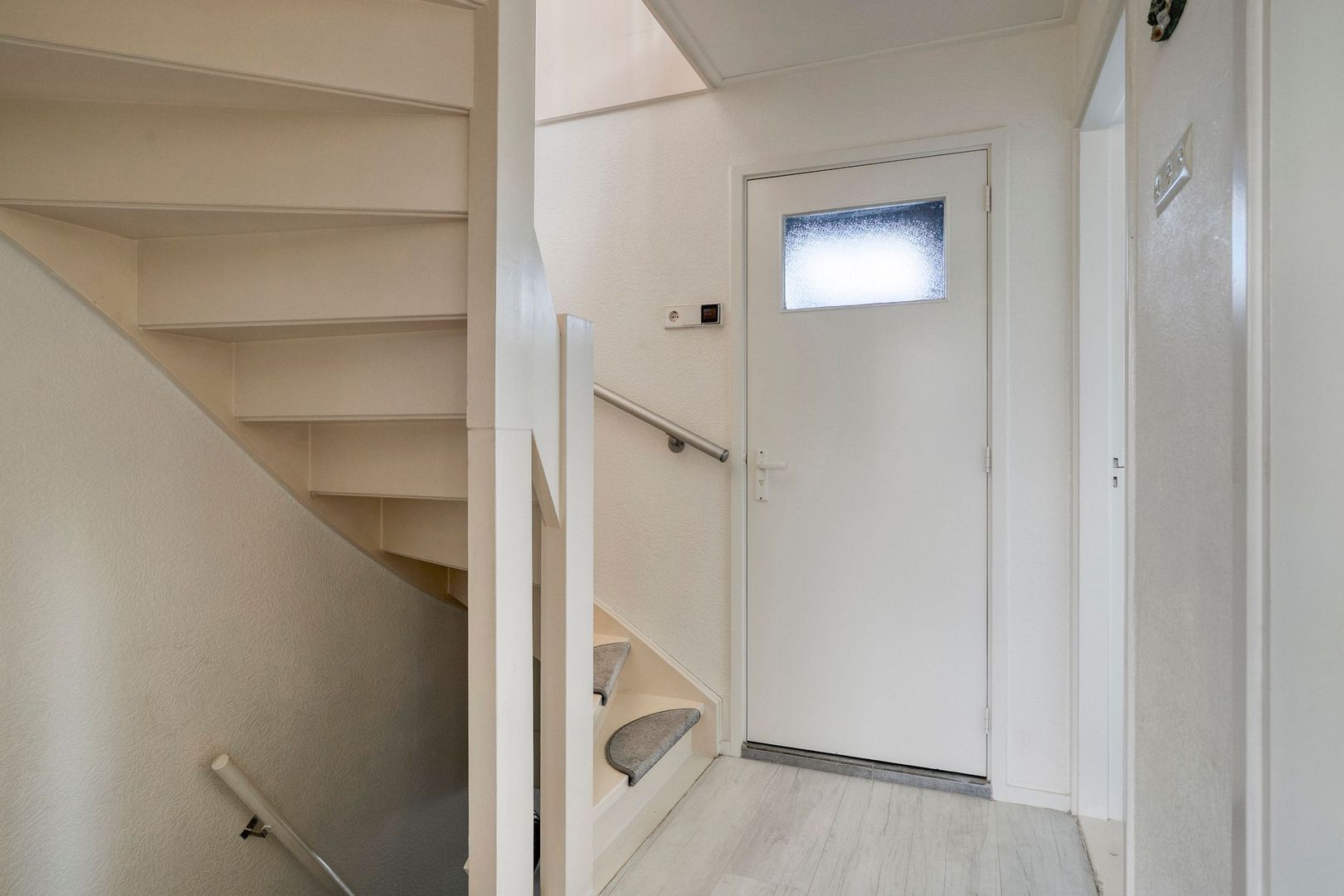 Entree, hal met meterkast, toilet, trapopgang naar de 1e verdieping en toegang tot de woonkamer.