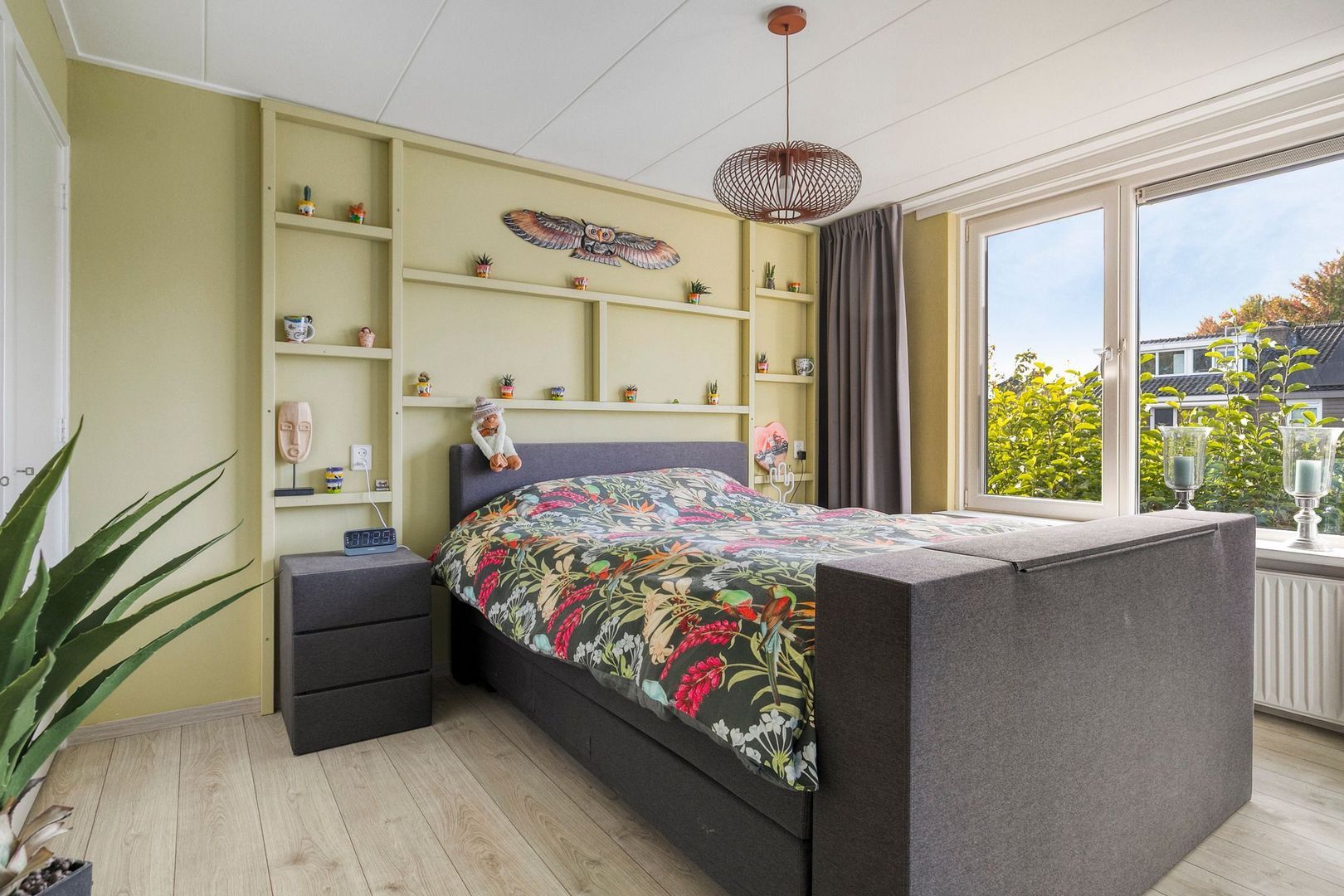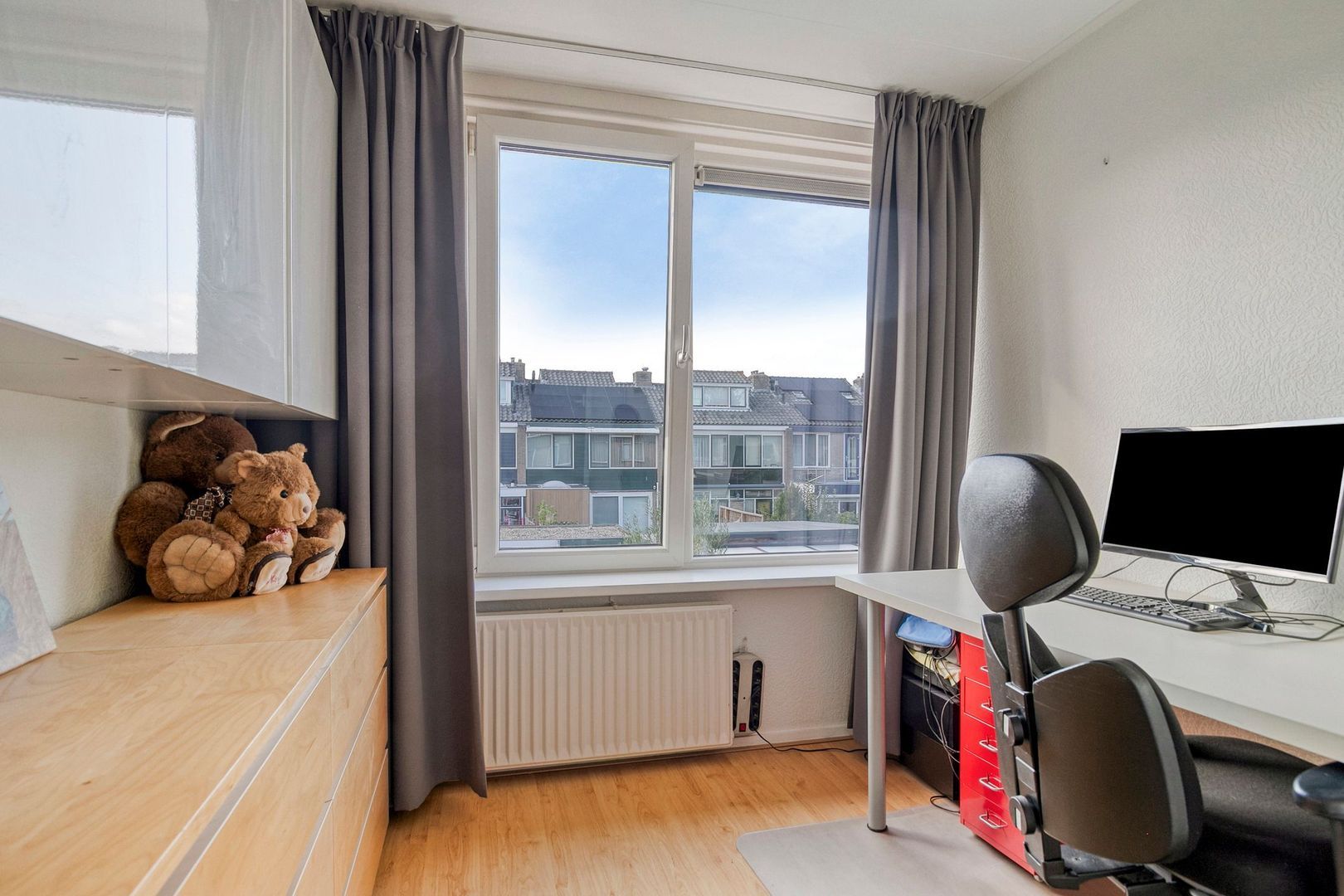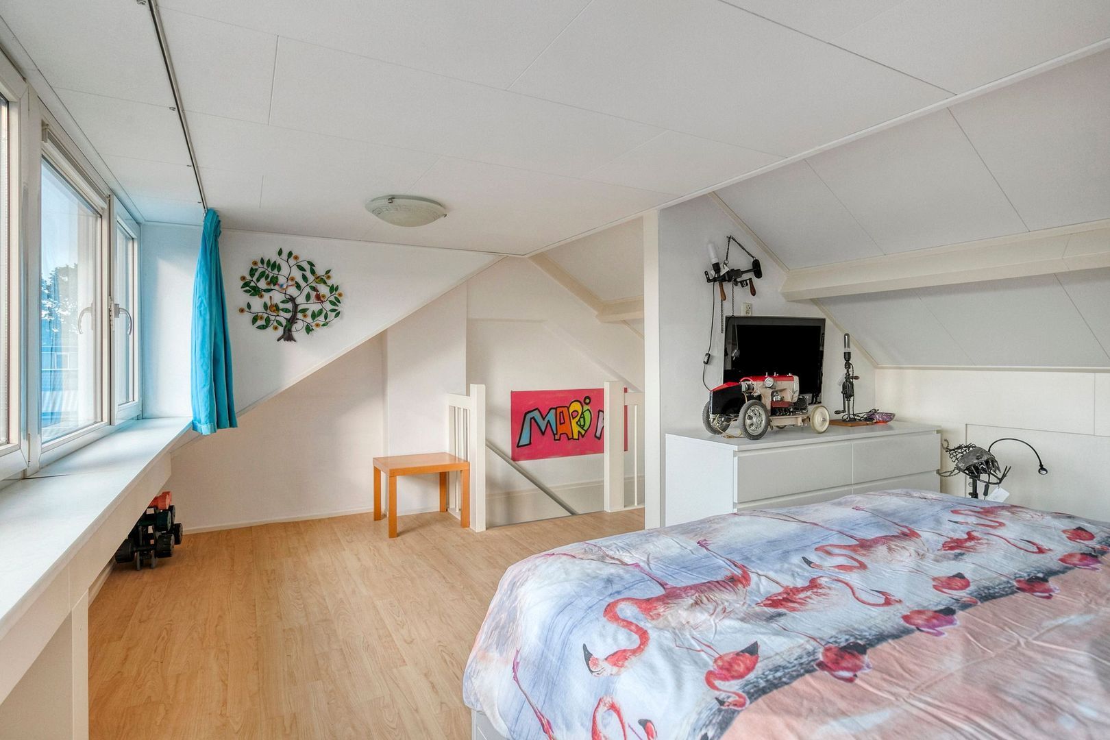 Ruime vierde slaapkamer met dakkapel en knieschotten voor extra bergruimte. Hier bevindt zich ook de opstelplaats van de cv-ketel (2023).