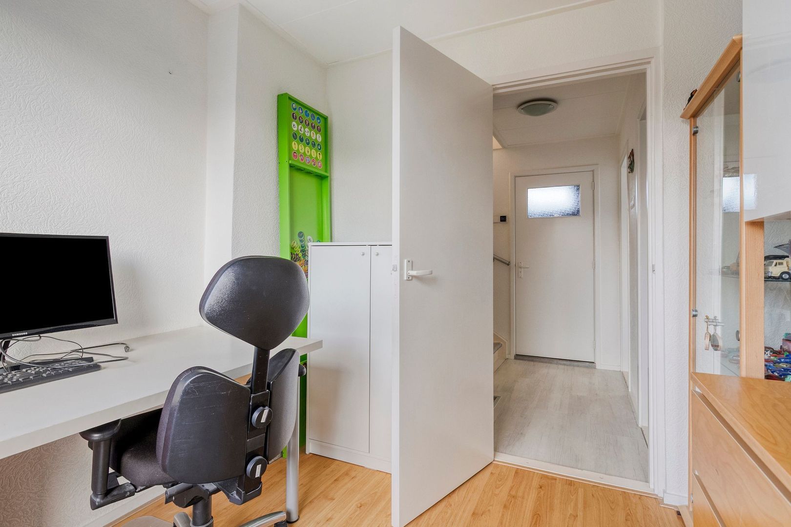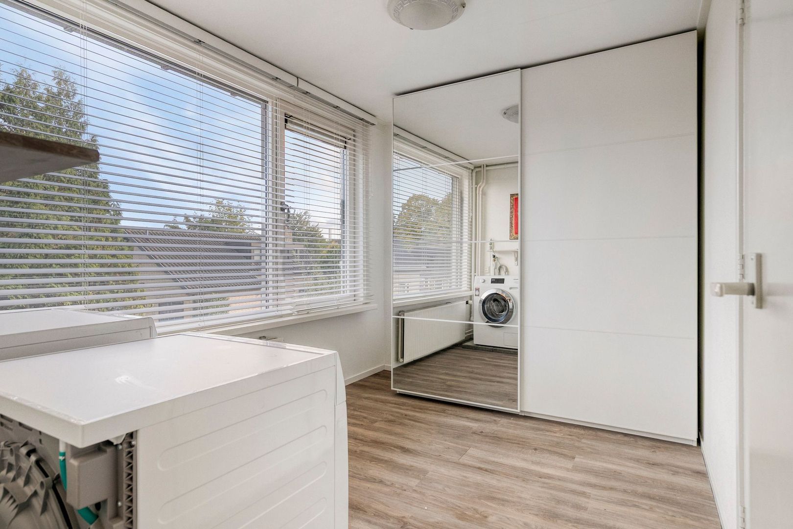 Slaapkamer 3 (ca. 2.51 x 3.59m) gelegen aan de voorzijde en is voorzien van vaste kasten. Hier bevindt zich ook de aansluitingen voor de wasmachine en droger.