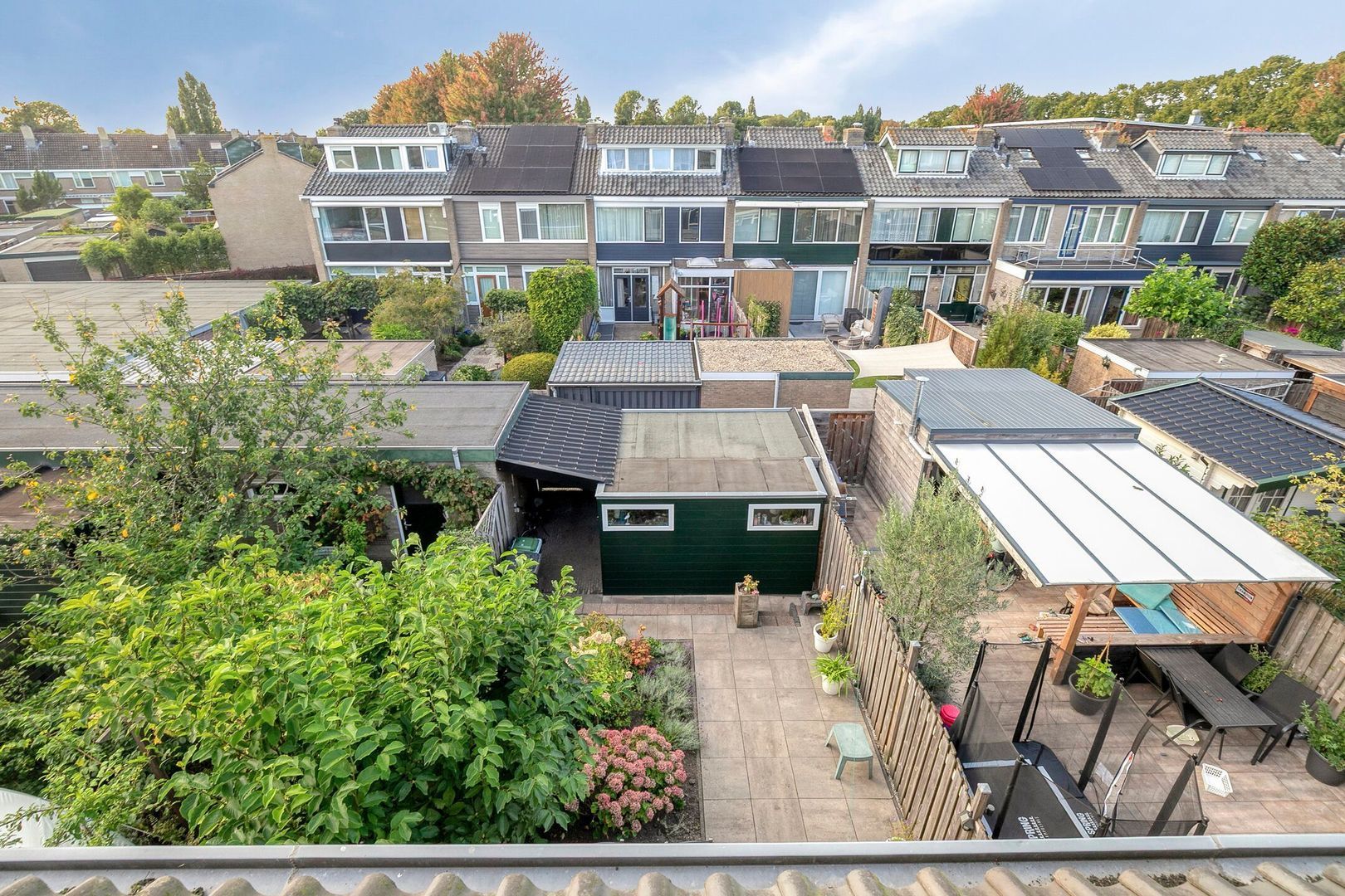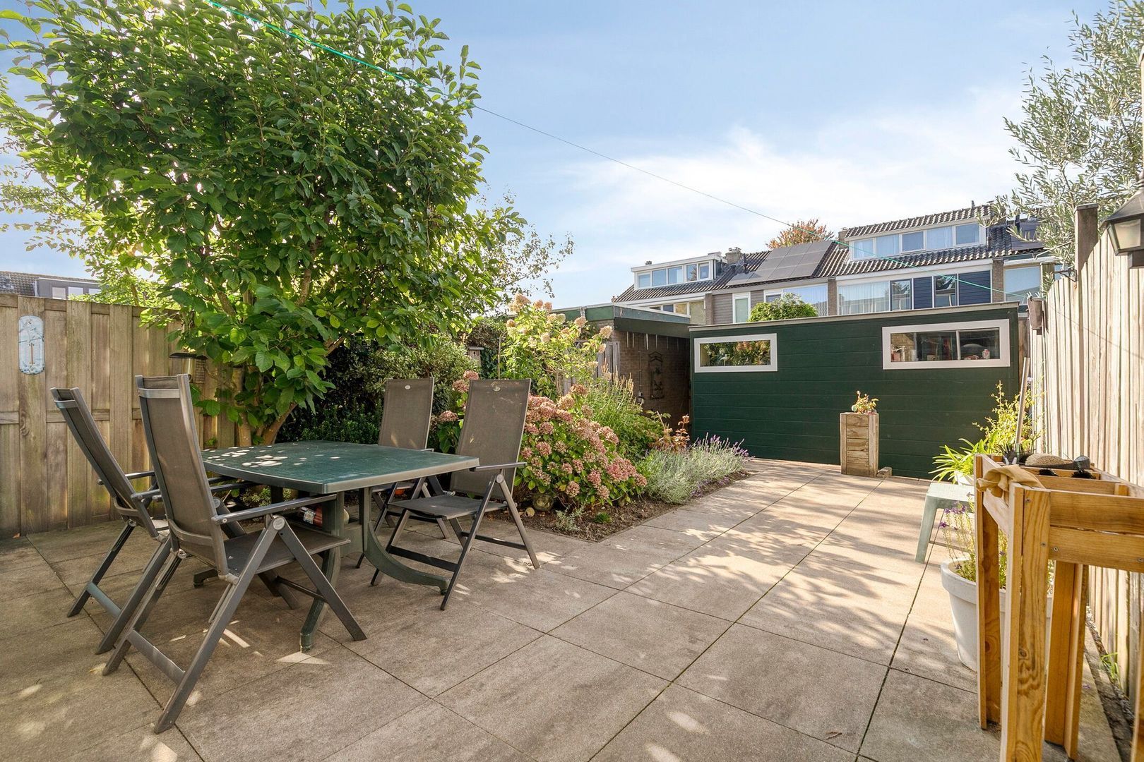 De achtertuin is gelegen op het noordwesten en is fraai aangelegd met beplanting, waaronder een prachtige magnoliaboom. Er is een zonnescherm aanwezig en een zeer royale uitgebouwde berging, ideaal voor fietsen en extra bergruimte. De tuin biedt veel privacy en ruimte om te ontspannen of te spelen.