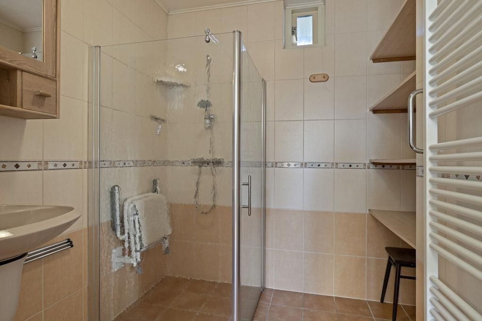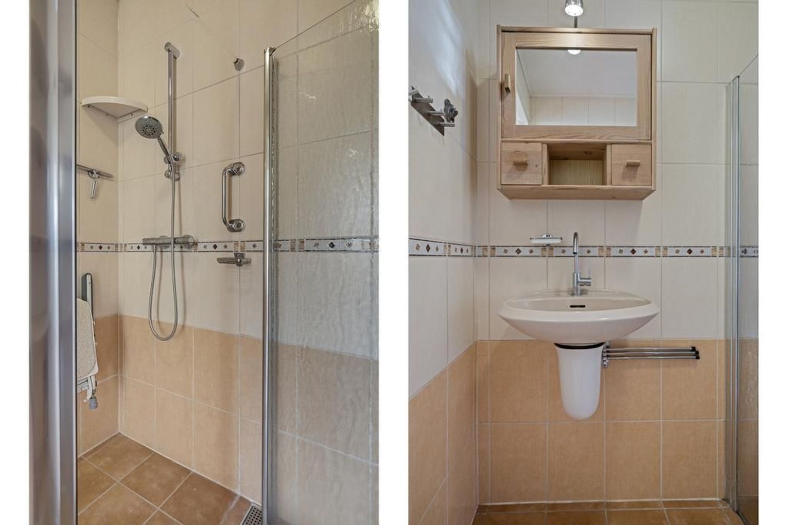 De badkamer is voorzien van wastafel met mengkraan en douchcabine.