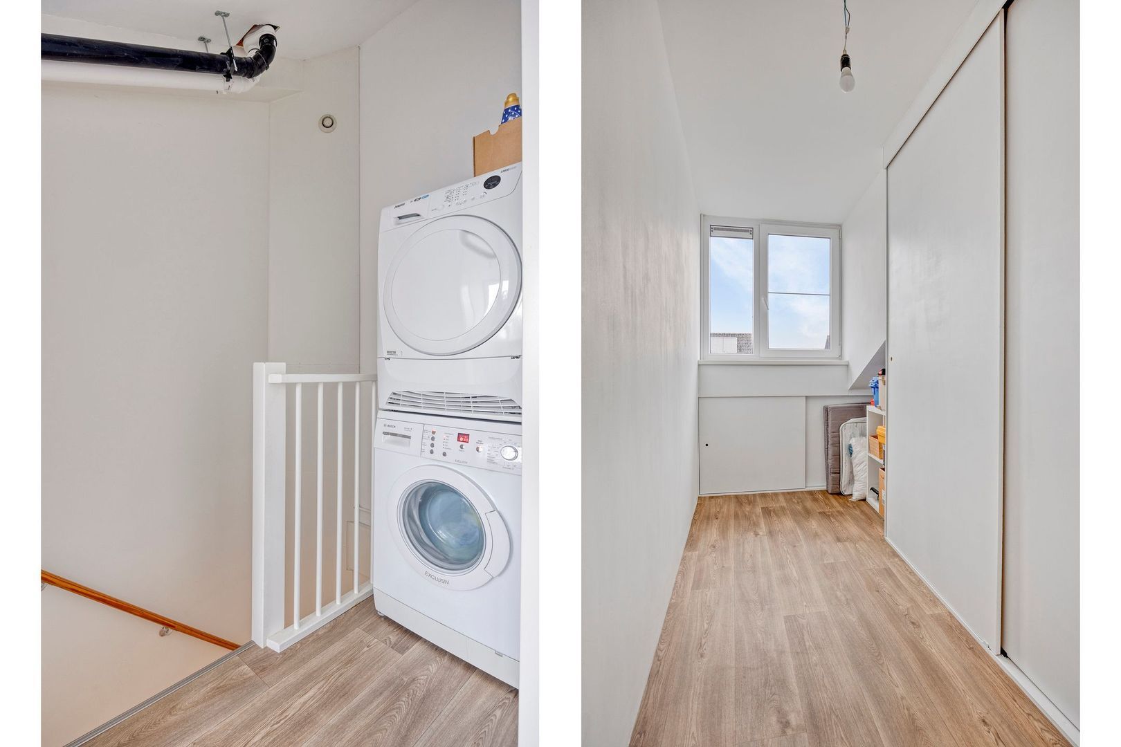 Voorzolder met aansluiting voor wasmachine en droger. Op de overloop bevindt zich een praktische ingebouwde schuifkast, ideaal voor extra opbergruimte. Hier zijn tevens de cv-ketel (2024) en de omvormer van de zonnepanelen geplaatst.