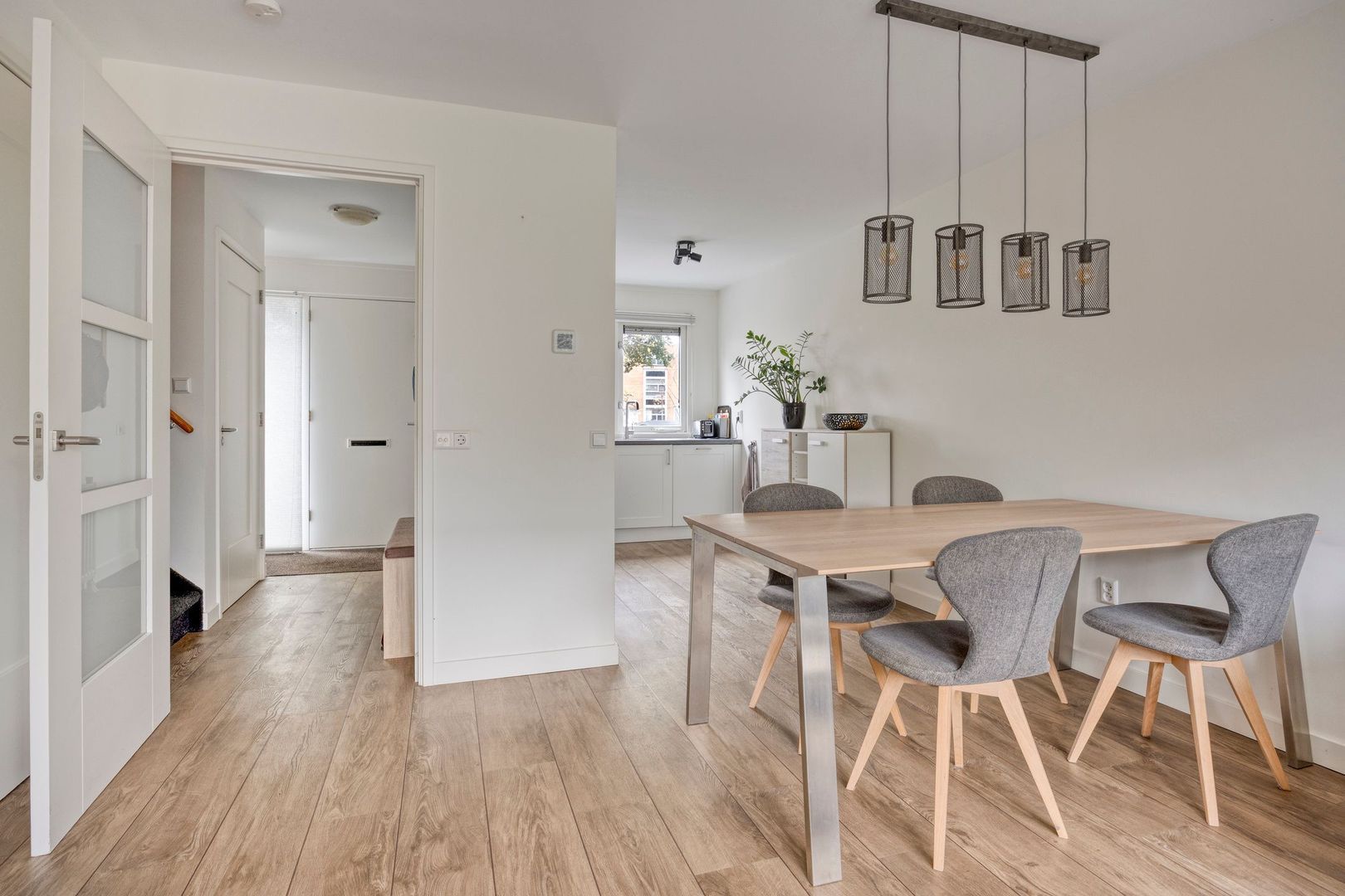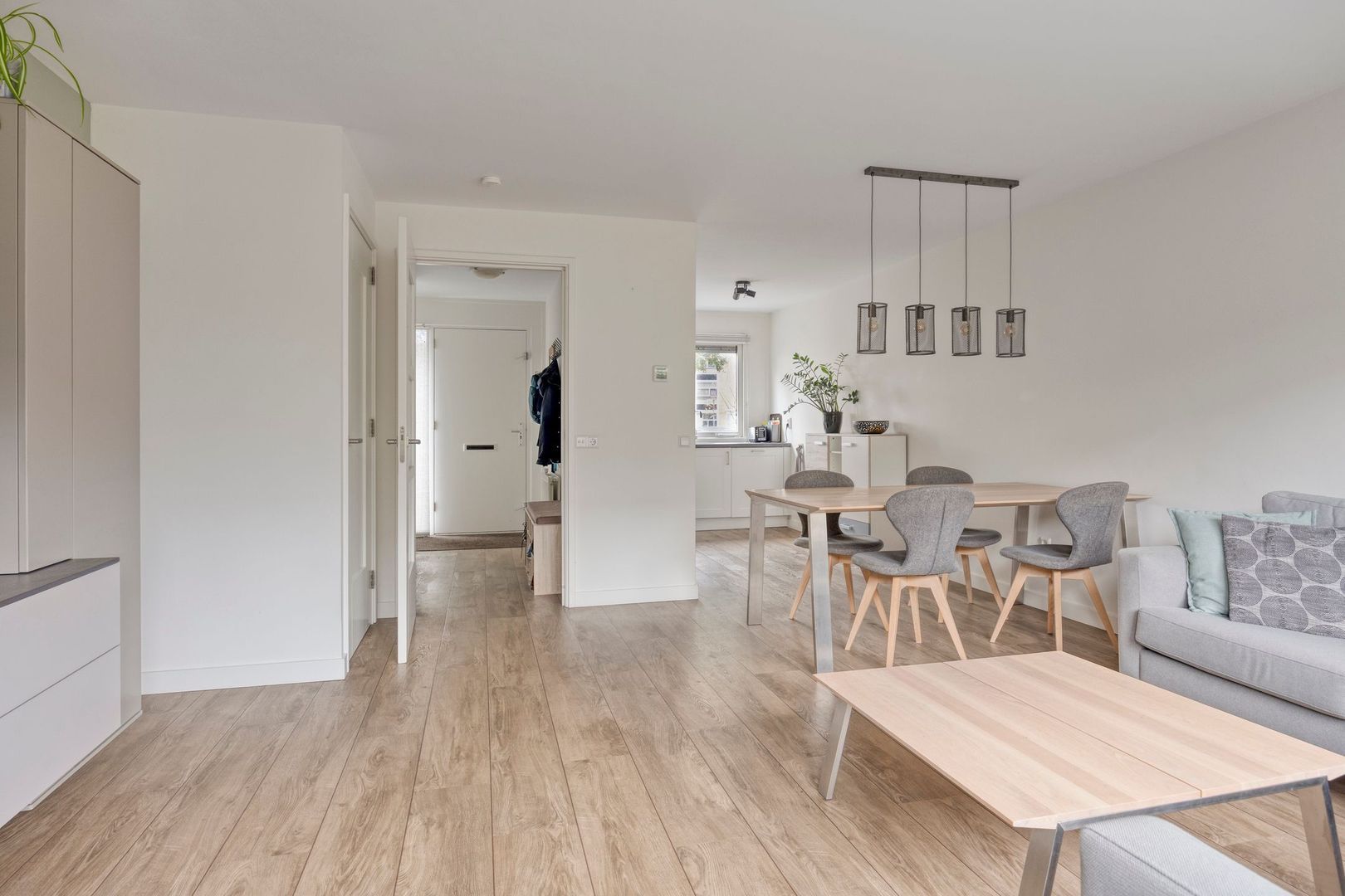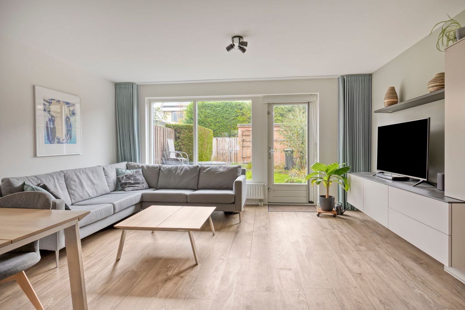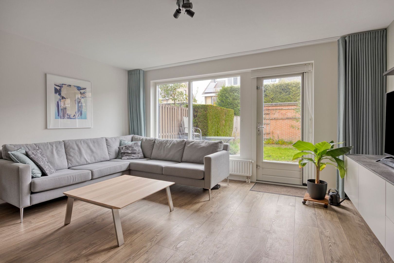 De ruime, tuingerichte woonkamer beschikt over een handige trapkast en is afgewerkt met een fraaie pvc-vloer met vloerverwarming. Vanuit de woonkamer stap je de zonnige achtertuin in, gelegen op het noordoosten, voorzien van een achterom en berging.