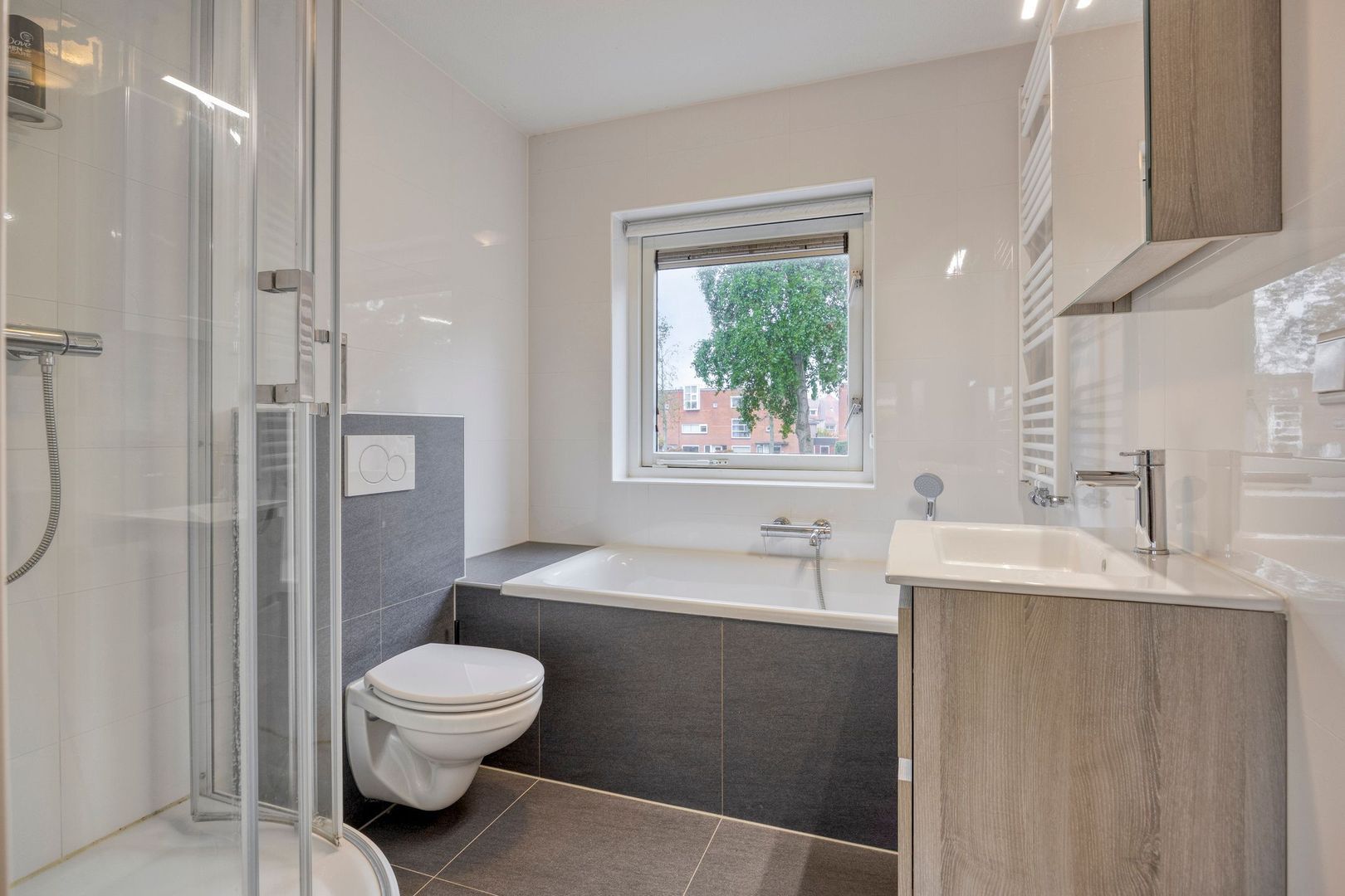 De moderne badkamer (ca. 5 m²) beschikt over een ligbad, douche, designradiator, hangcloset en een wastafel met wandspiegel. Lichte wandtegels in combinatie met donkere vloer- en bad afwerkingen geven de ruimte een luxe uitstraling.