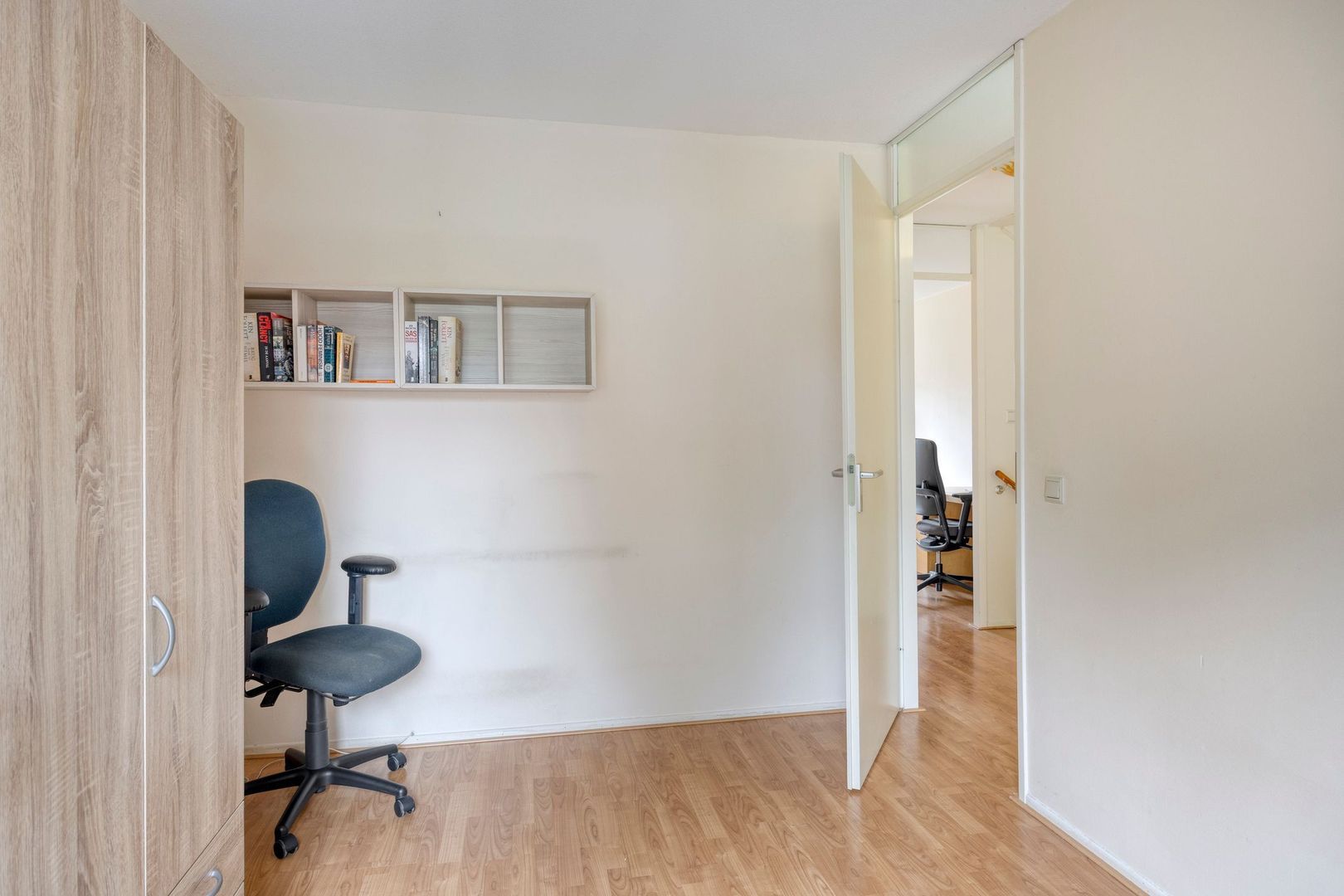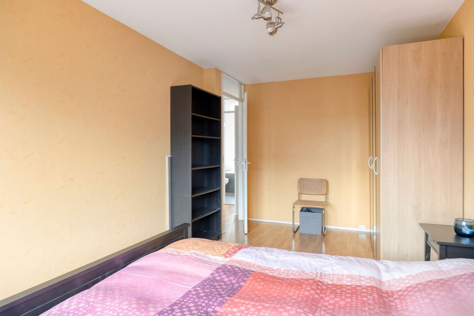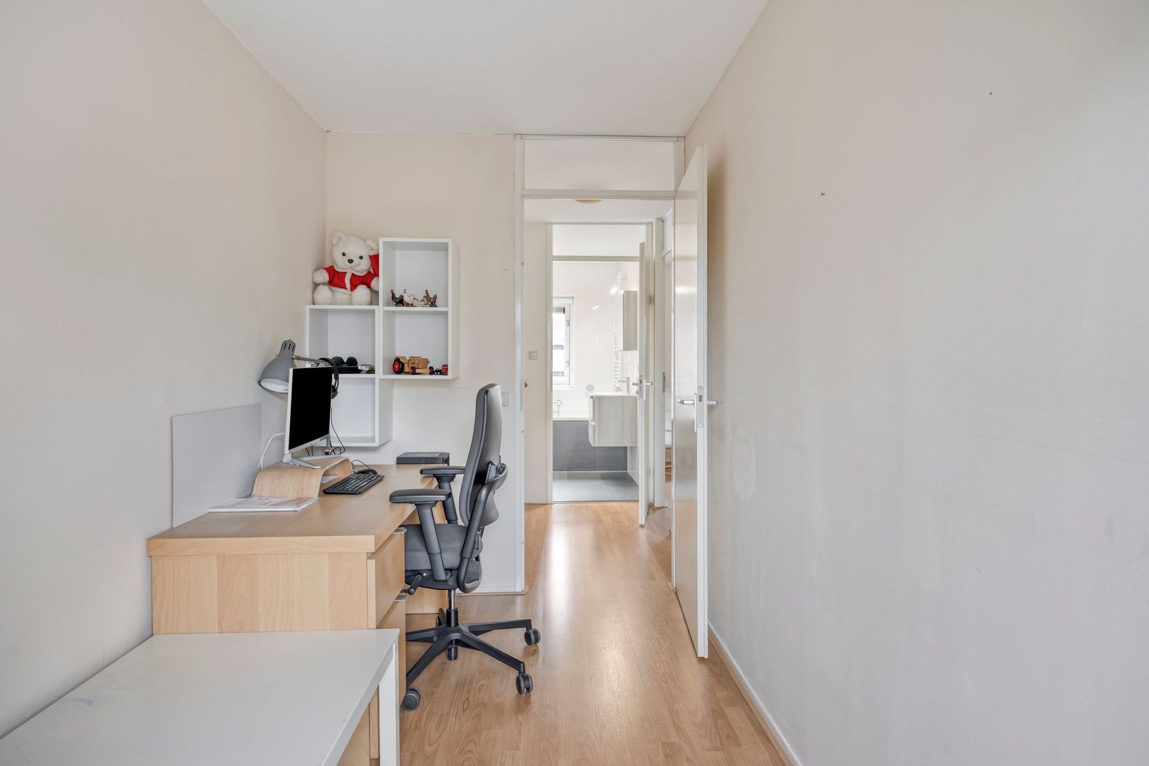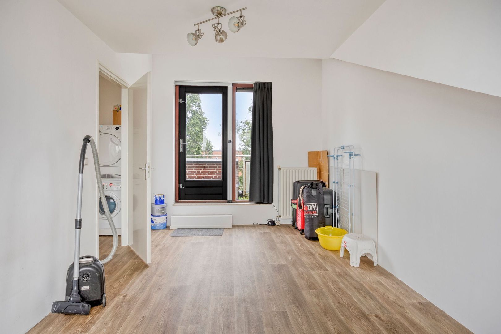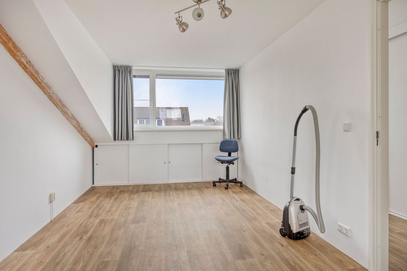De ruime slaapkamer (ca. 19 m²) is voorzien van een dakkapel en handige knieschotten. Vanuit deze kamer bereik je het dakterras.
