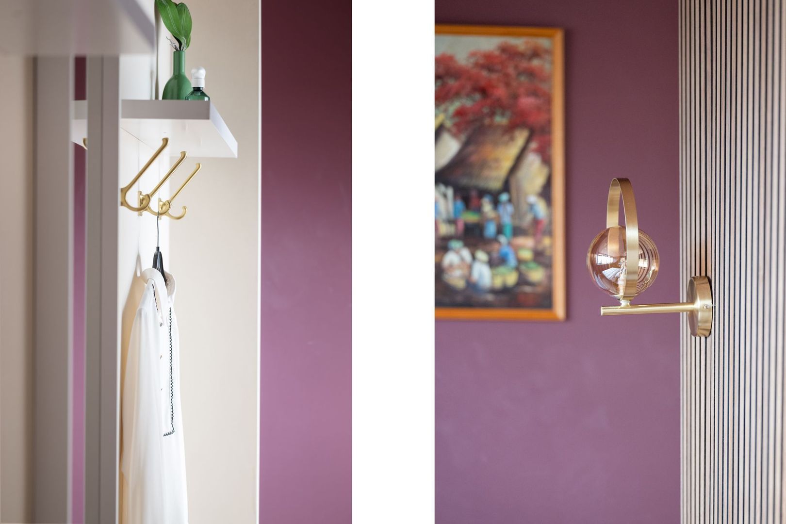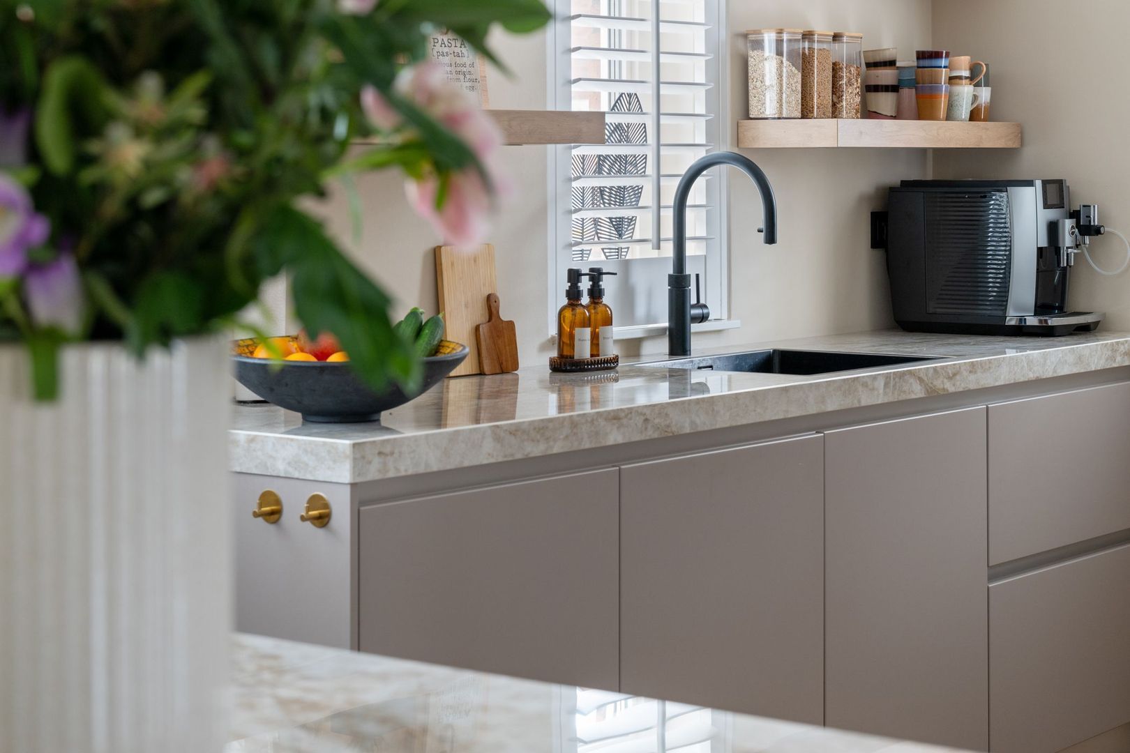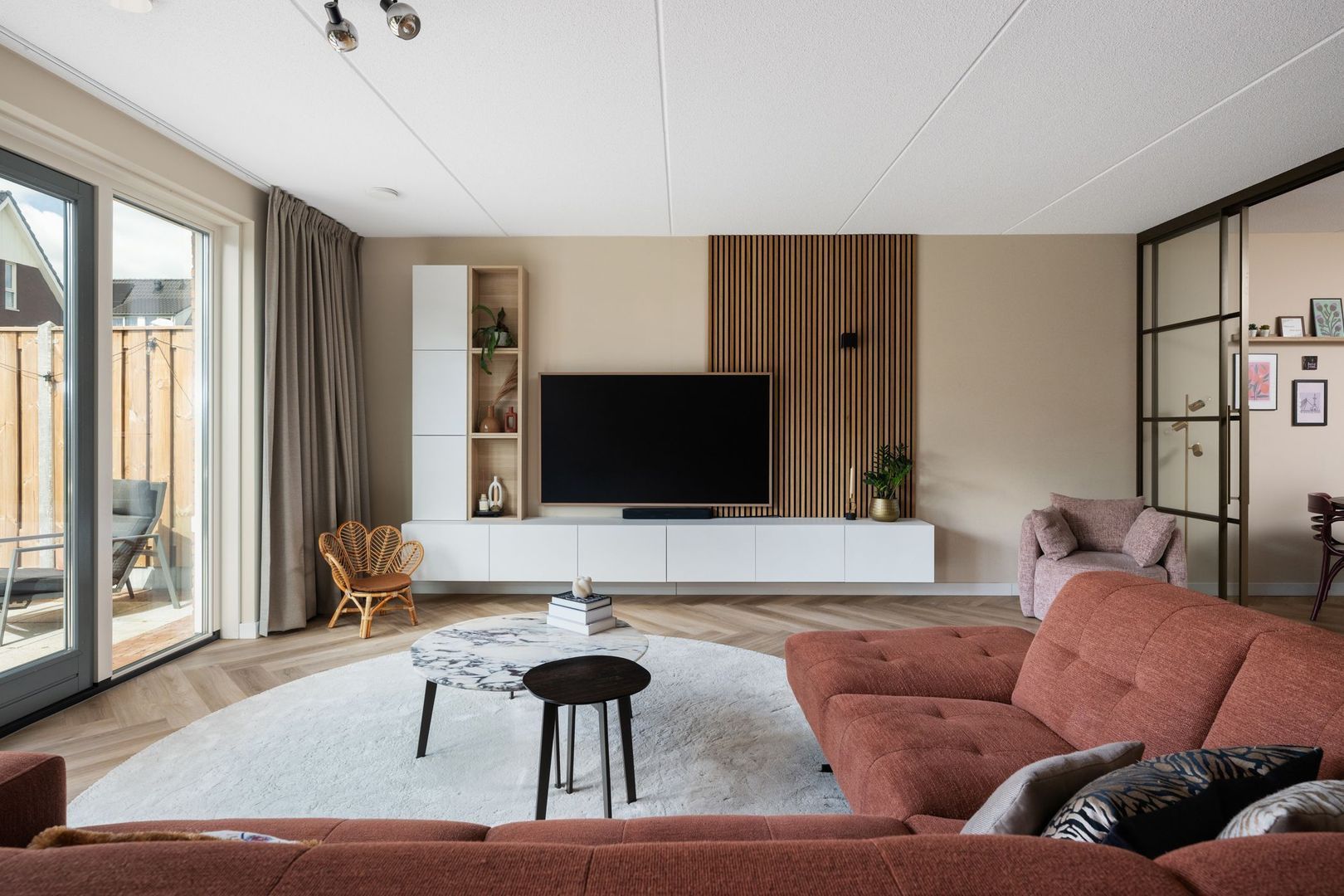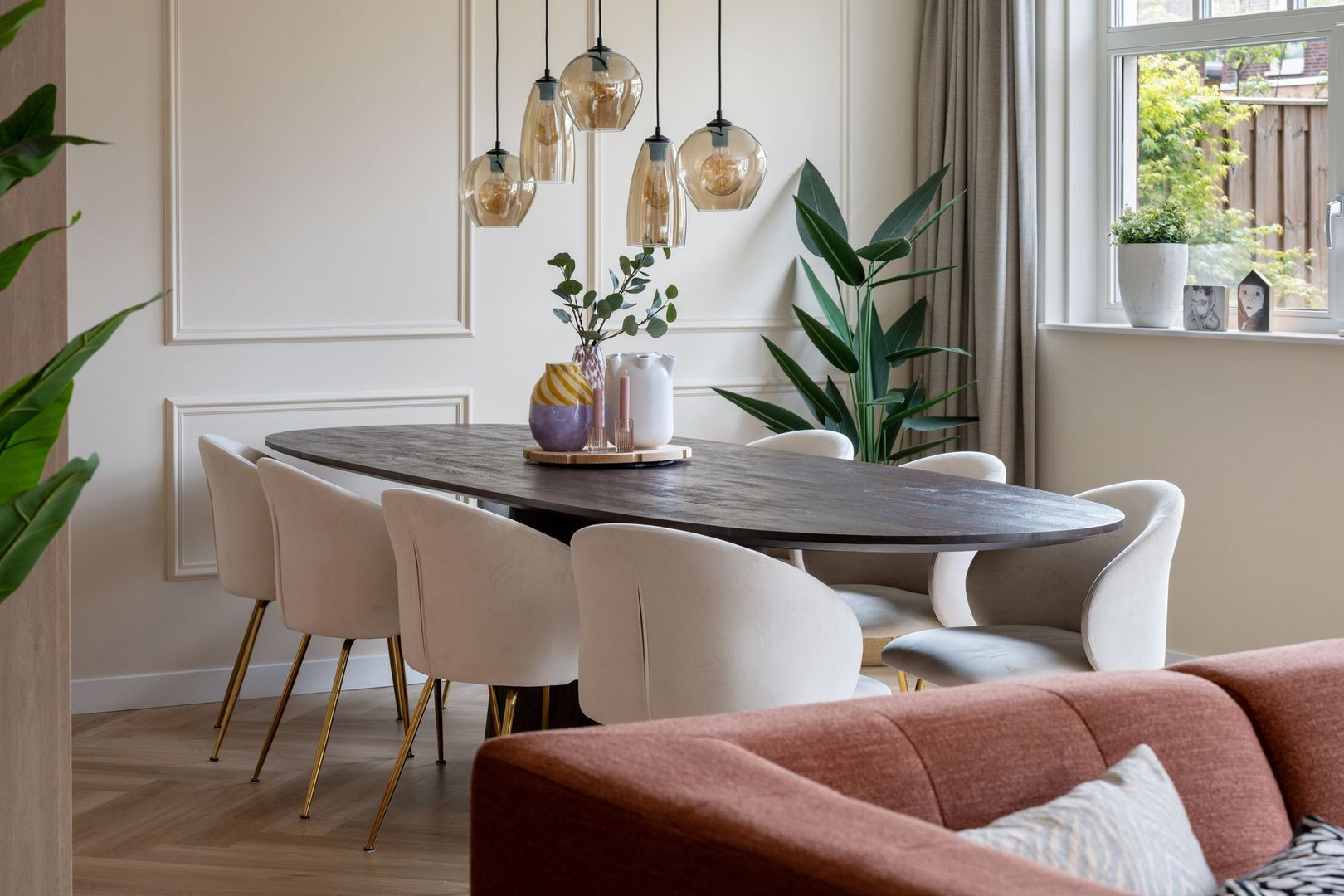 Wat deze leefruimte extra bijzonder maakt, zijn de elegante koperkleurige stalen schuifdeuren die de woonkamer en keuken op subtiele en stijlvolle wijze van elkaar scheiden. Ze zorgen voor een speelse indeling, zonder het gevoel van ruimte en licht te verliezen.