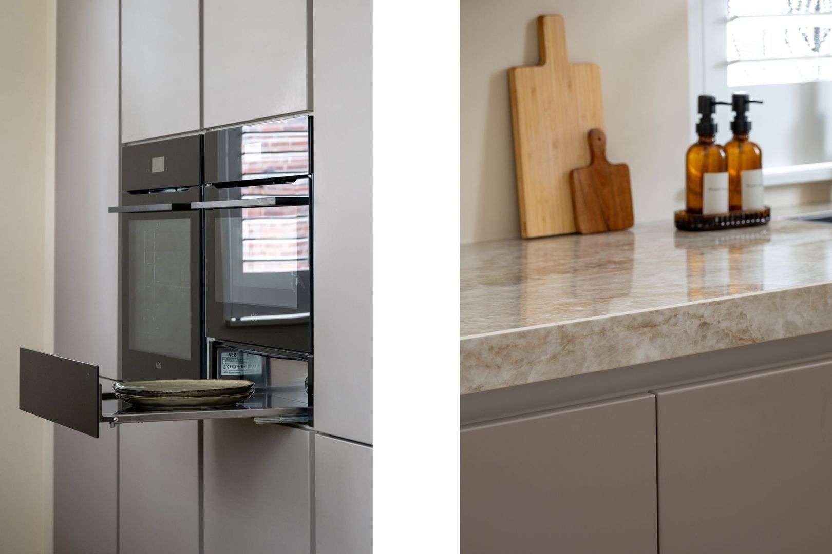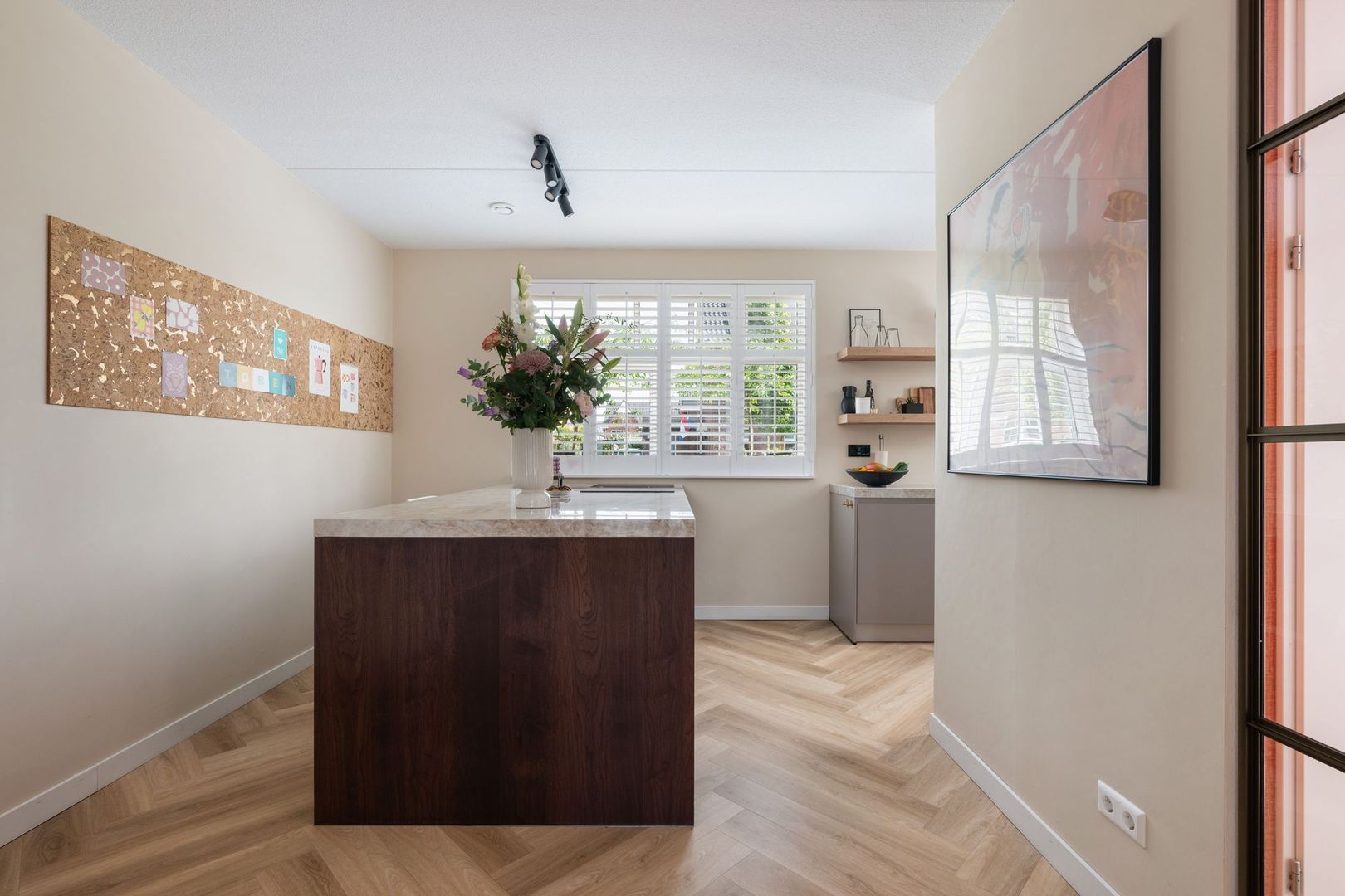 De sfeervolle woonkamer is opvallend licht en ruim opgezet, met het zitgedeelte aan de achterzijde van de woning. Aan de voorzijde vind je de royale leefkeuken met een stijlvol kookeiland, afgewerkt met een luxueus marmeren werkblad. De keuken is volledig uitgerust met hoogwaardige inbouwapparatuur, waaronder een inductiekookplaat met geïntegreerde afzuiging, oven, combi-magnetron, warmhoudlade, Quooker, koel-vriescombinatie en een vaatwasser.