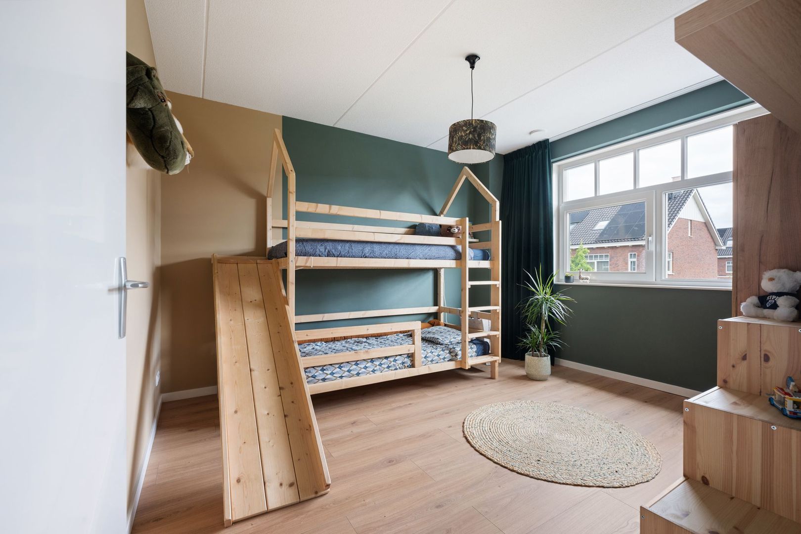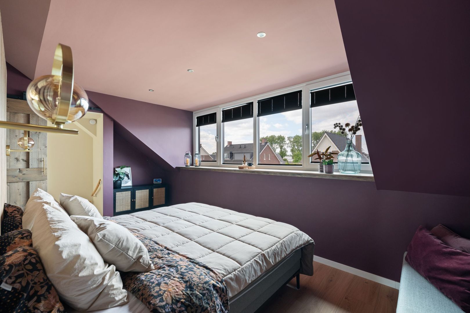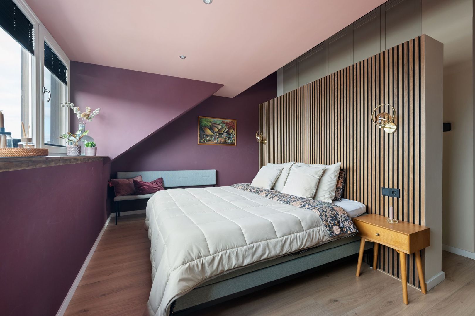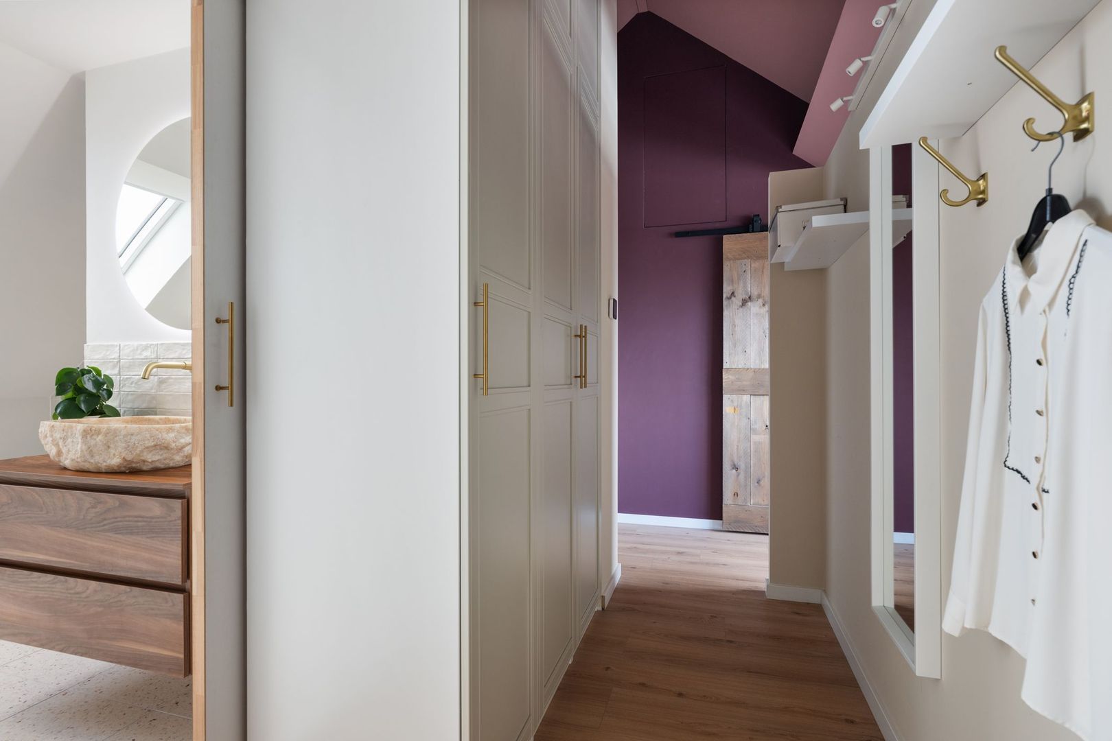 Wat deze kamer tevens bijzonder maakt, is de indrukwekkende hoeveelheid kastruimte die doorloopt tot aan de hoge nok van het huis. Deze op maat gemaakte oplossing biedt een zee aan opbergruimte, prachtig weggewerkt en toch altijd binnen handbereik. Bovendien is bovenin de kamer extra bergruimte slim verwerkt in een verhoogde nis — ideaal voor koffers en seizoensspullen.
