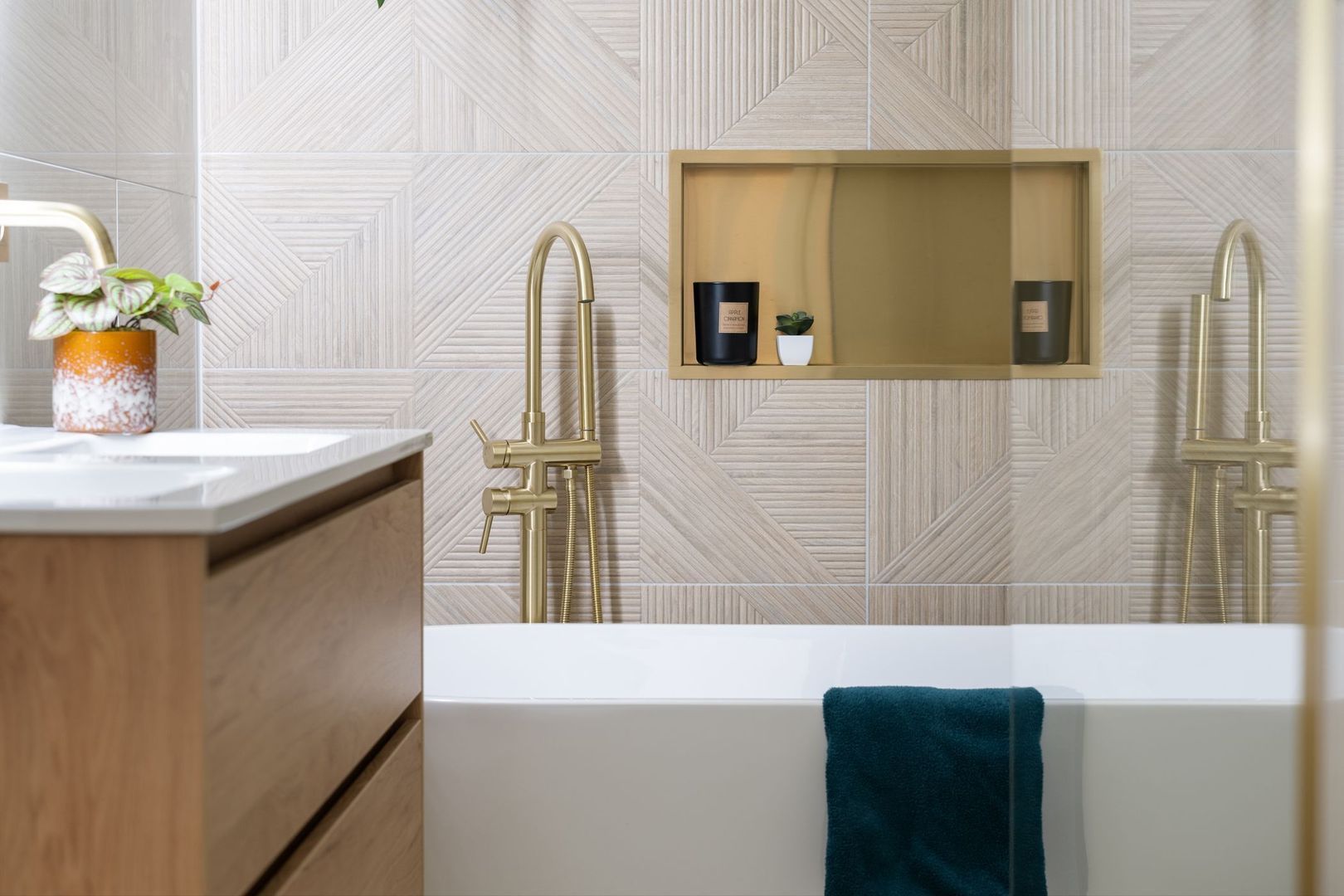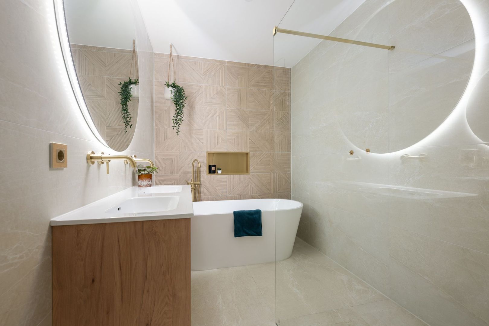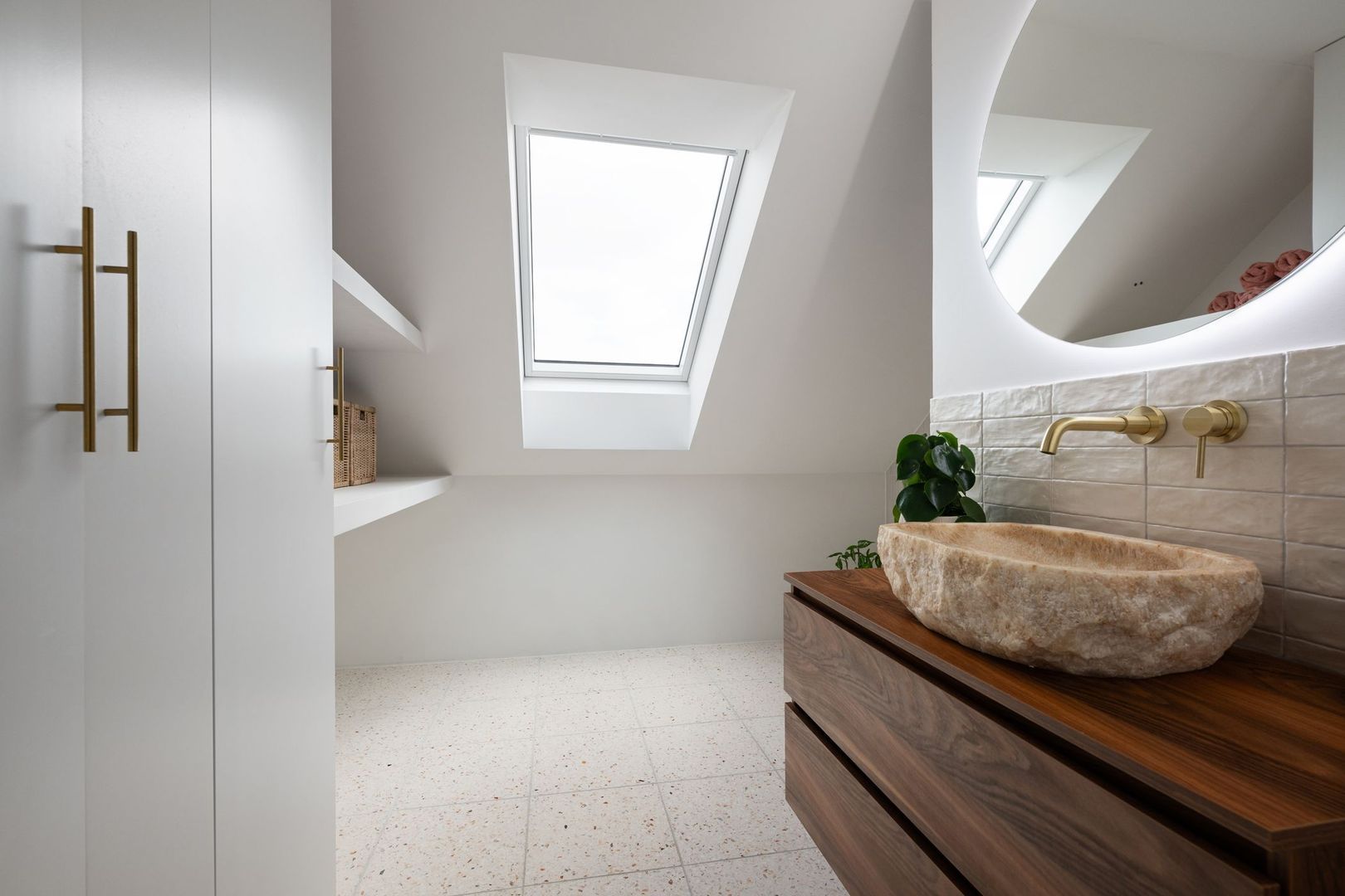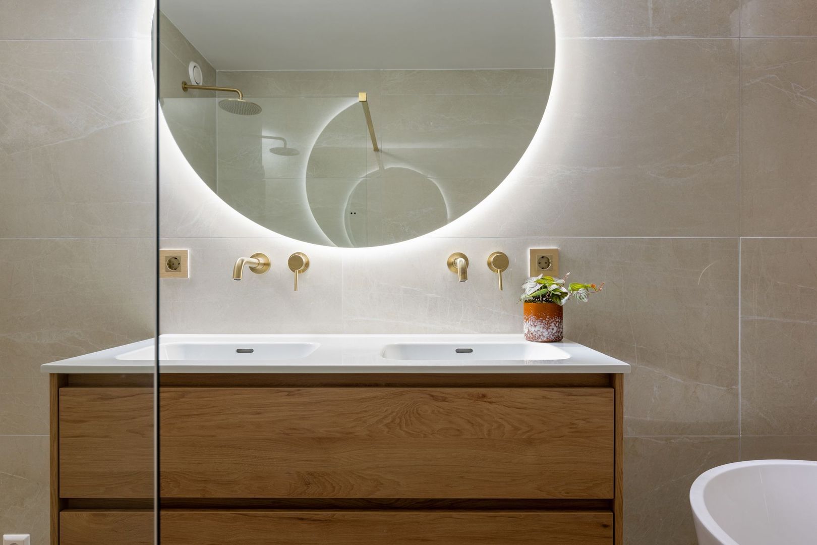 De moderne badkamer is een fijne, ontspannende plek met een luxe ligbad, een ruime inloopdouche en een dubbele wastafel. Alles is tot in detail afgewerkt, zodat je hier elke dag in alle rust kunt opstarten of afsluiten.