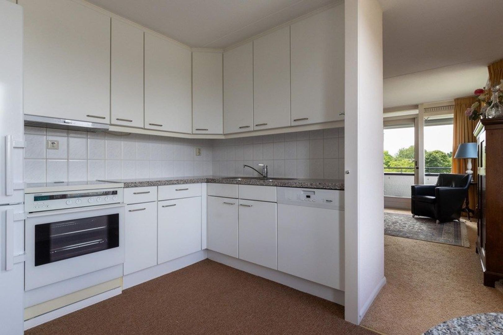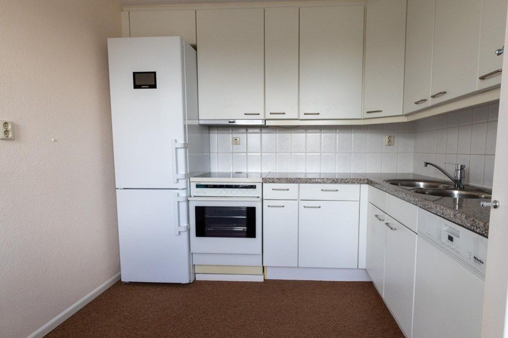 Vanuit de woonkamer toegang tot de semi-open keuken met dubbele spoelbak met mengkraan, koel/vries-combinatie, fornuis met keramische kookplaat en elektrische oven, wasemkap en vaatwasmachine.
