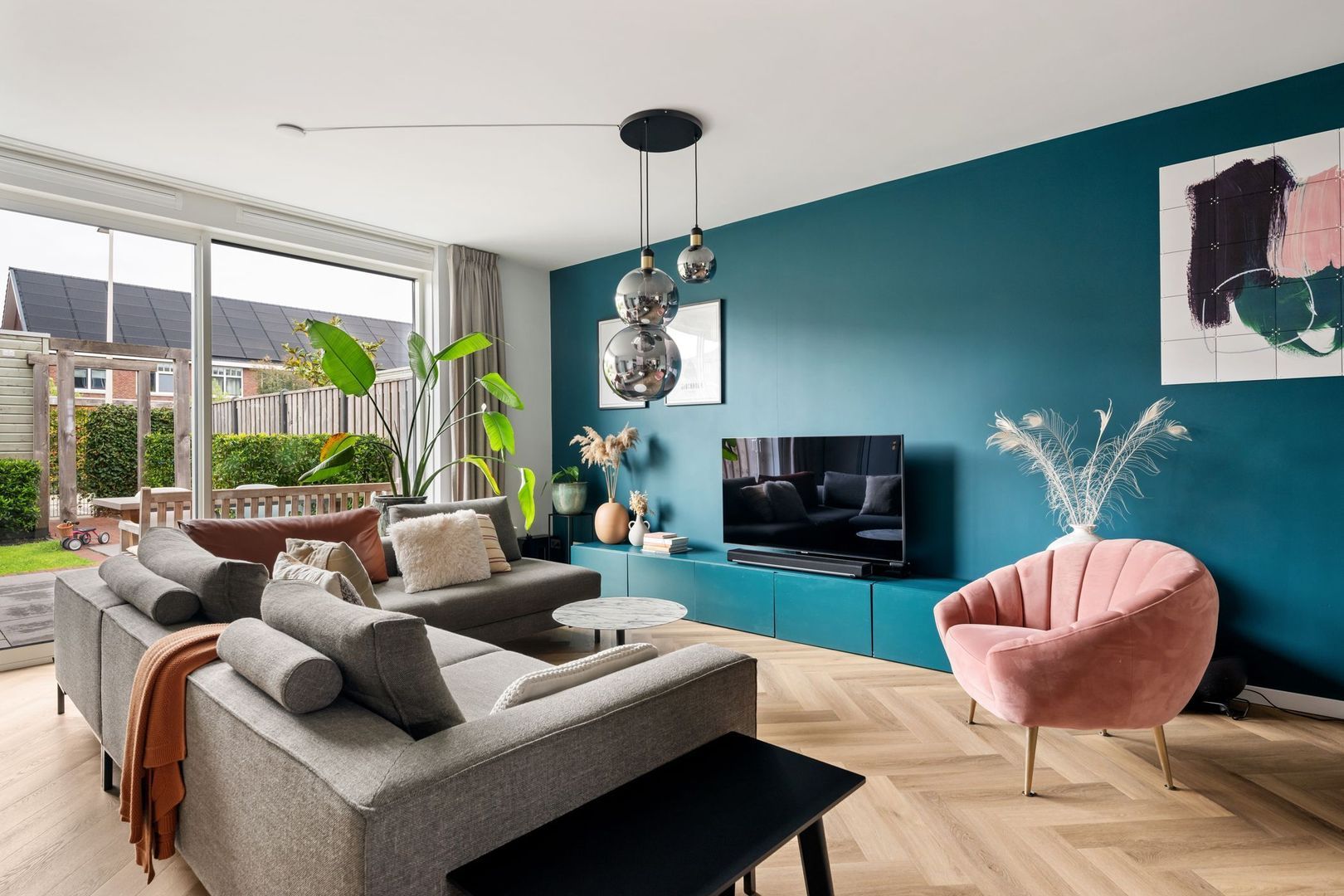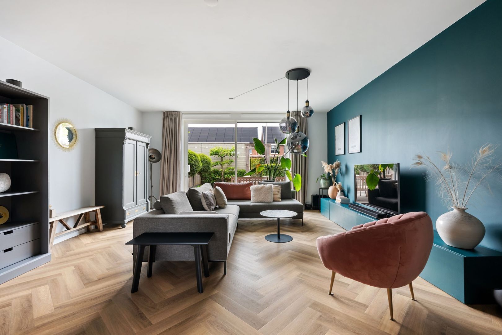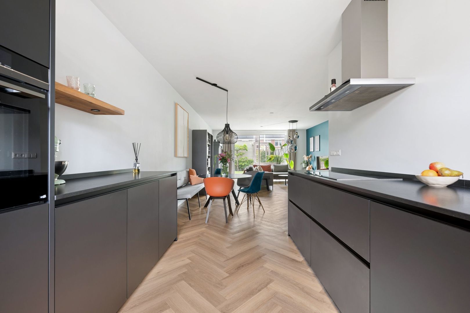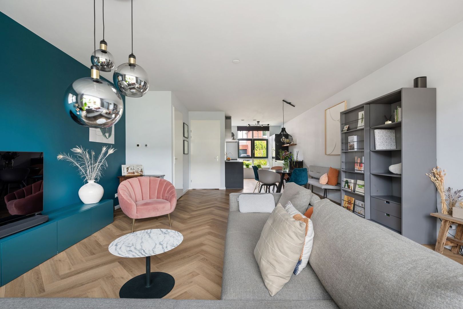 De ruime, lichte woonkamer is voorzien van een vissengraat pvc-vloer en heeft een schuifpui naar de tuin. De open keuken aan de voorzijde is uitgerust met diverse inbouwapparatuur, zoals een vaatwasser, koelkast, vriezer, inductiekookplaat, Quooker, combi-oven en spoelbak.