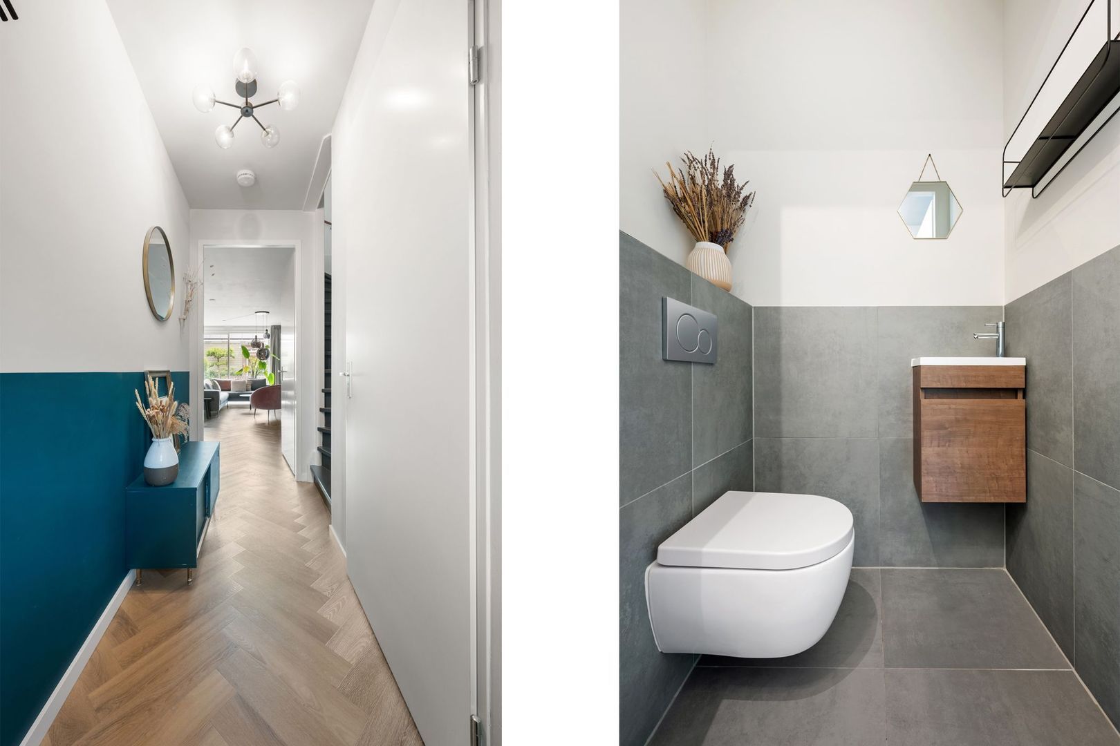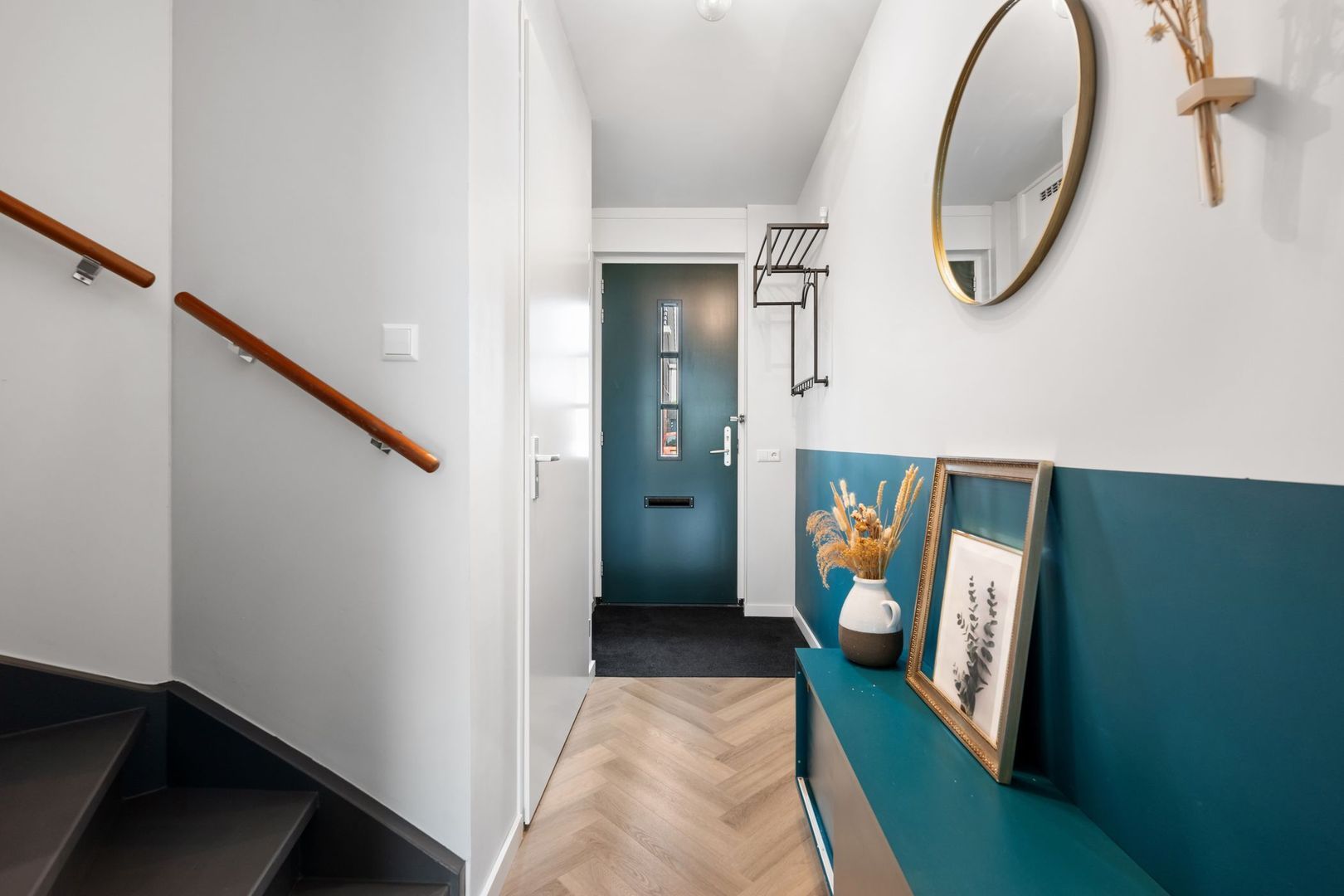 Entree, hal met meterkast, toilet, trapopgang naar de eerste verdieping en toegang tot de woonkamer.