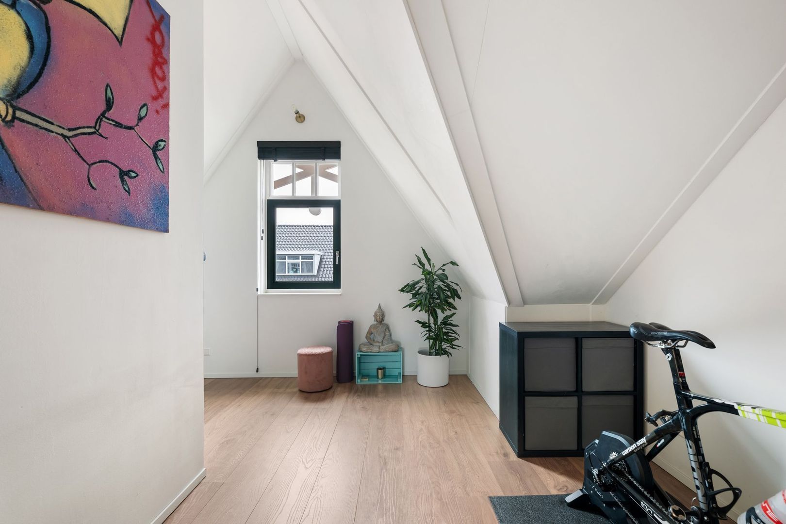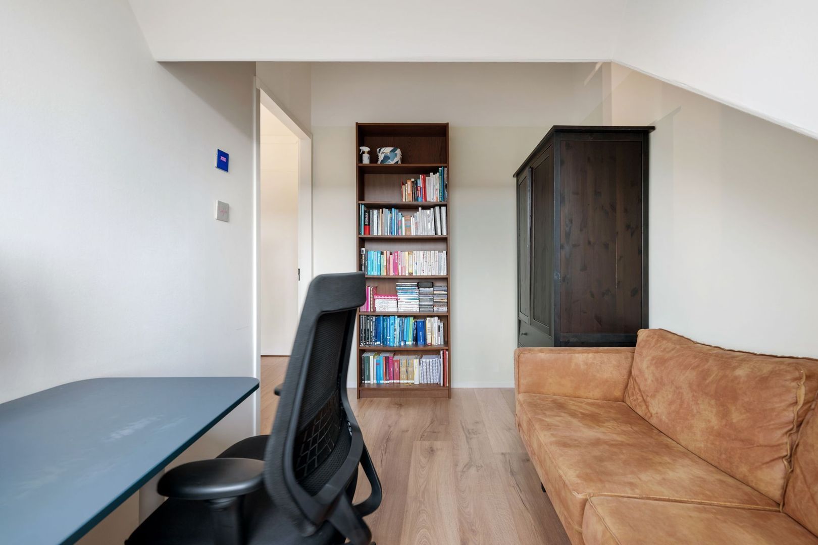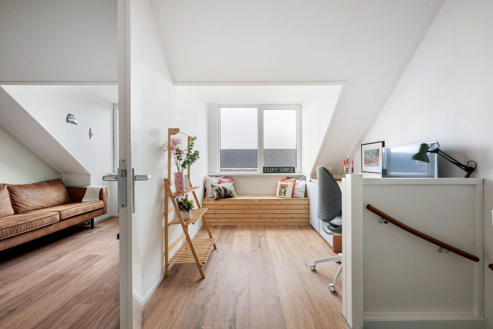De ruime overloop biedt toegang tot twee slaapkamers en een berging. In de berging bevinden zich de aansluitingen voor de wasmachine en droger, evenals de opstelplaats voor de cv-ketel. De twee lichte slaapkamers zijn ideaal voor verschillende doeleinden, zoals een werkplek, hobbyruimte of logeerkamer.