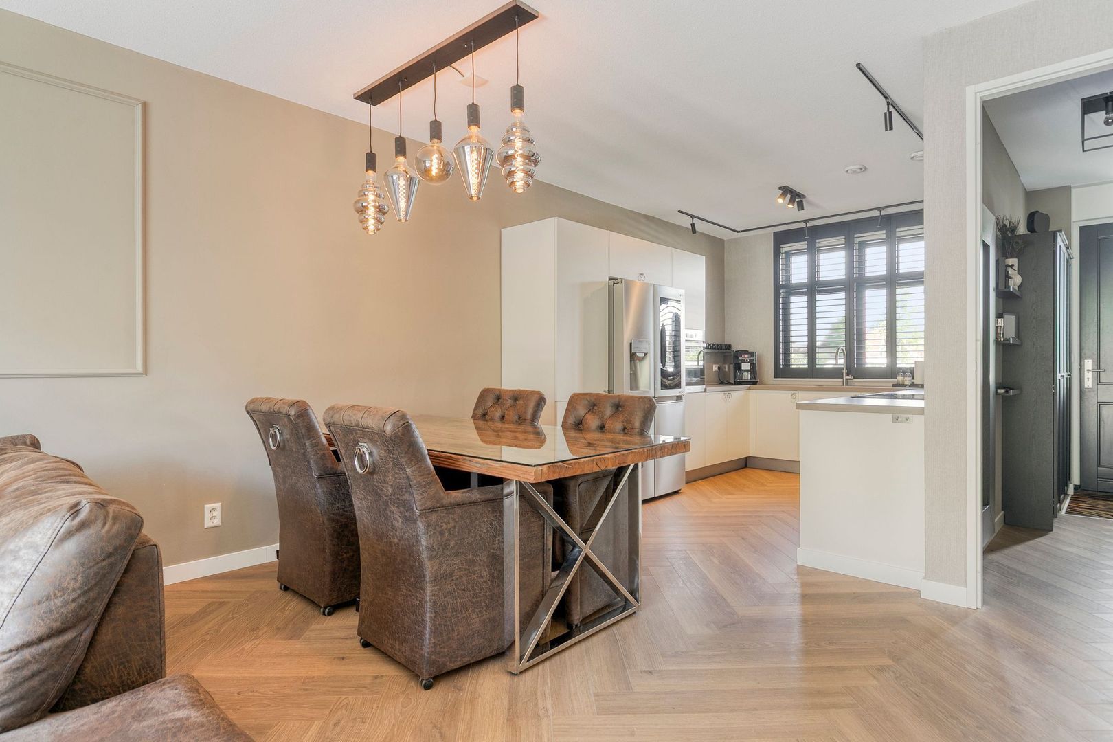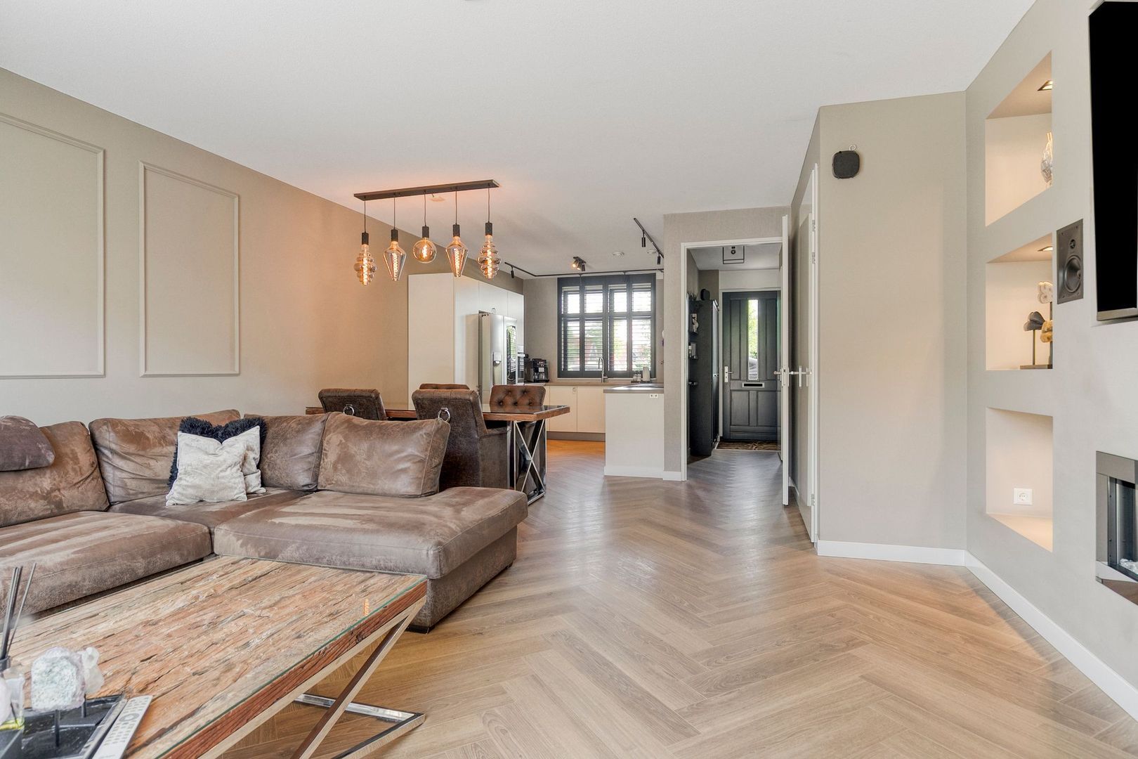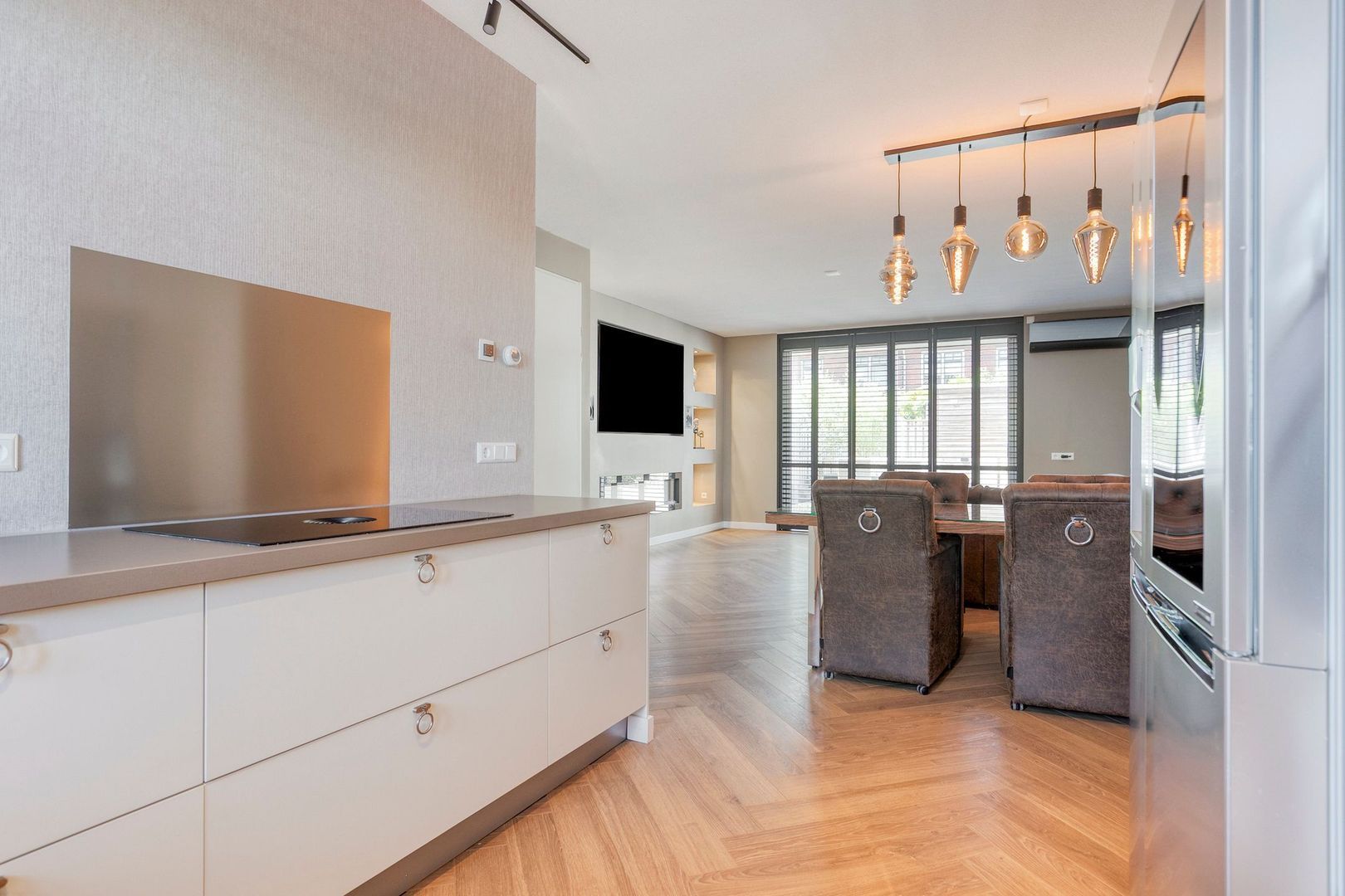 De woonkamer ademt licht en ruimte, met een fraai zicht op de strak aangelegde tuin. Dankzij de vloerverwarming en airconditioning geniet je hier het hele jaar door van een aangenaam binnenklimaat. De visgraat laminaatvloer geeft de ruimte een moderne en warme uitstraling.