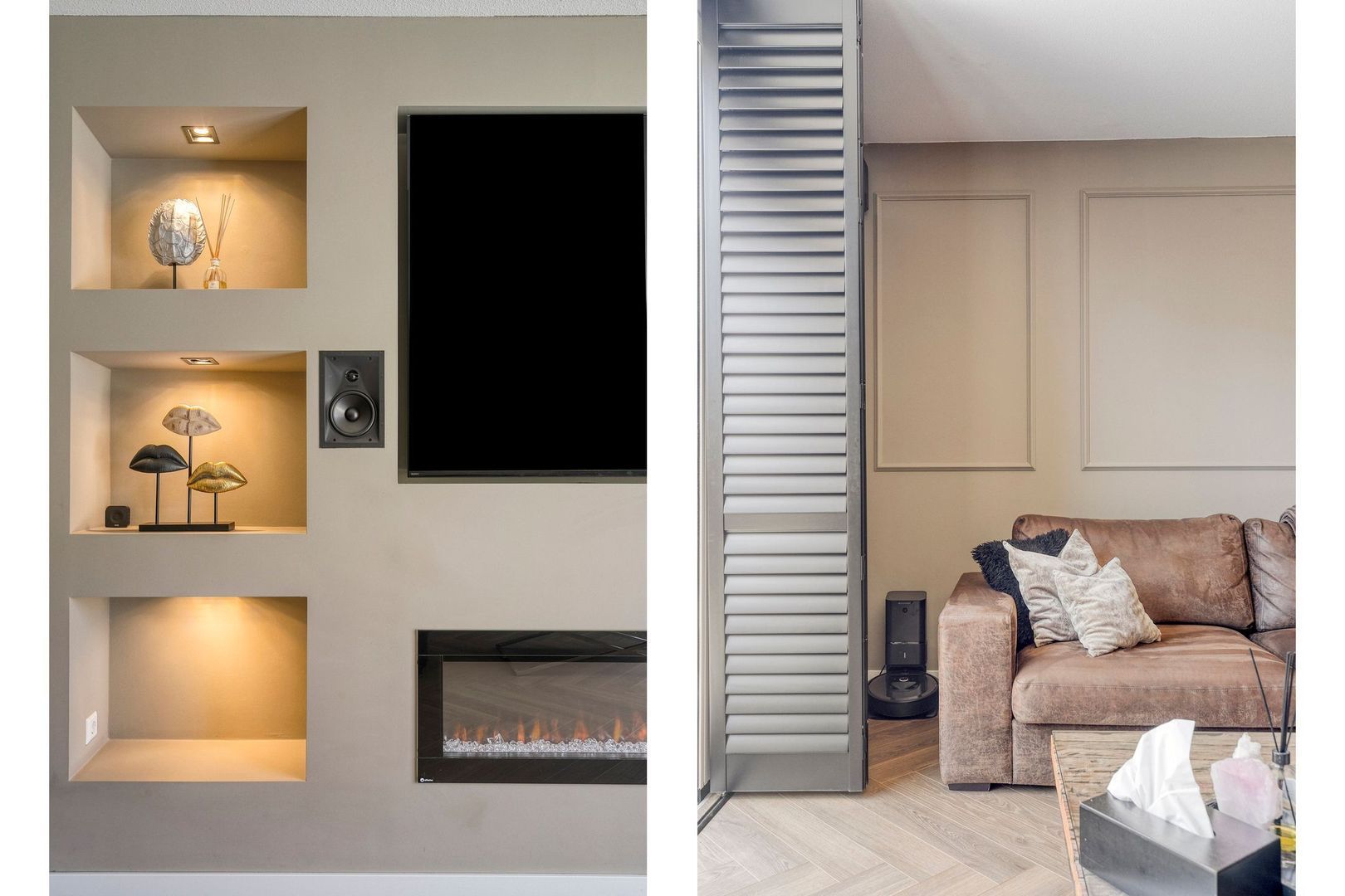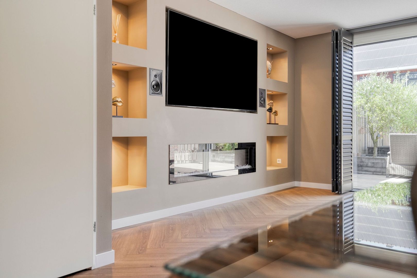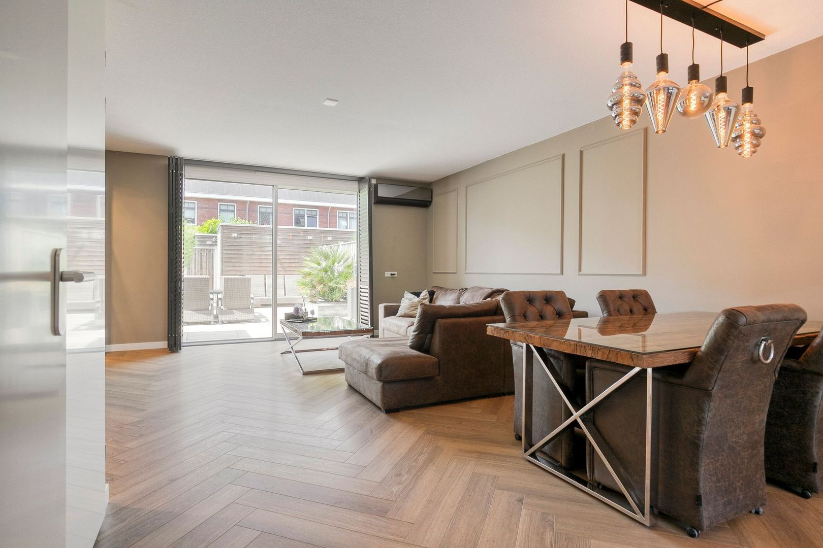 De woonkamer ademt licht en ruimte, met een fraai zicht op de strak aangelegde tuin. Dankzij de vloerverwarming en airconditioning geniet je hier het hele jaar door van een aangenaam binnenklimaat. De visgraat laminaatvloer geeft de ruimte een moderne en warme uitstraling.