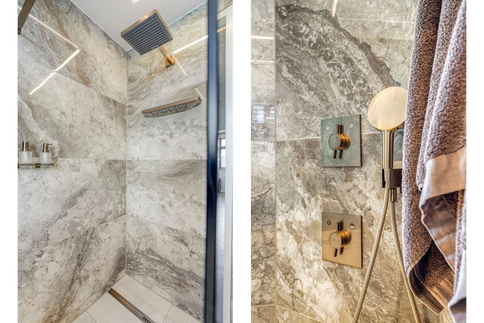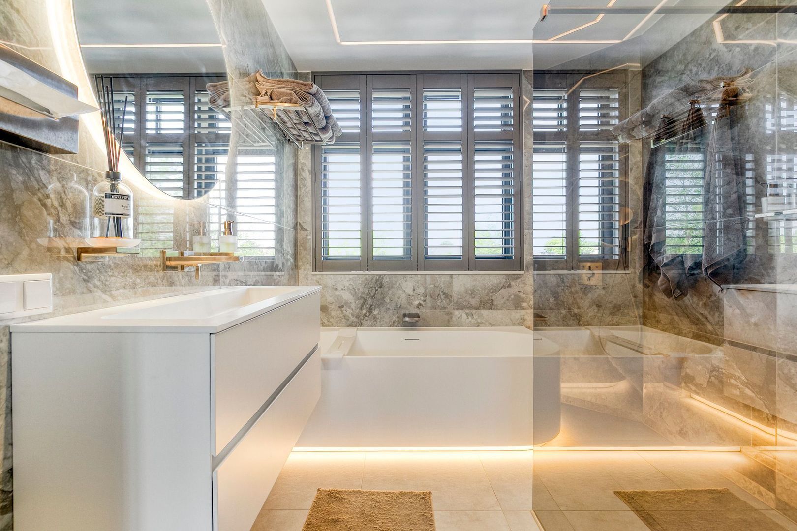 De badkamer is hotel chique, met een luxe whirlpool (voorzien van ledverlichting), sfeervol plafond met ledverlichting, regendouche met extra schouderdouche, elektrische vloerverwarming en een spiegel met verwarming, bluetoothspeakers en verlichting, een plek om elke dag te ontspannen.
